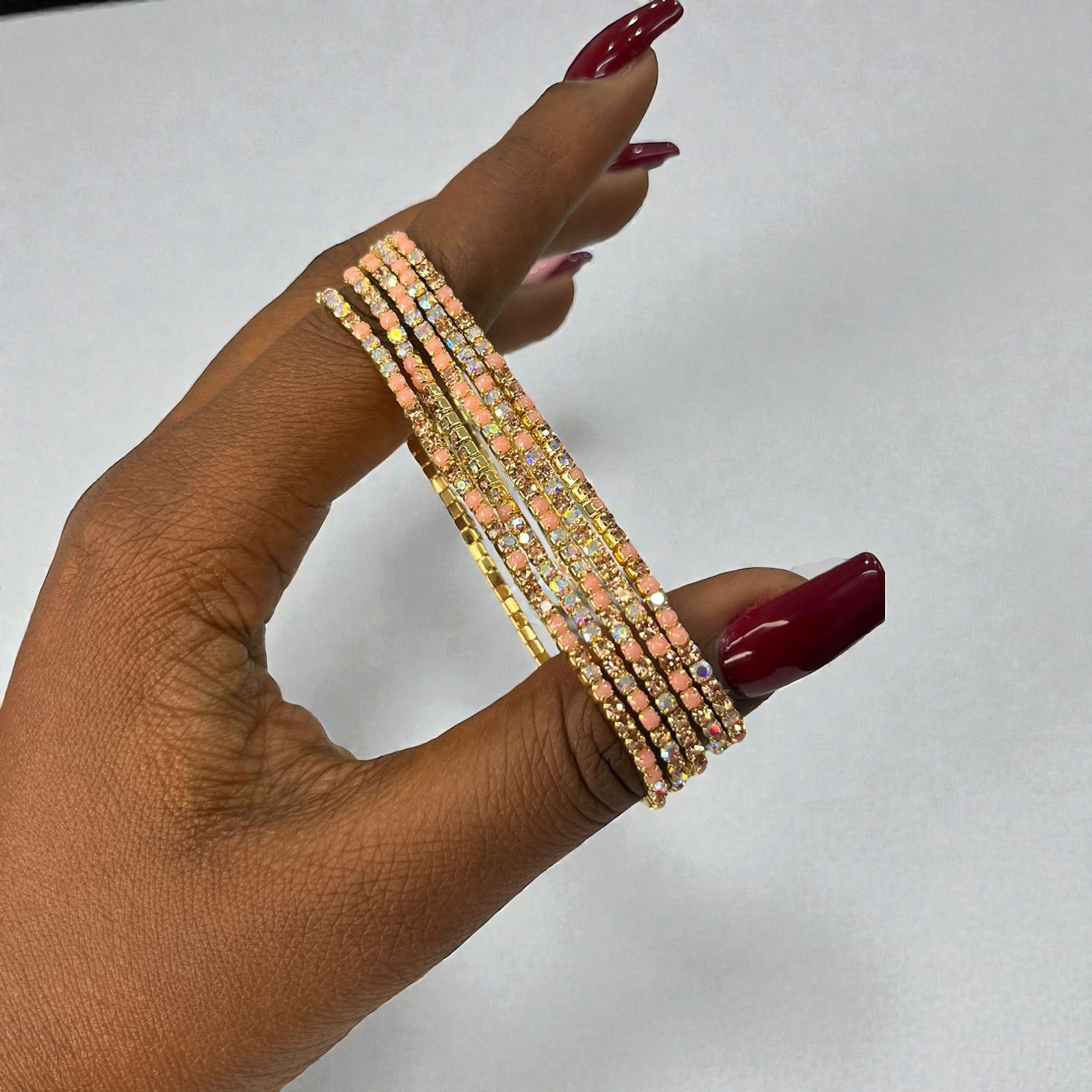 These are a set of five stretch bracelets feauturing iridescent ab crystal rhinestones and glass beads designed to catch the light.