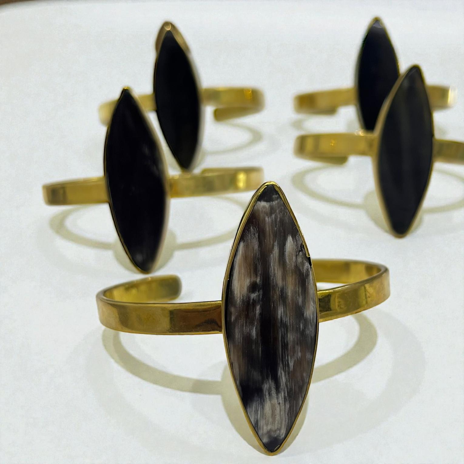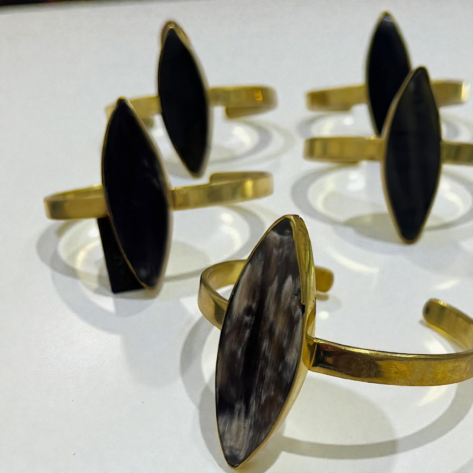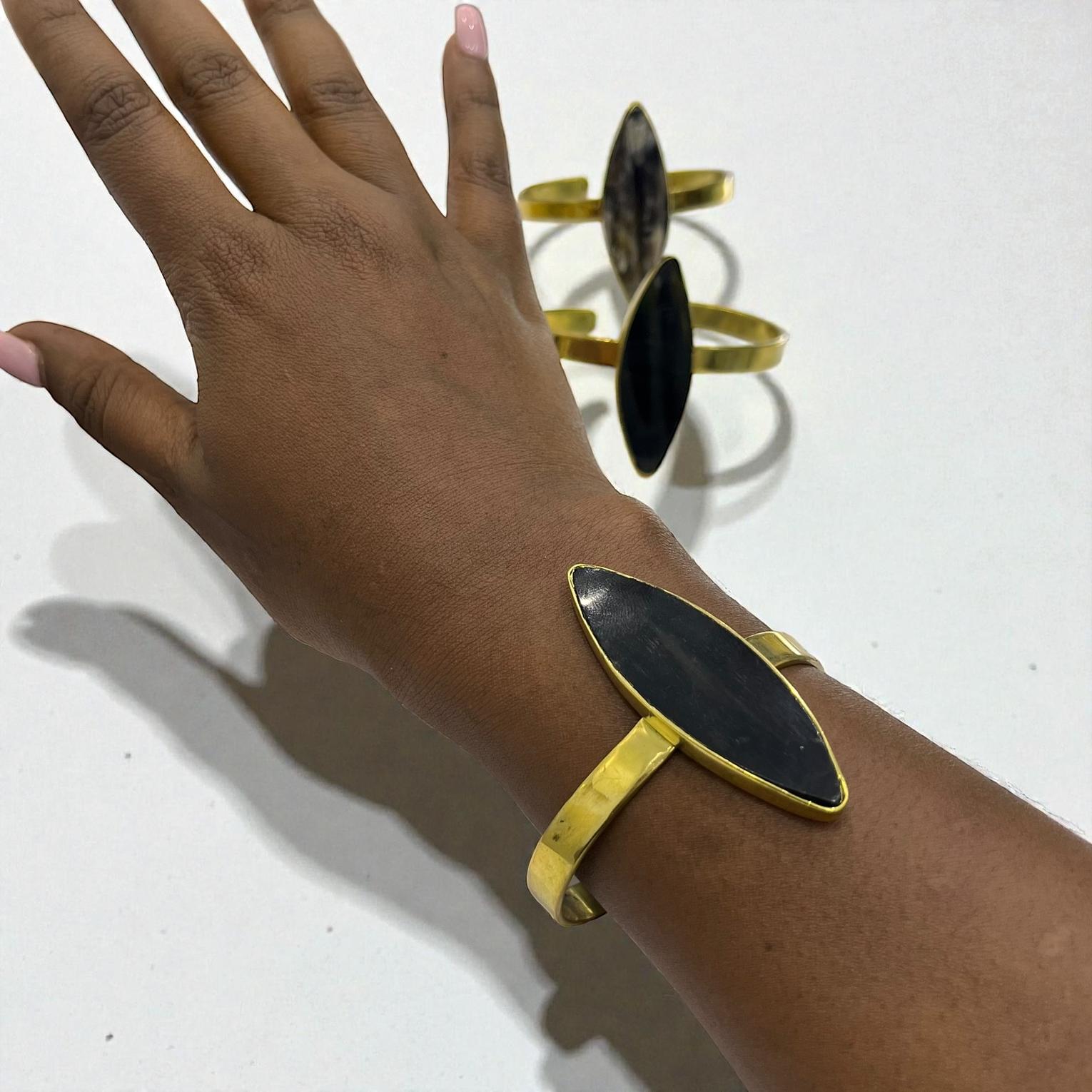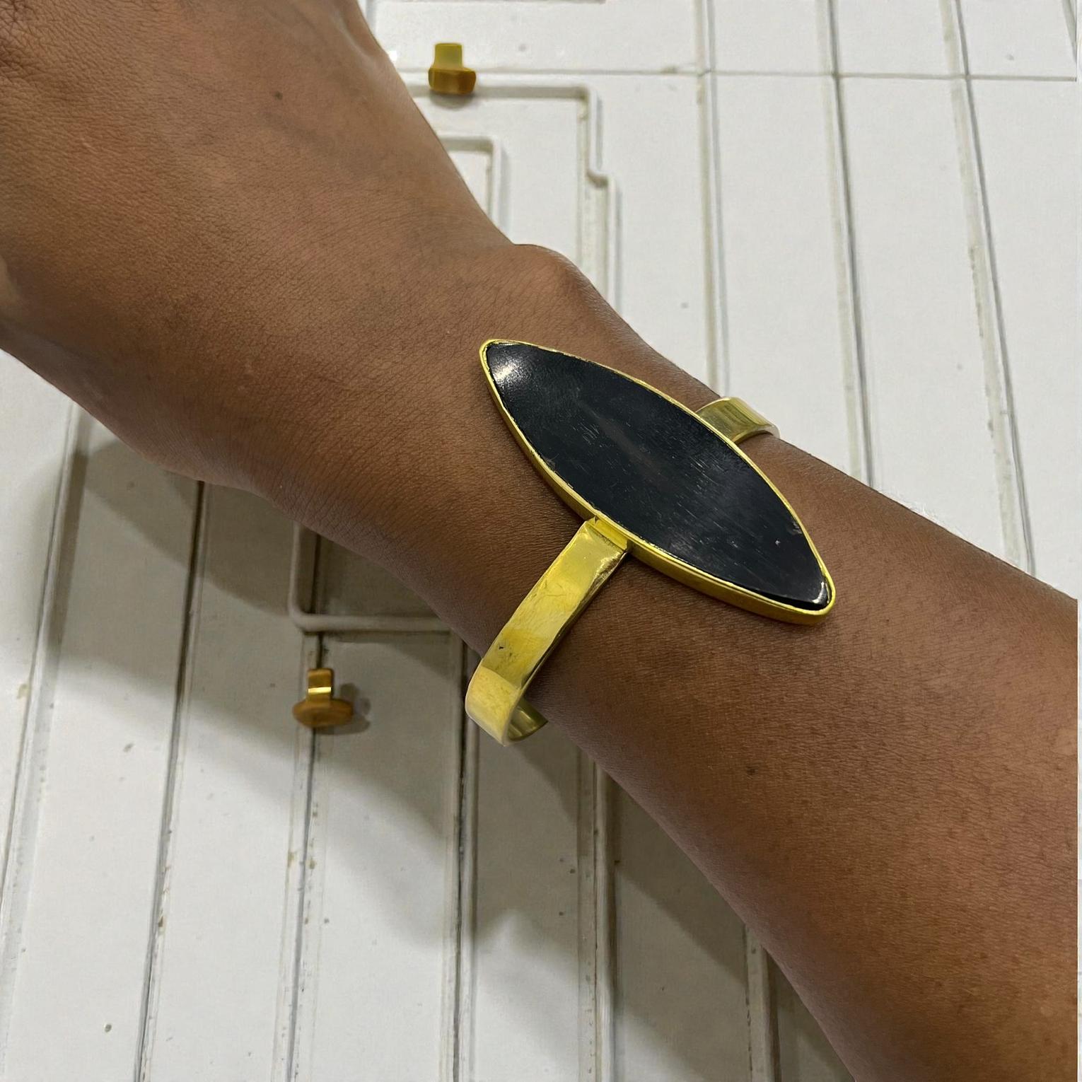 This is an adjustable brass cuff bracelet featuring a black,oval-shaped center stone,handcrafted in Kenya.