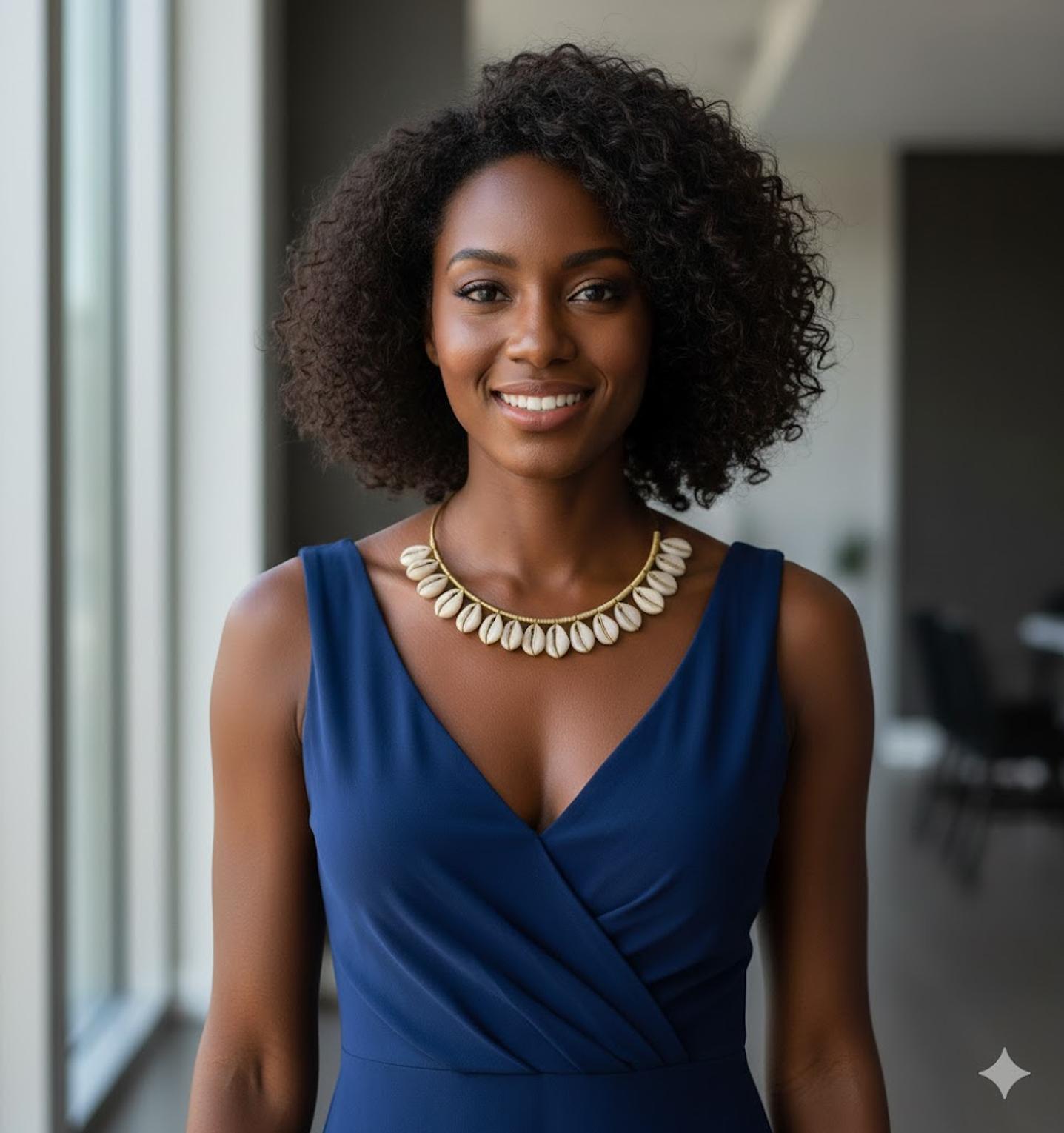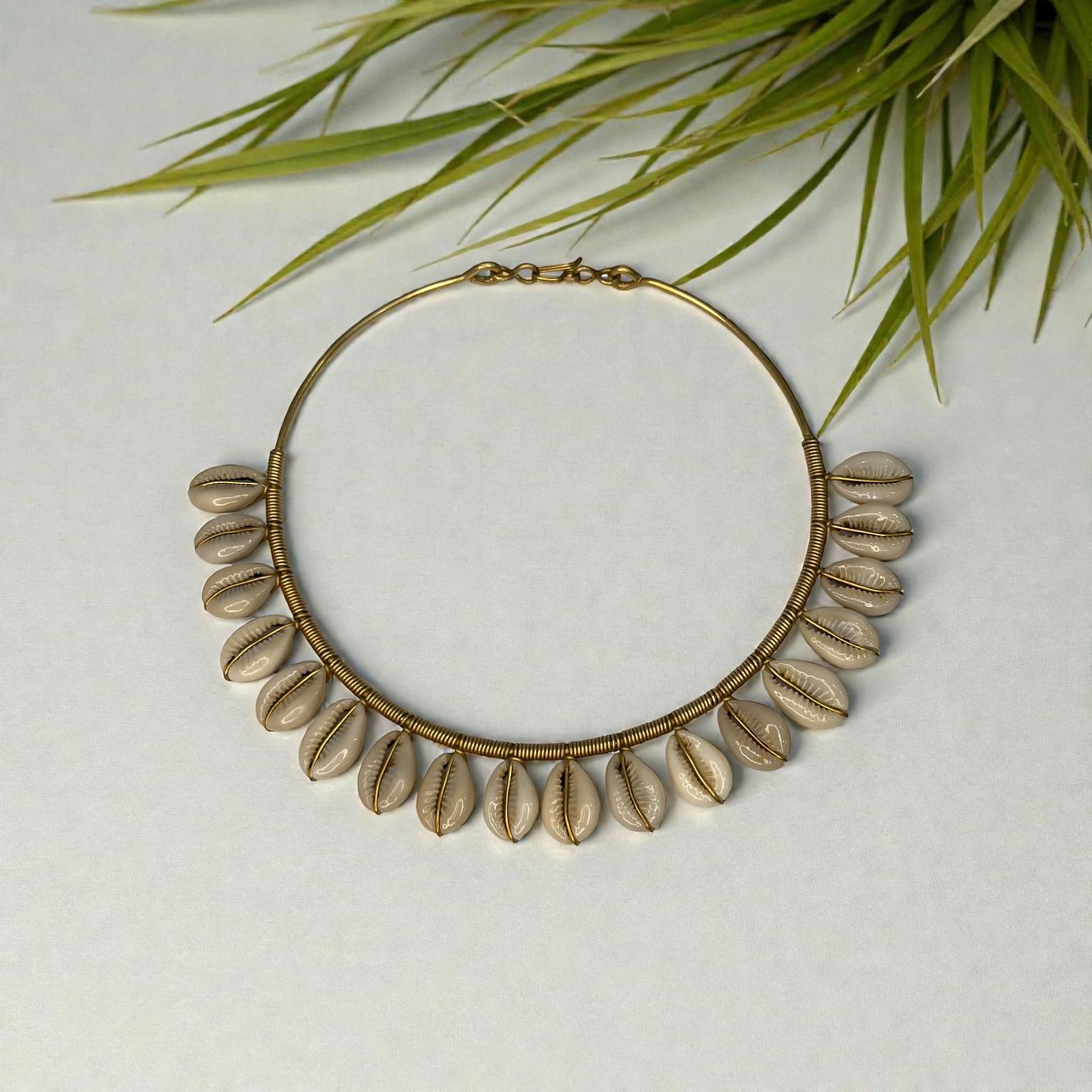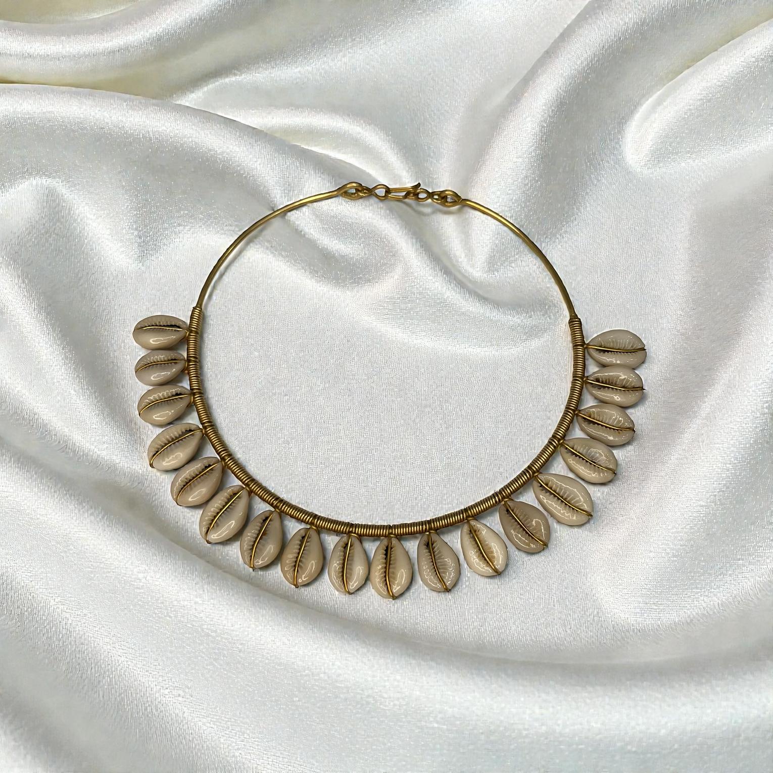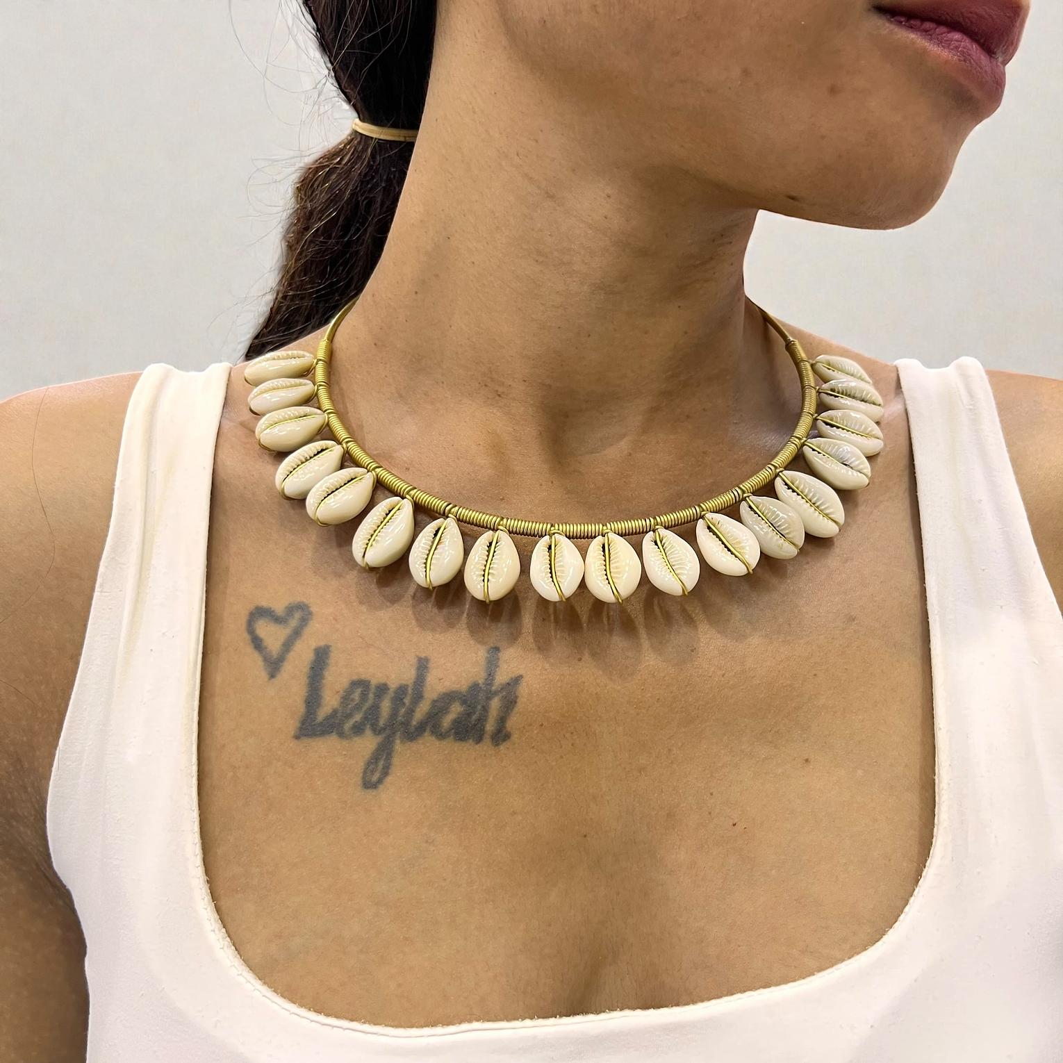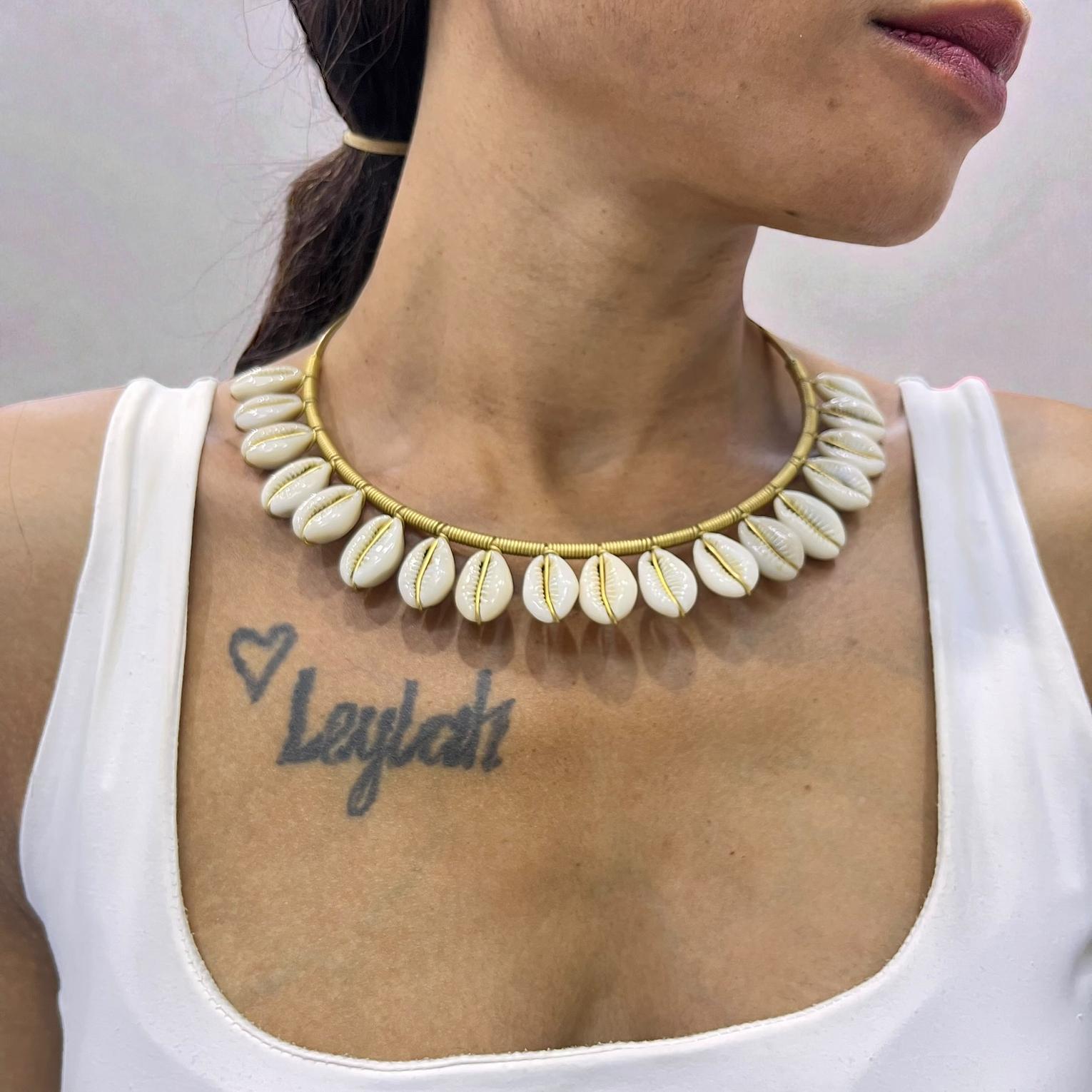This is a boho cowrieshell choker featuring natural cowrie shells strung along a sleek gold-toned wire.