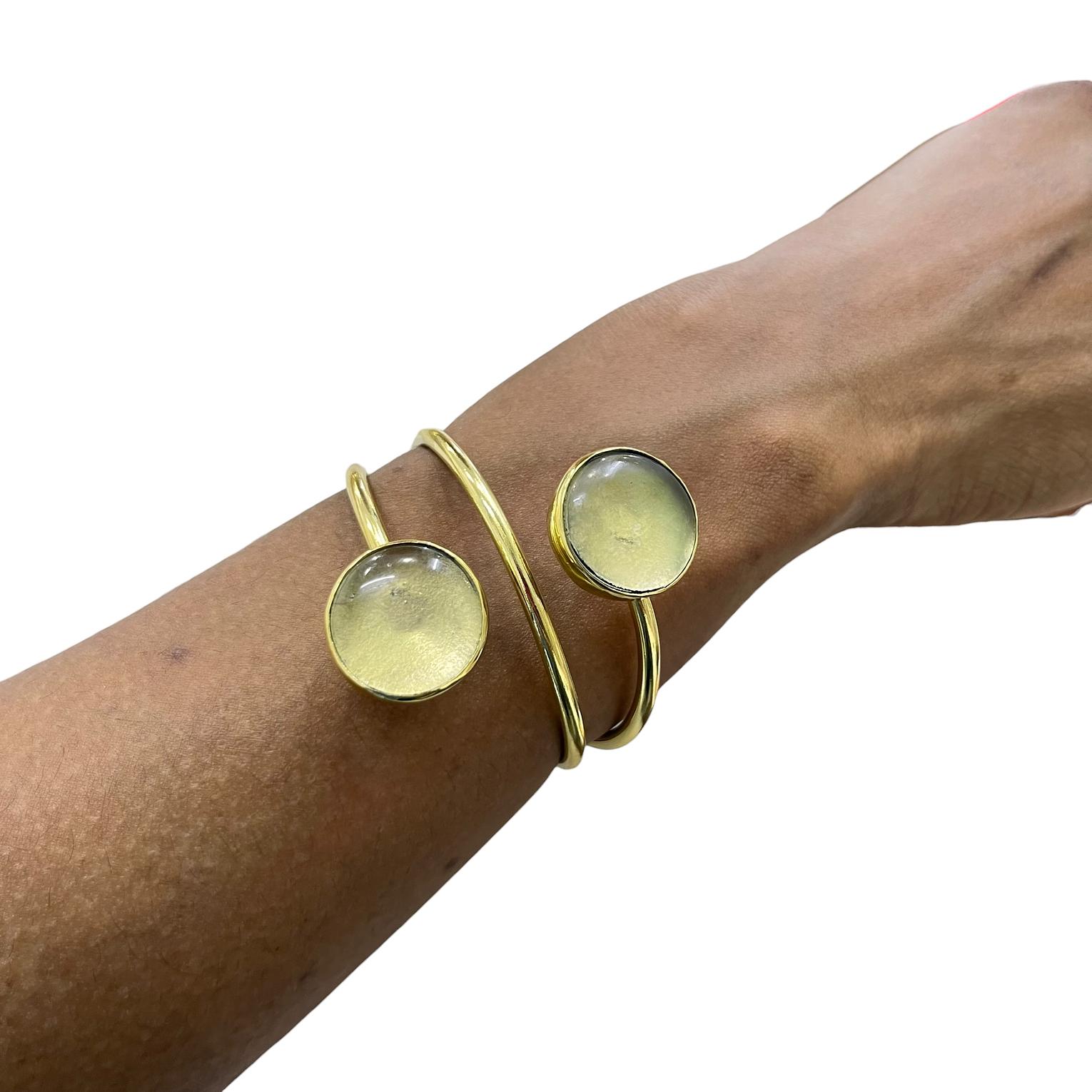 Bypass bracelet is a cuff design with circular gemstone or decorative settings at each end.