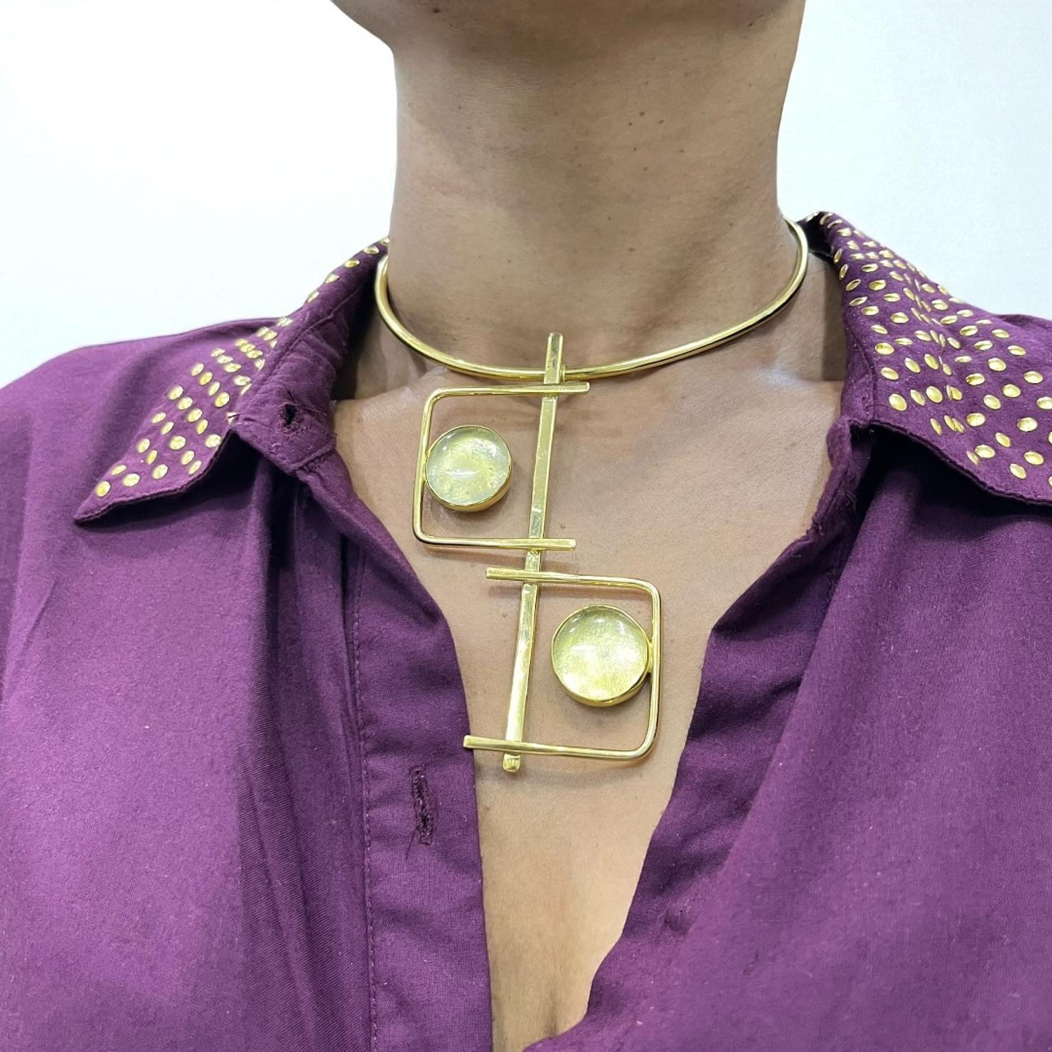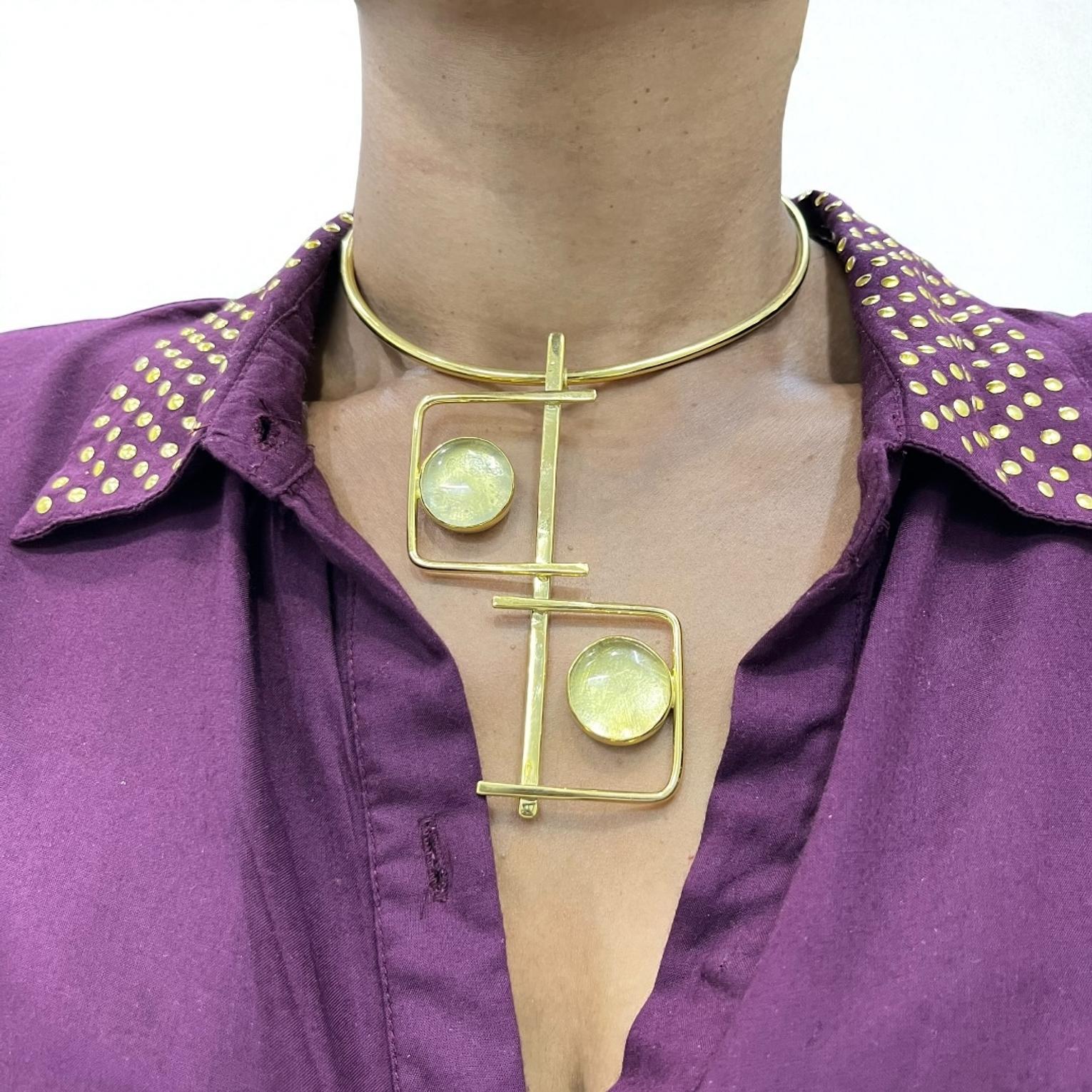 Collar brass choker appears to be a unique,desingner piece likely made of brass with white stone or glass bead elements.