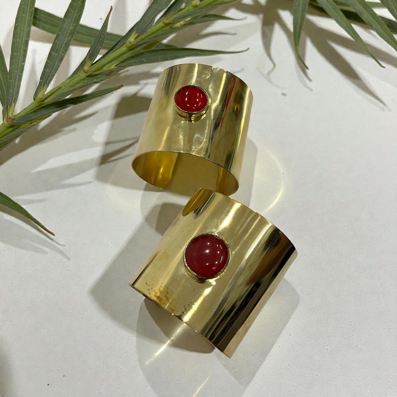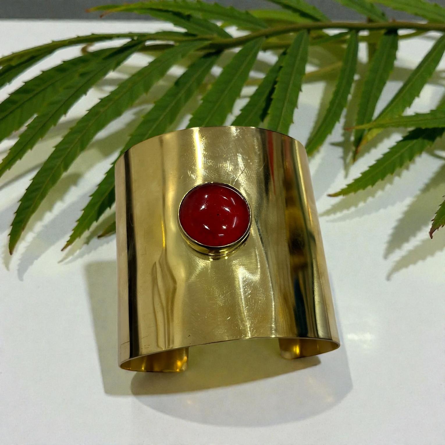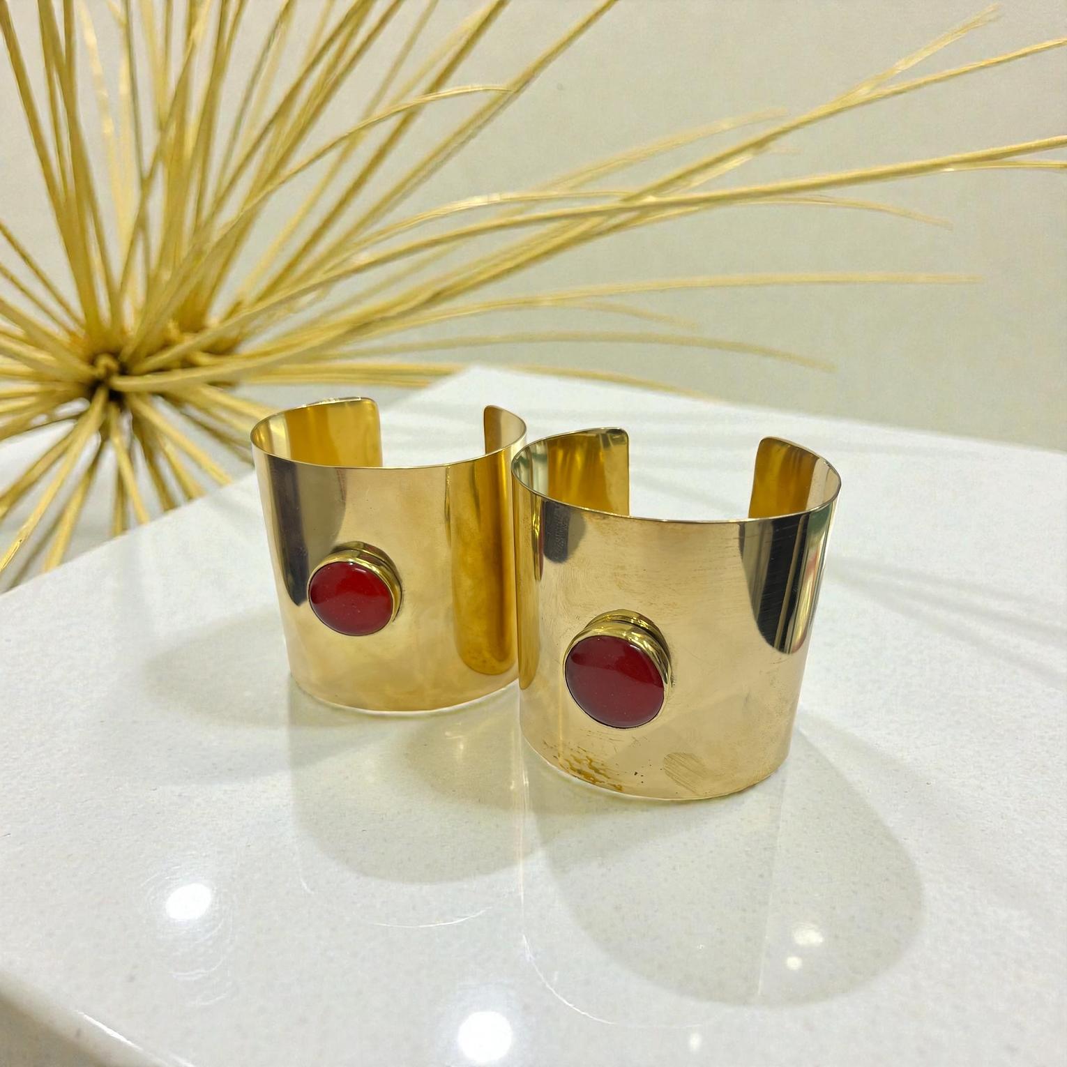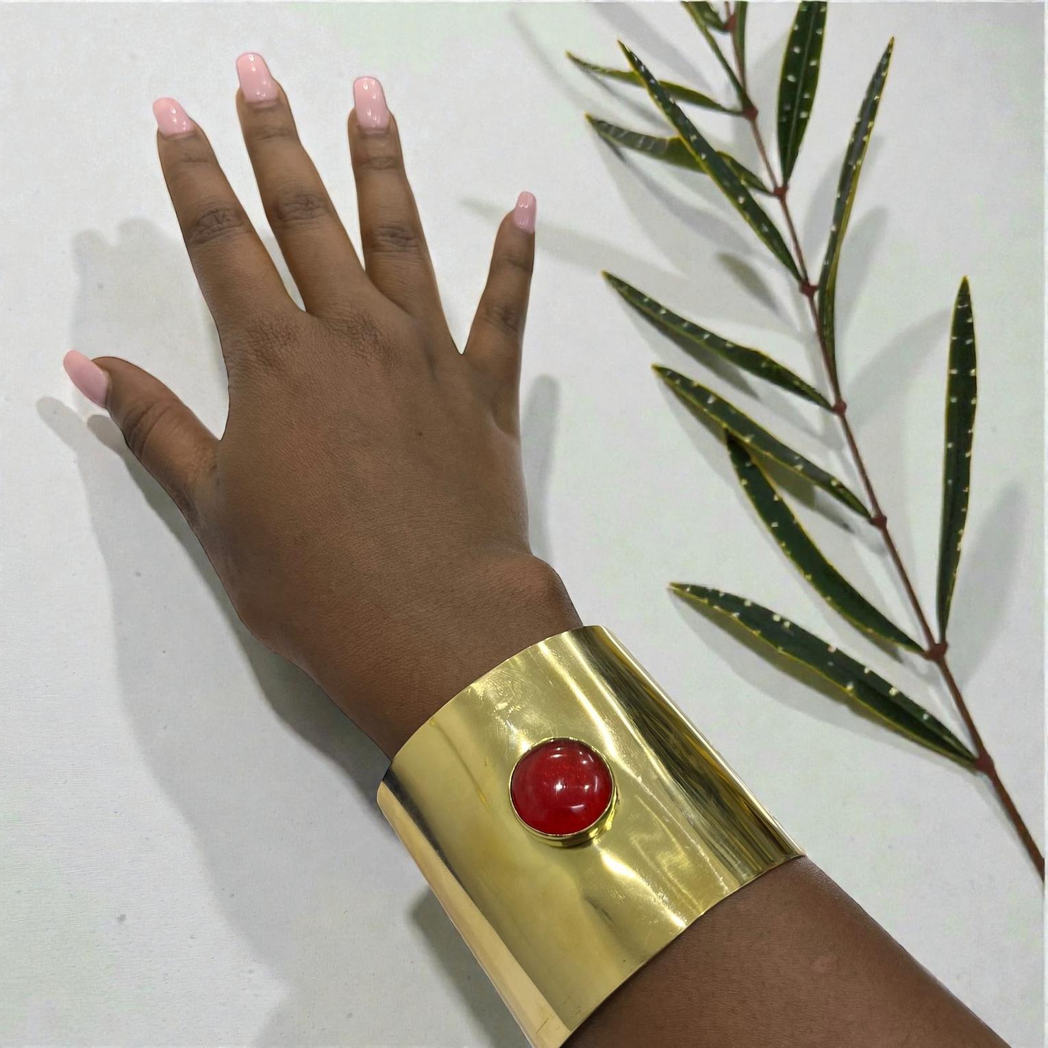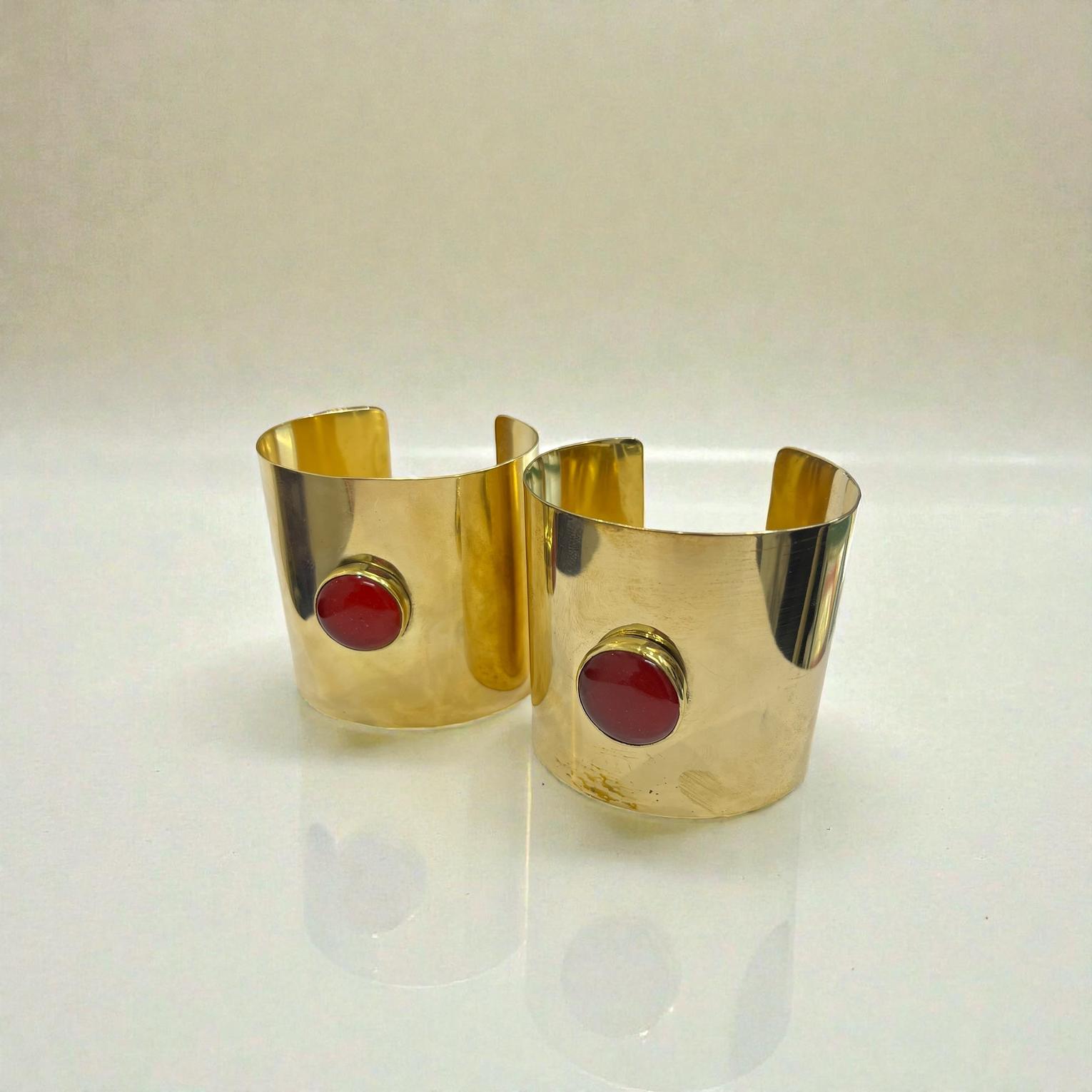 The bracelete is characterized by a wide polished metal cuff in a gold tone,consistent with the modernist or brutalist style popular in the 1970s.