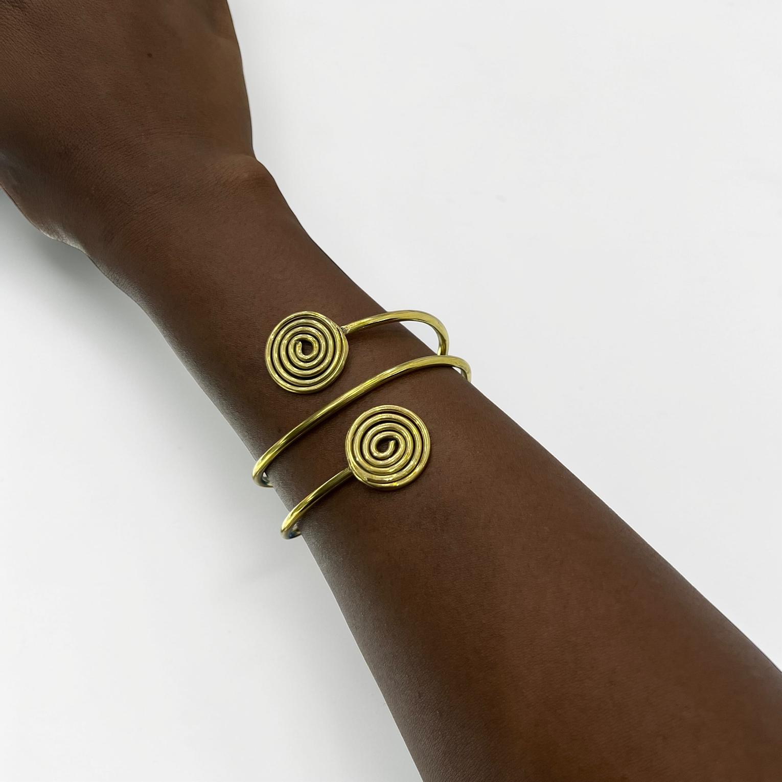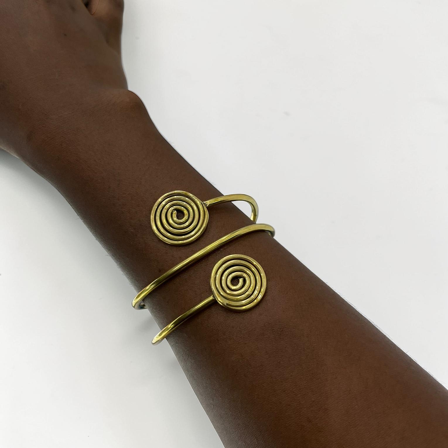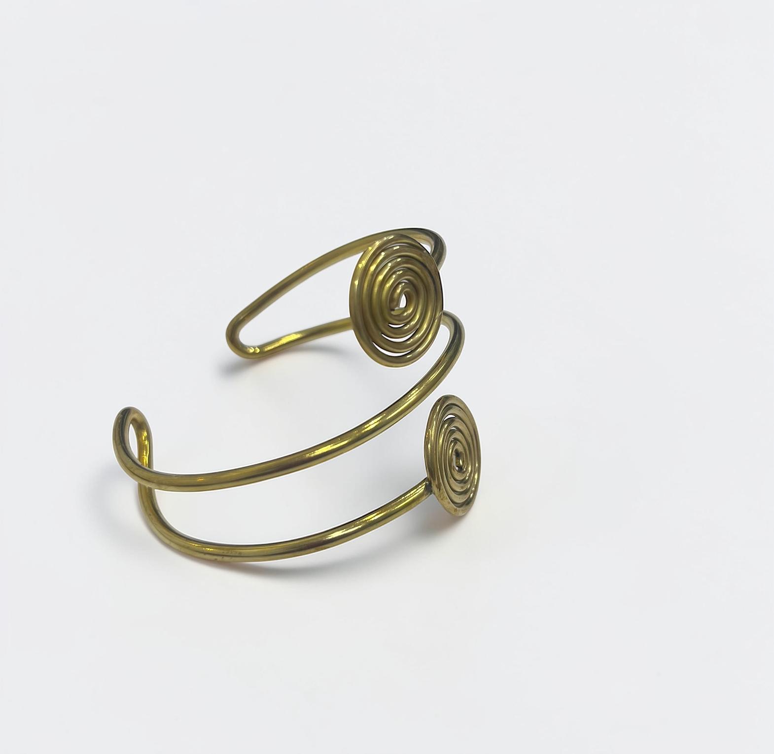 The style piece is a Double Spiral Arm Cuff,a popular accessory often handcrafted from brass or gold-plated metal.Its adjustable and minimalist design.