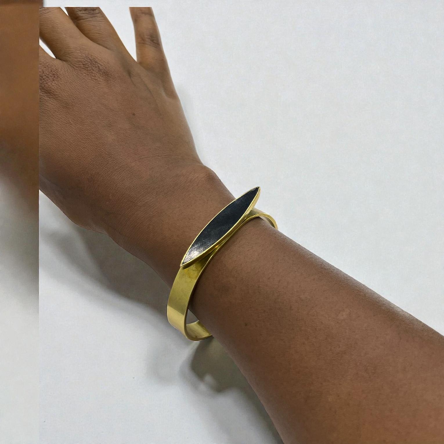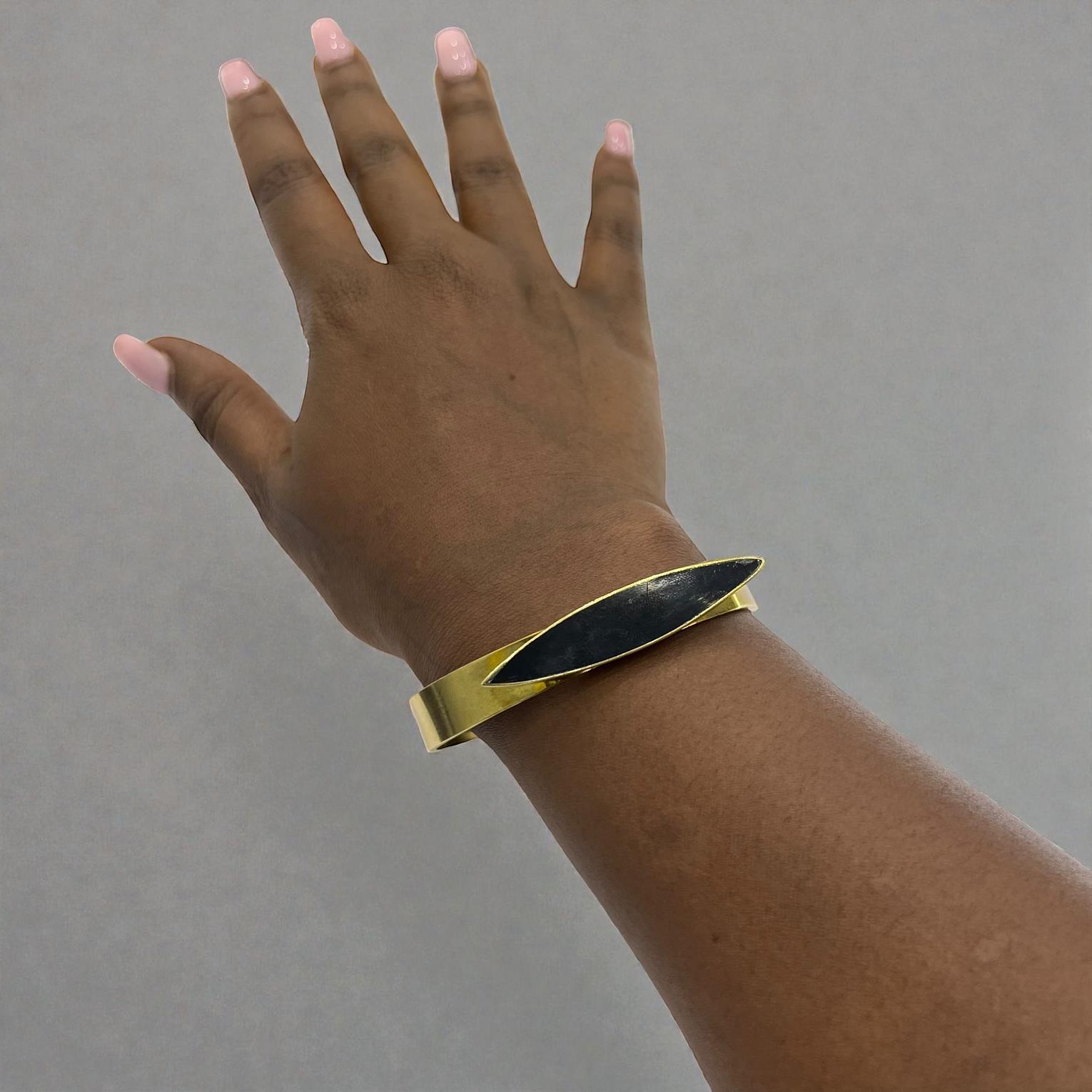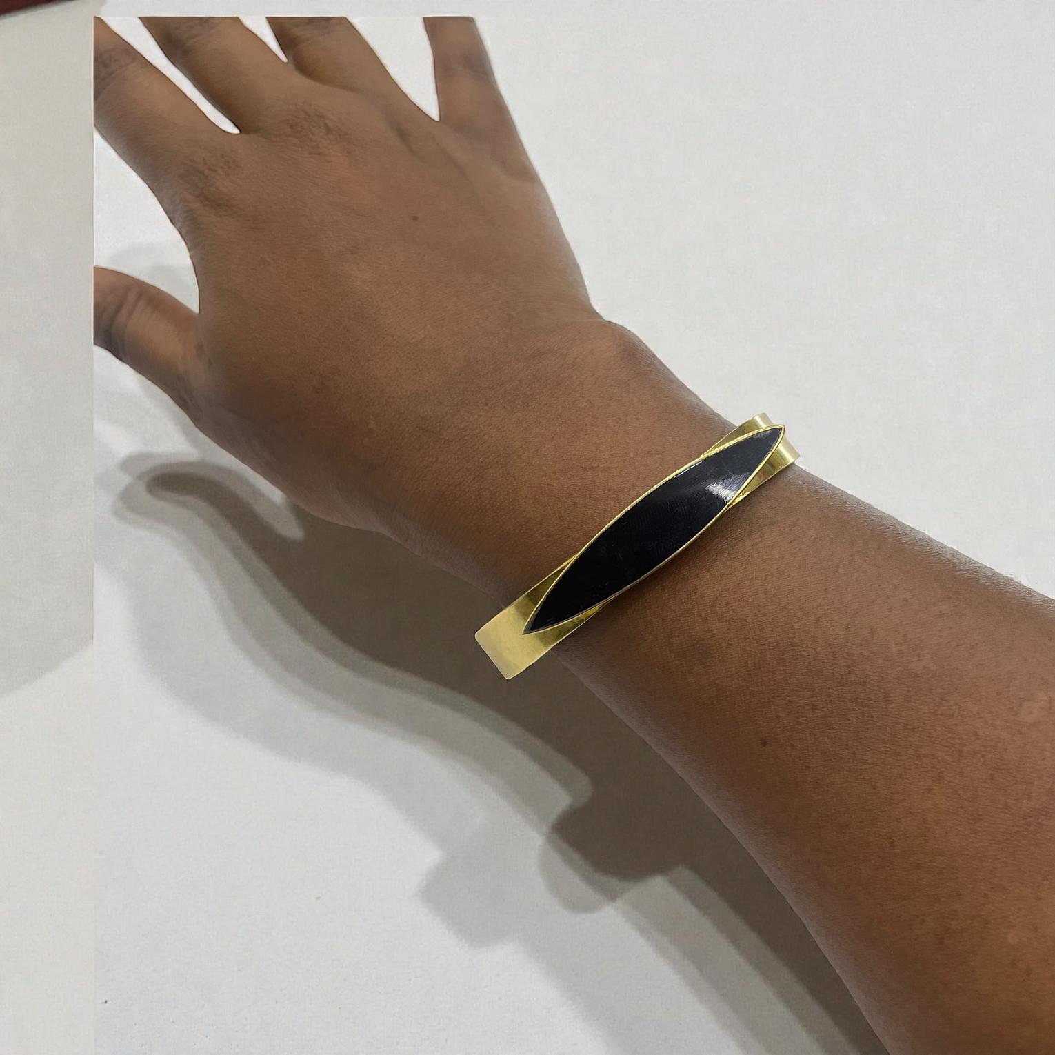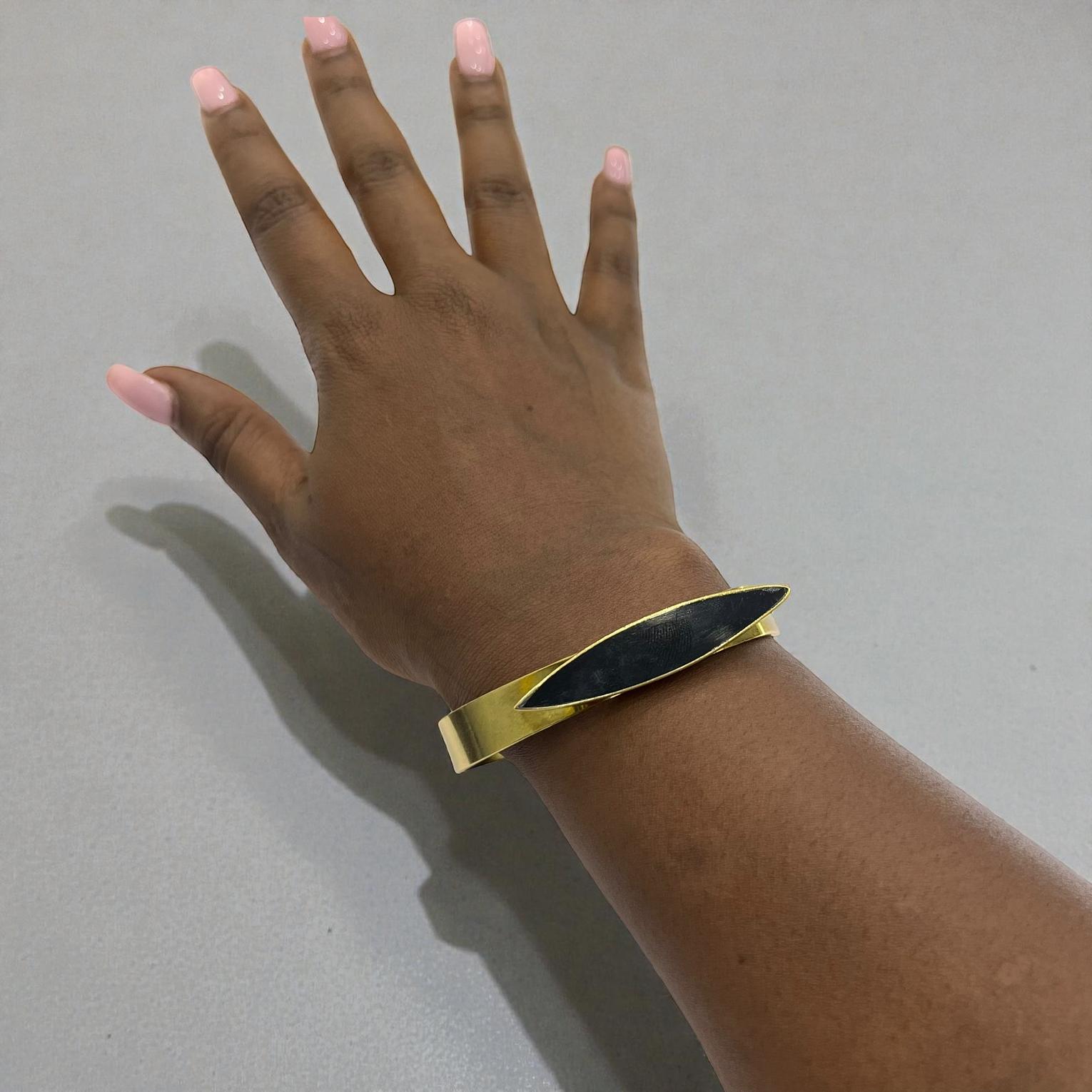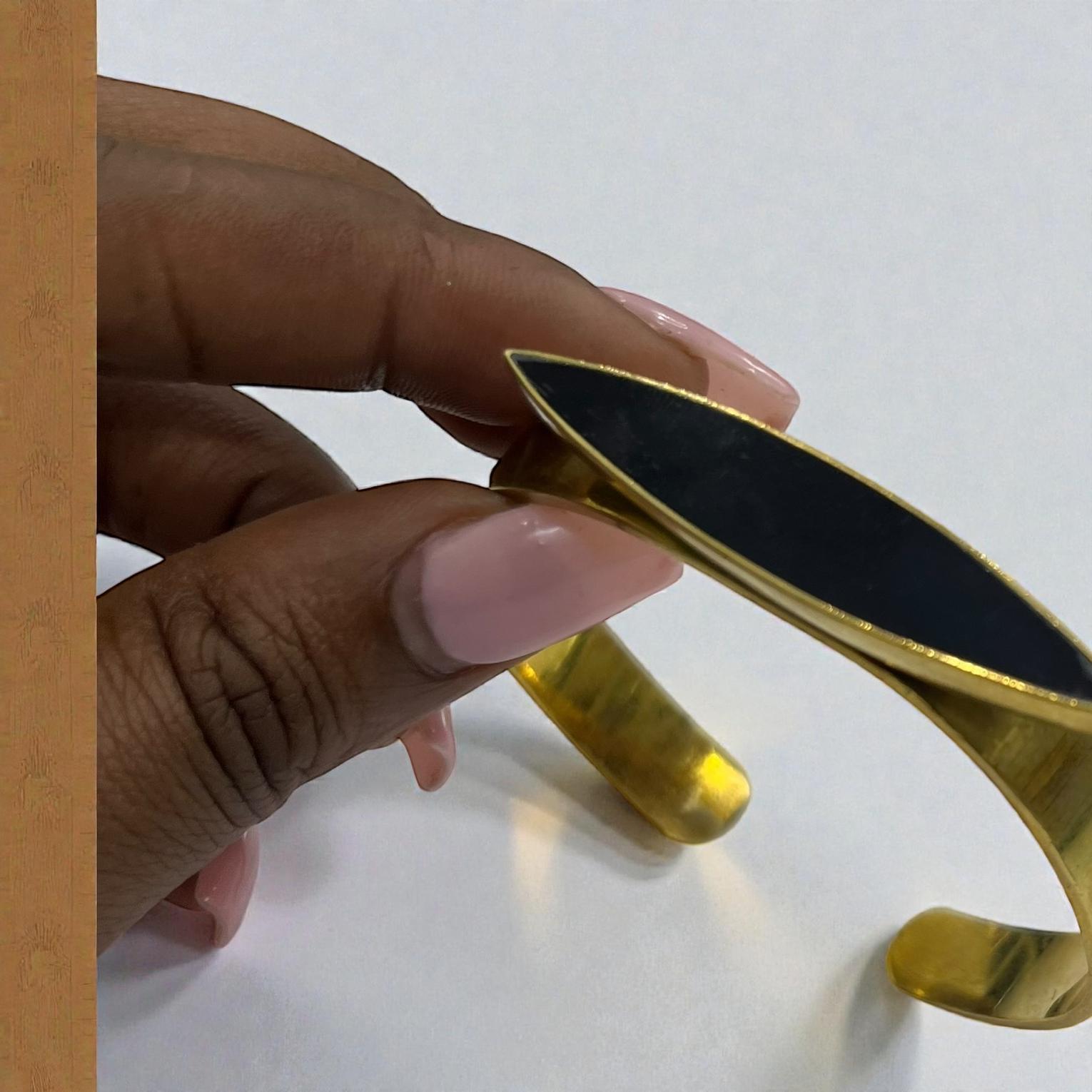 It is described as brass cuff bracelete featuring a sleek;eye-catching black bone inlay shaped in delicate crescent.