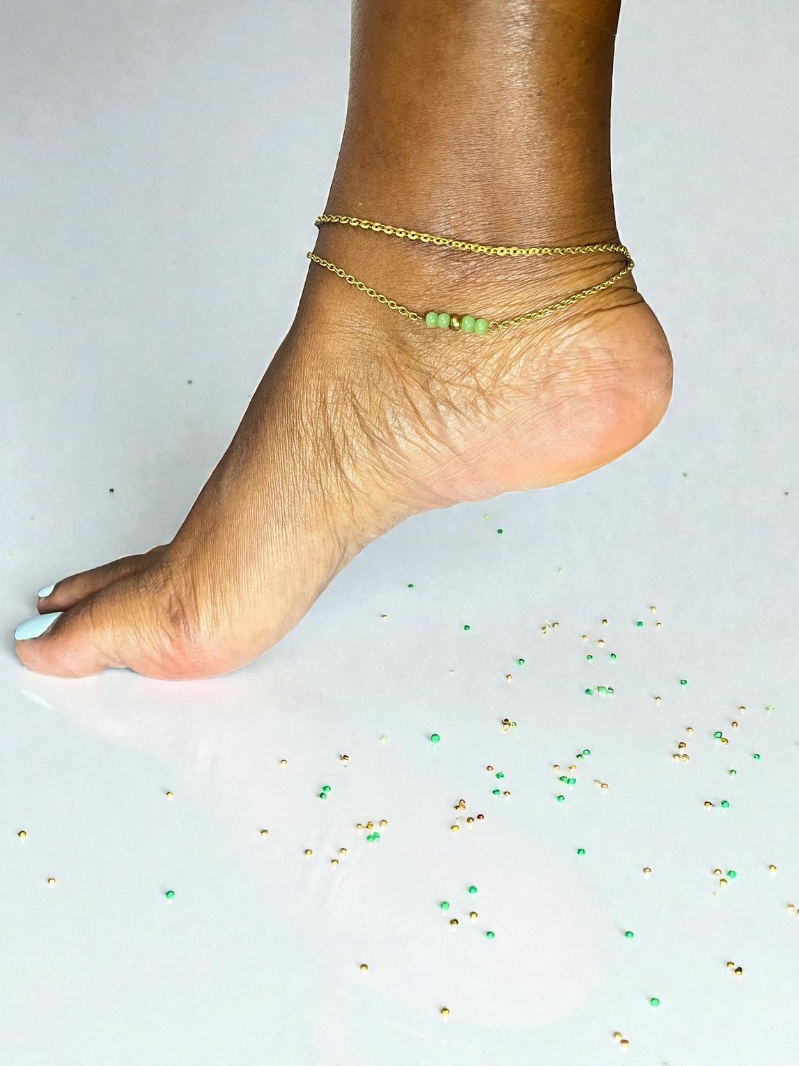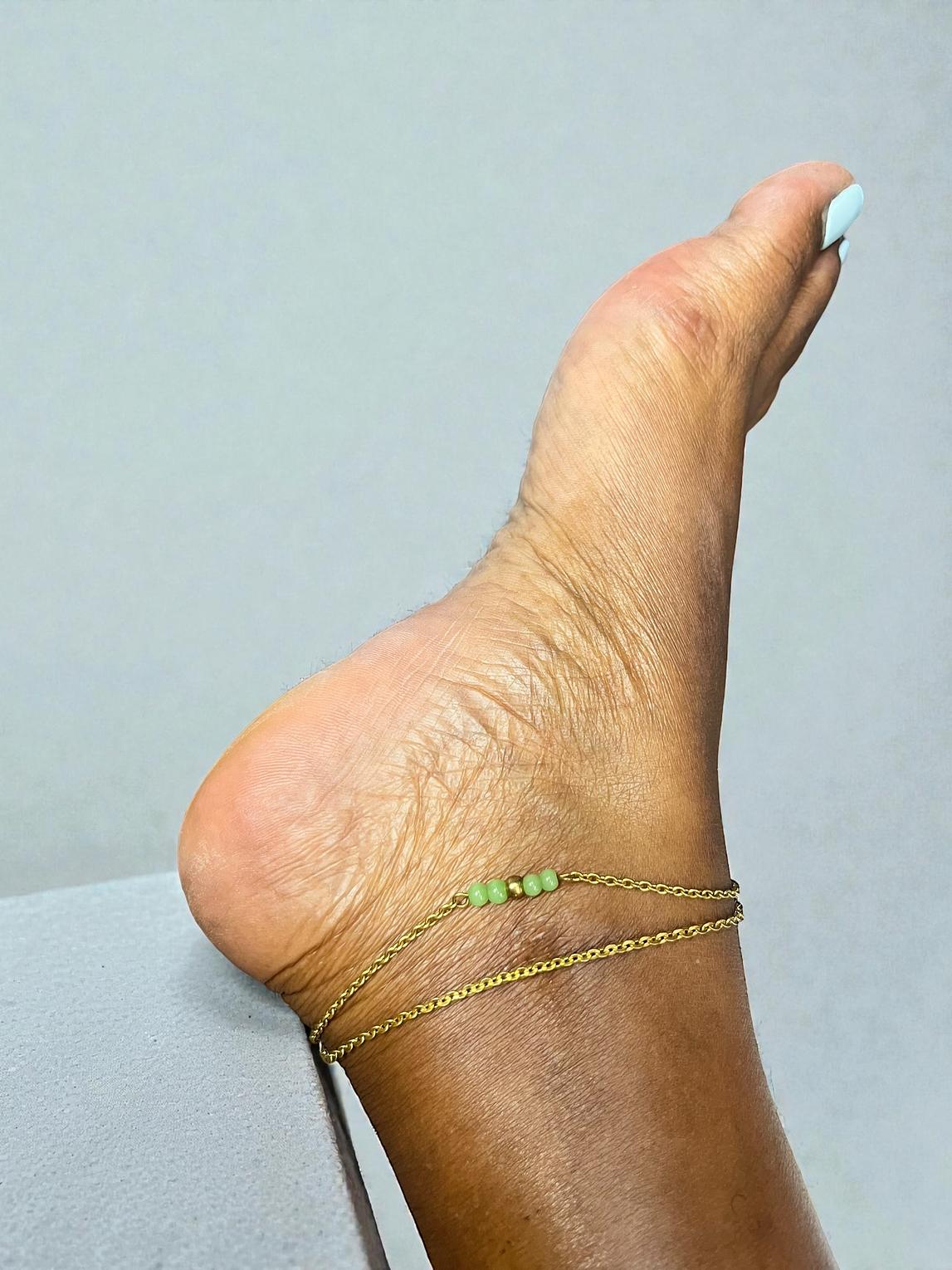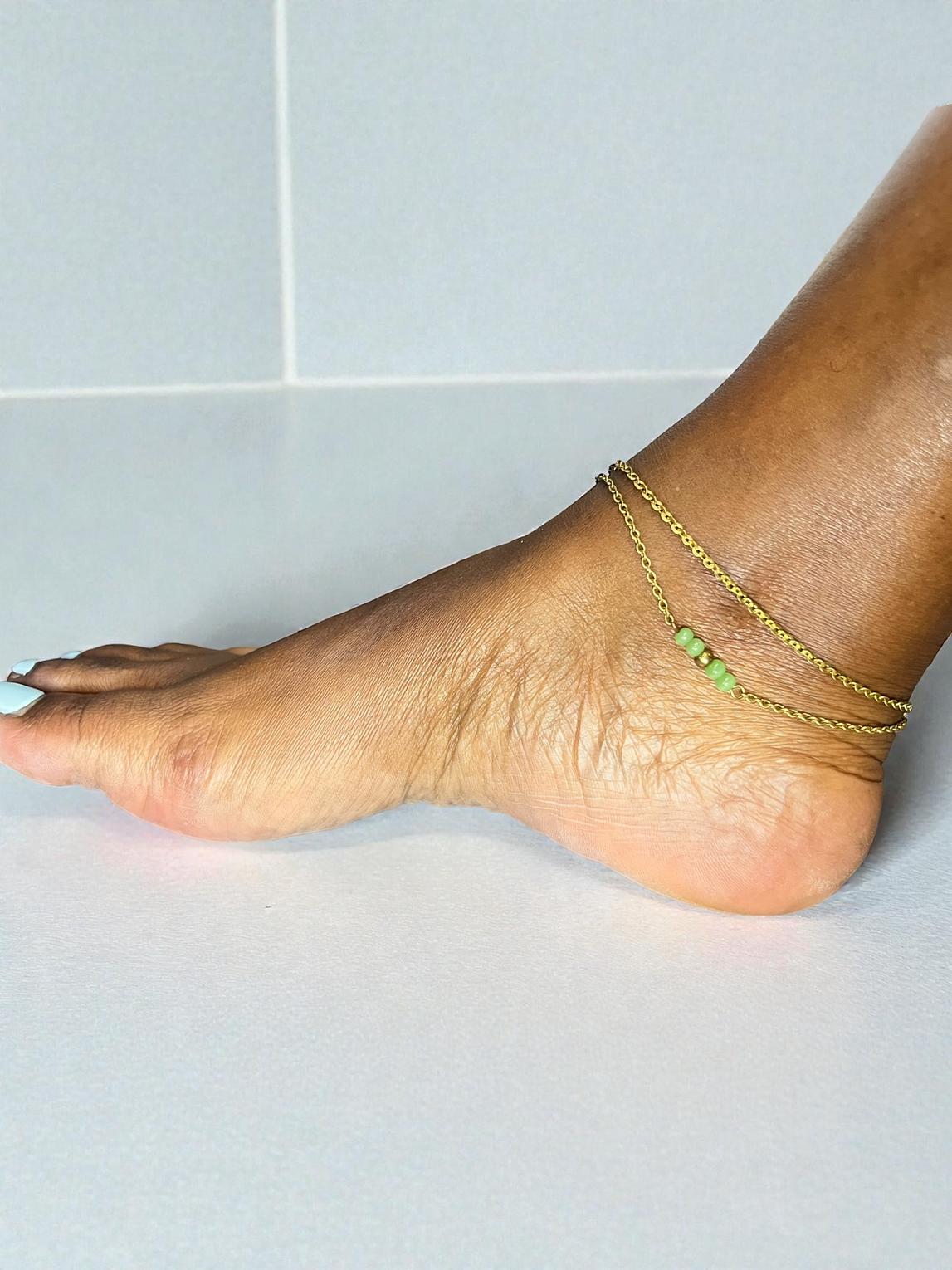 The piece appears to be a double-layered anklet.one layer consists of a simple chain,while the other features a central bar of three or four green beads