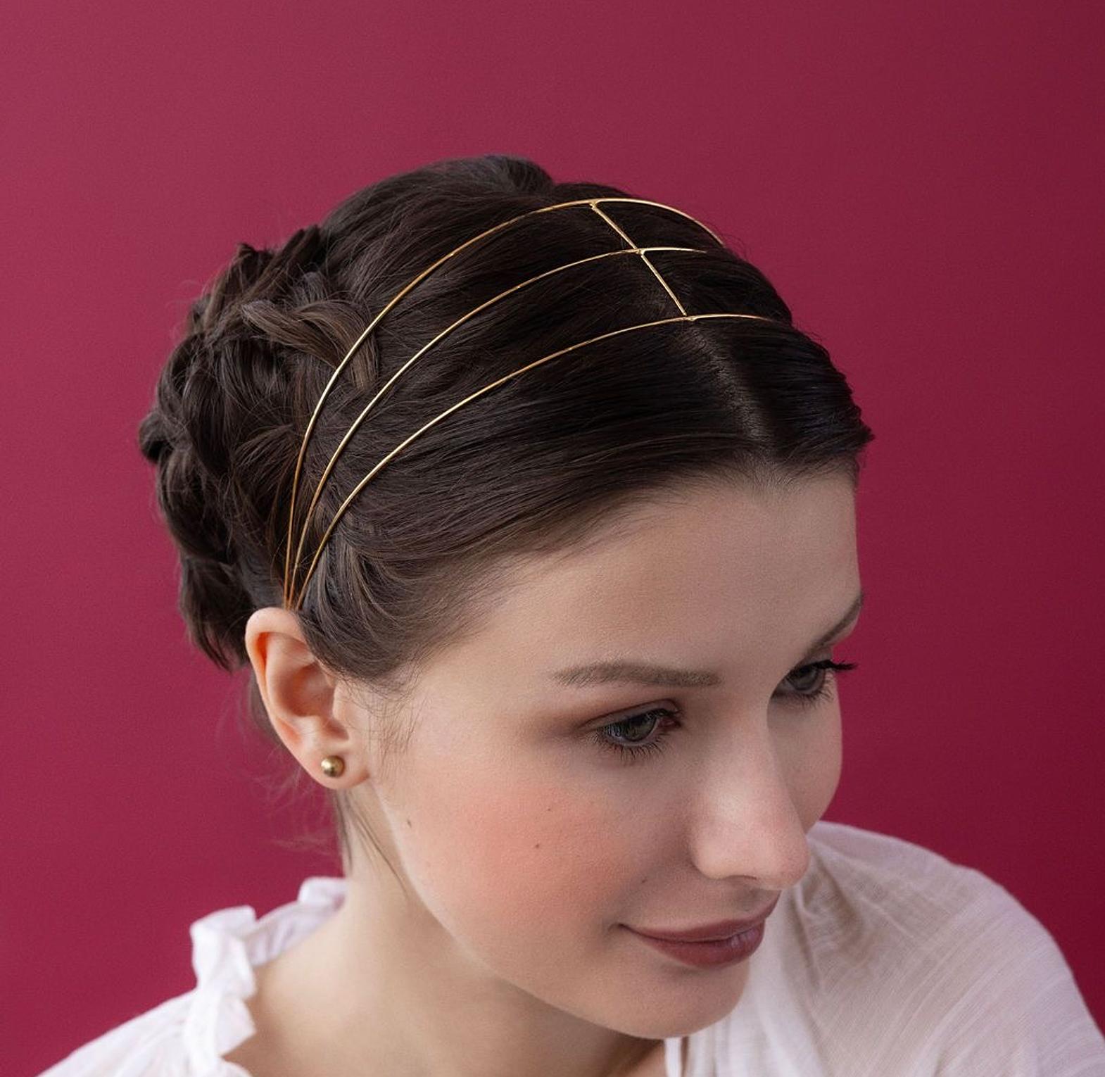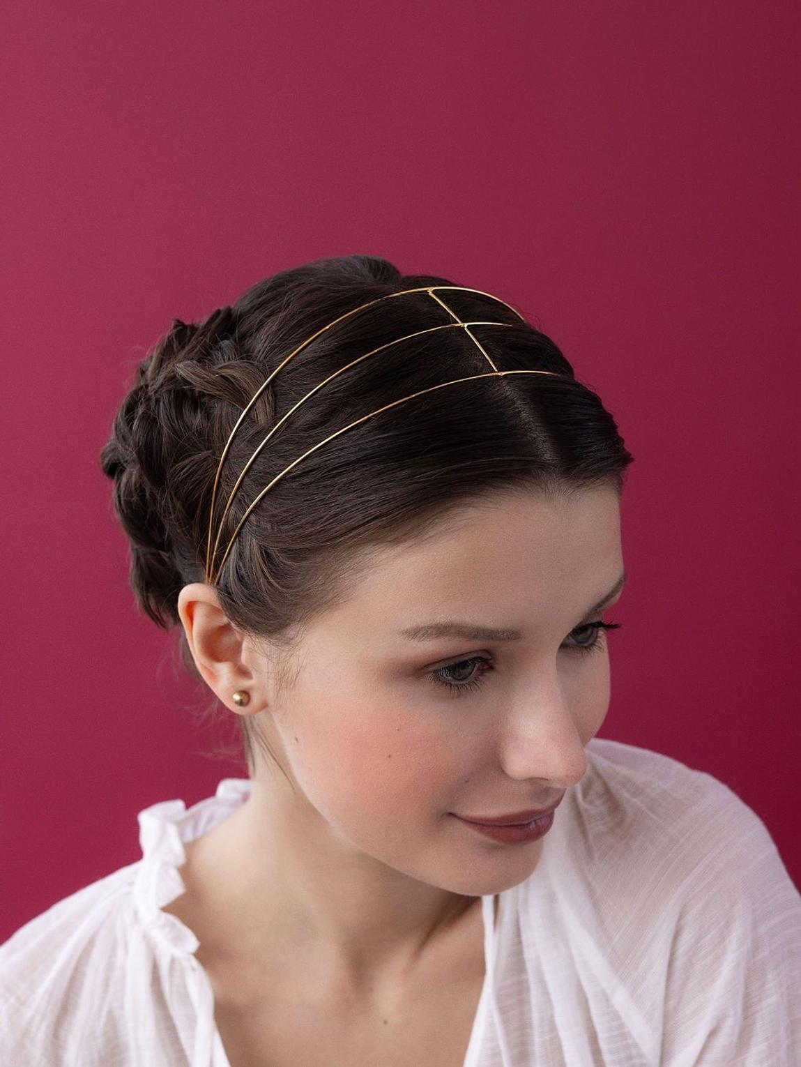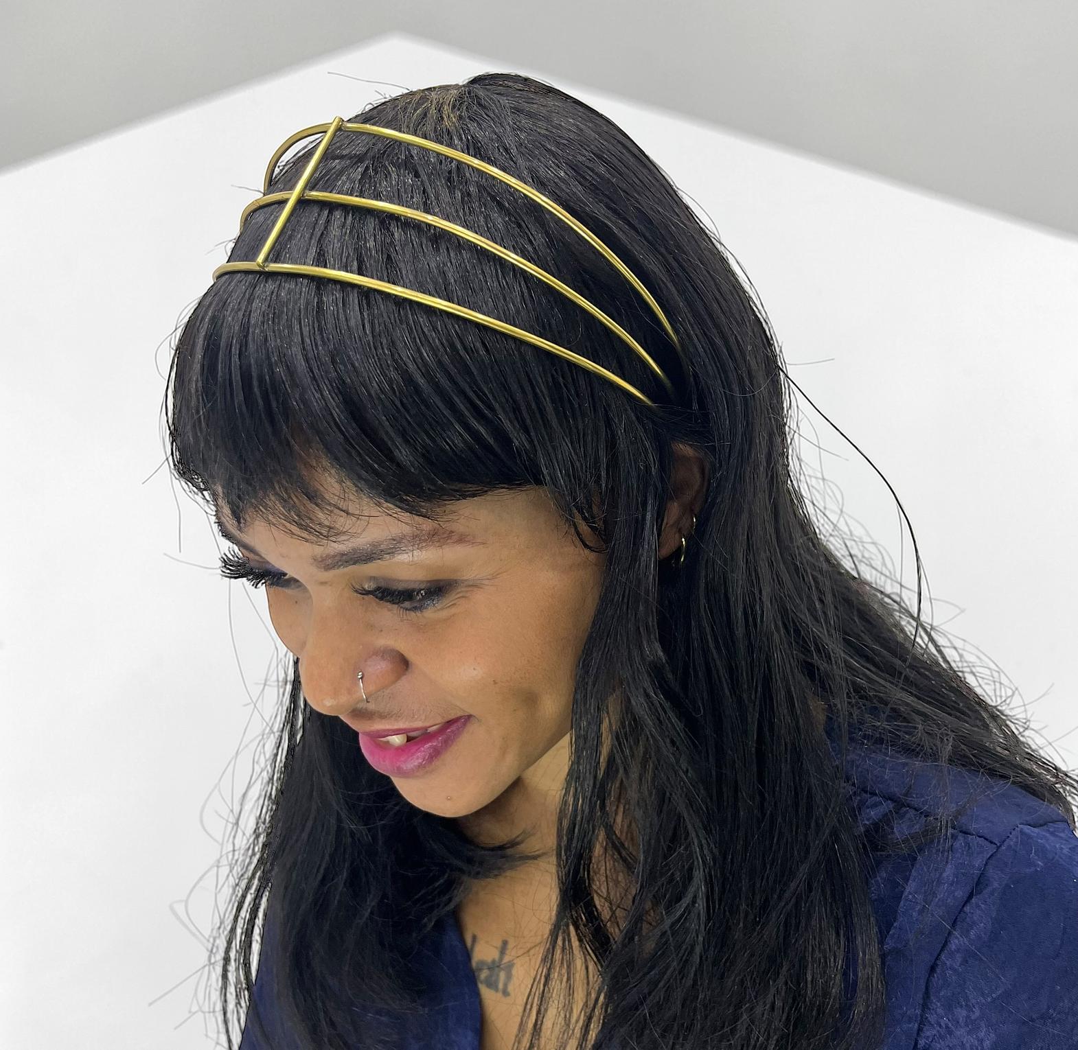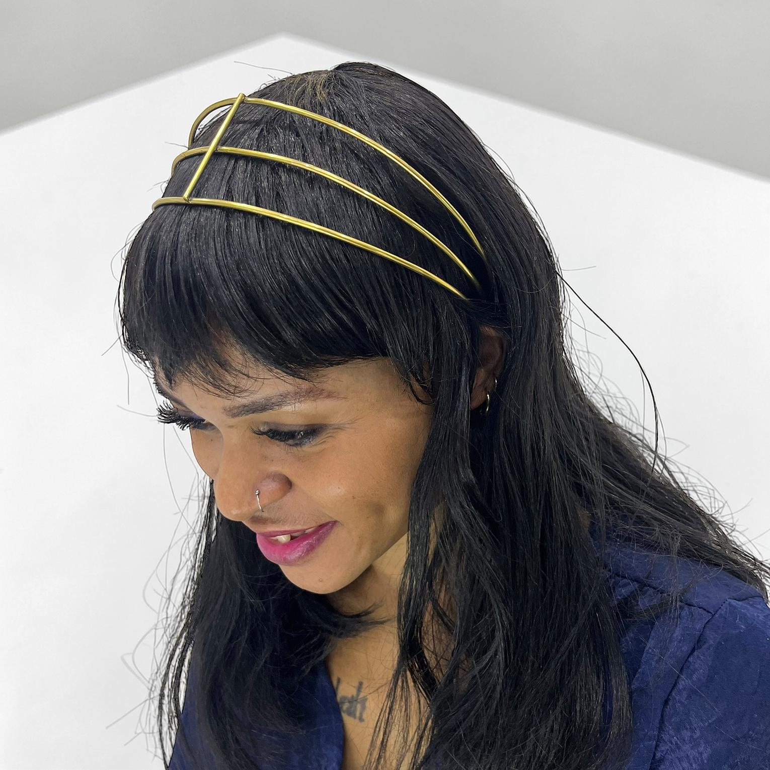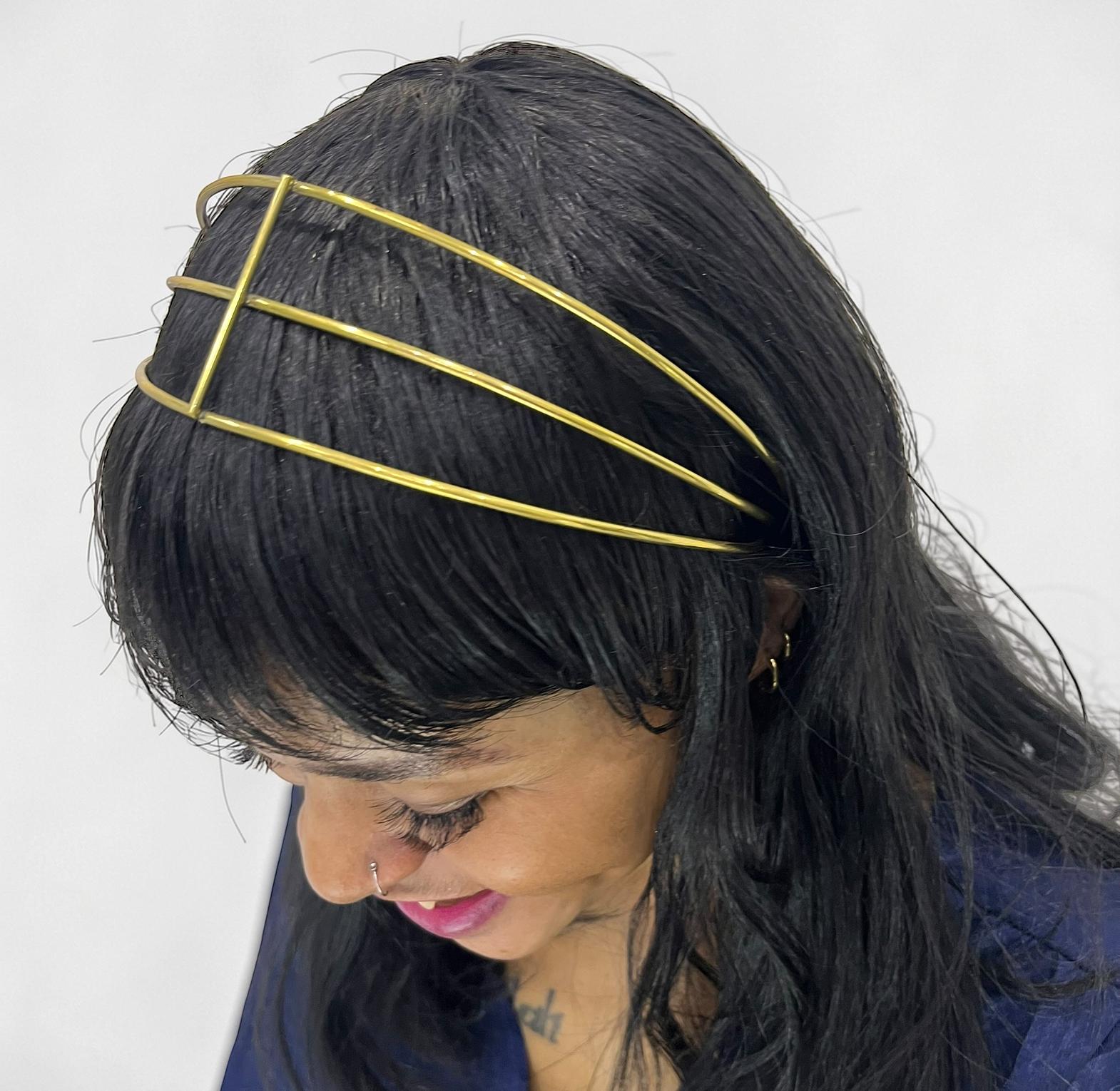 This headband it appears to be made of a reflective material,likely metal or metallic thread/wire witha a bright gold finish.