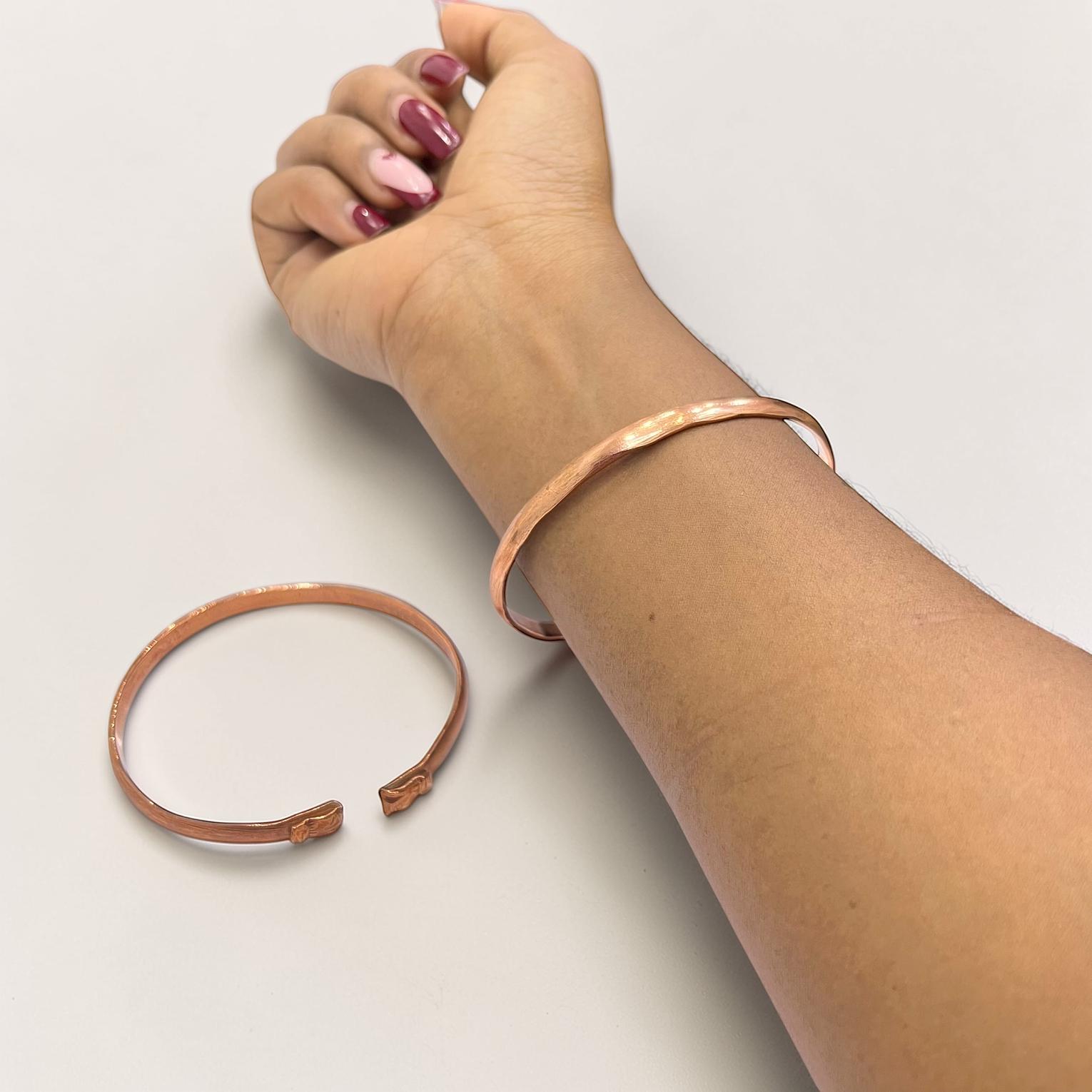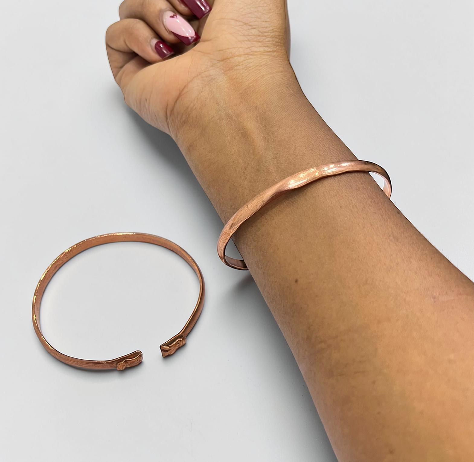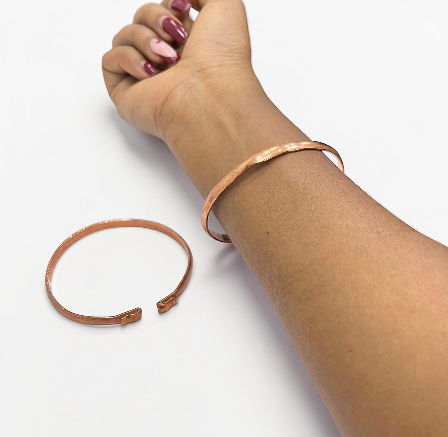 This image features a handmade copper bangle bracelet,often worn for its rustic aesthetic or potential therapeutic benefits.
