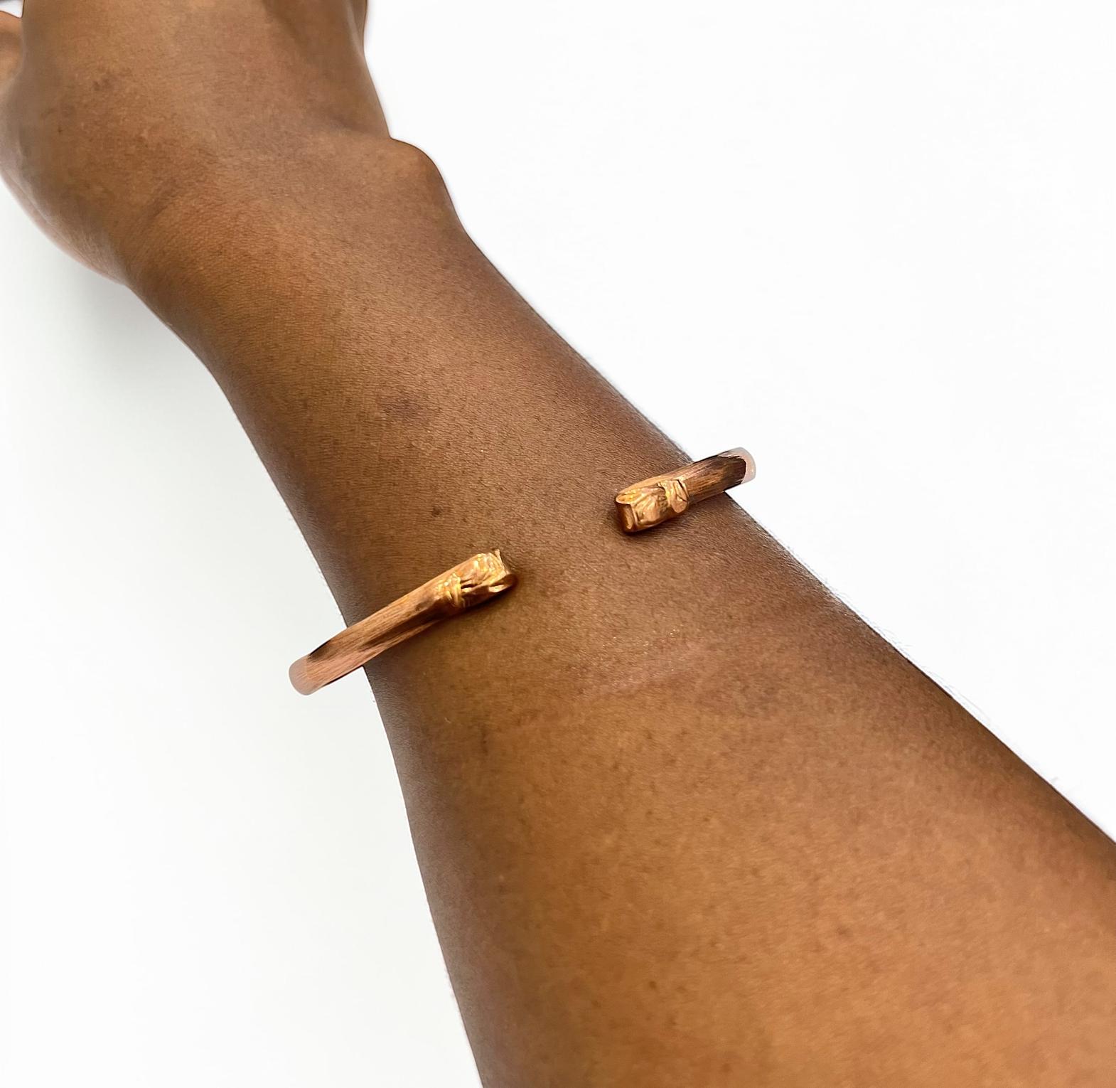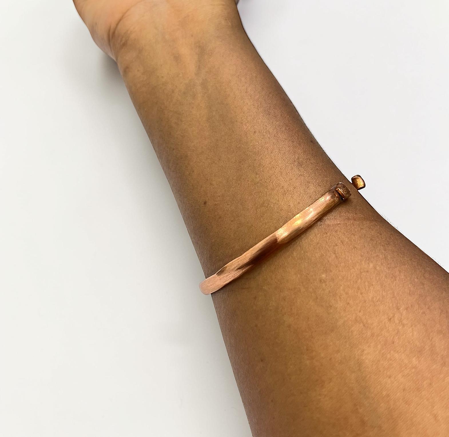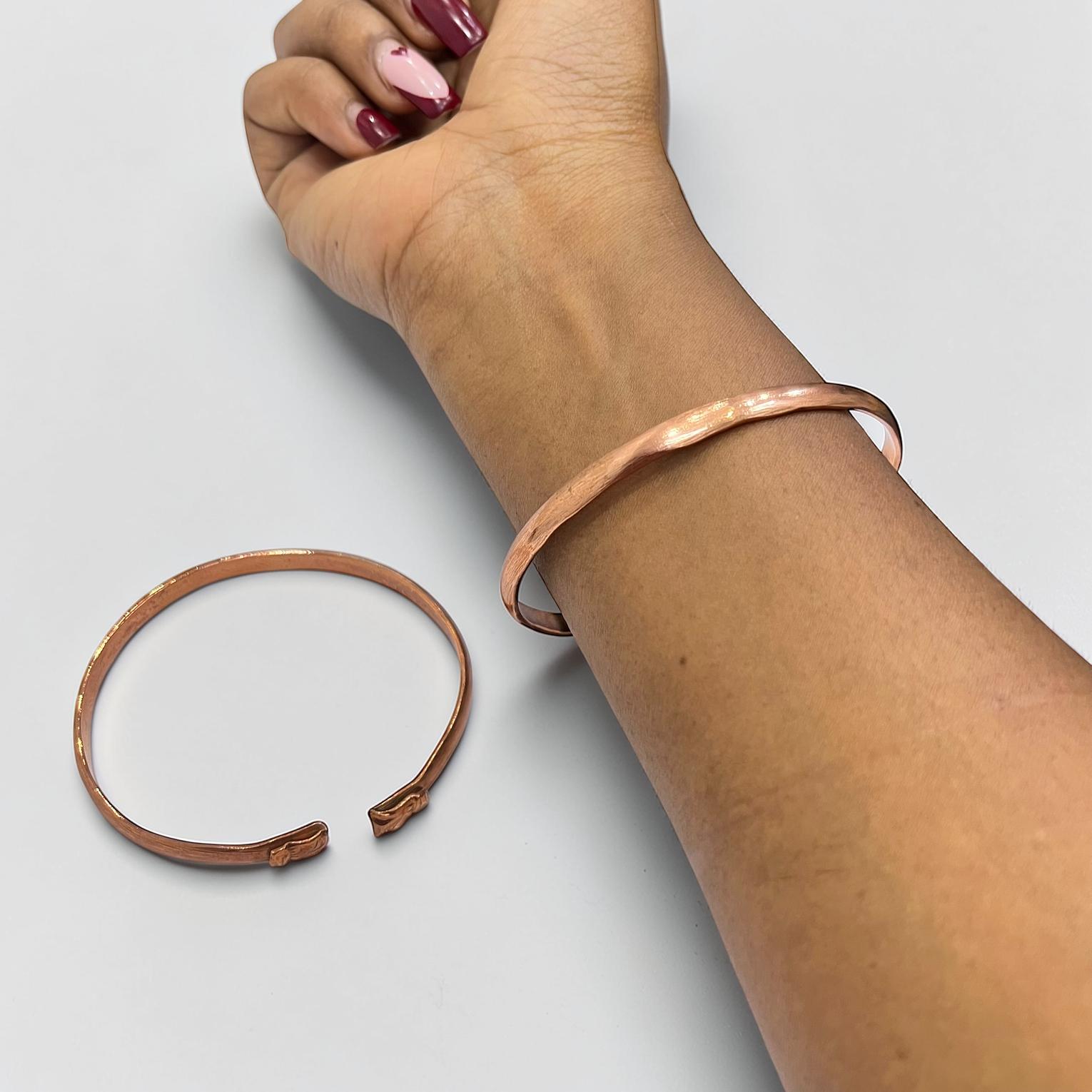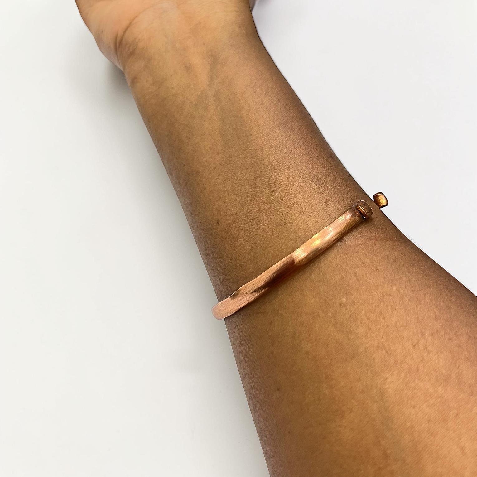 This image features a handmade copper bangle bracelet,often worn for its rustic aesthetic or potential therapeutic benefits.