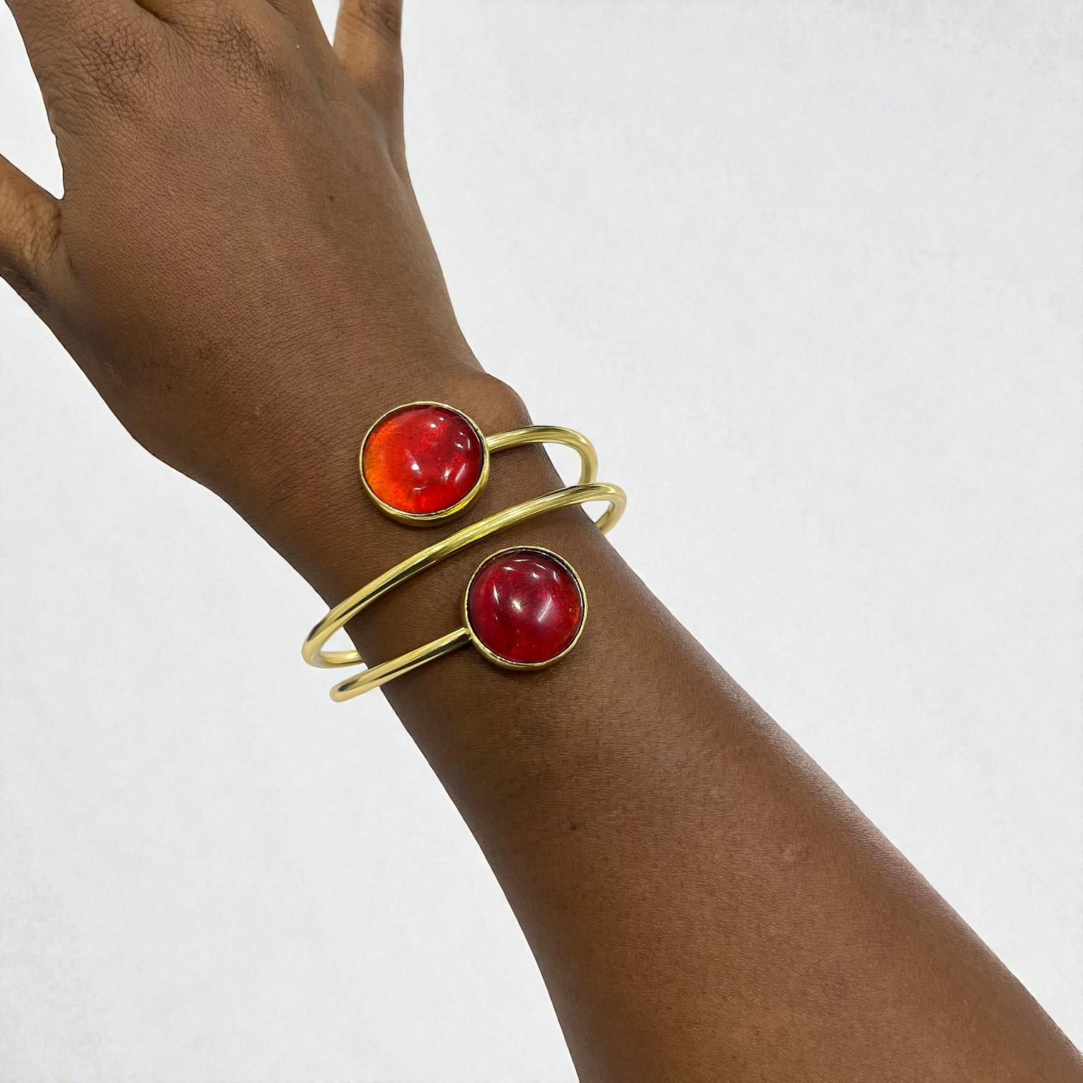 This stylish accessory is a open bangle,often handcrafted frommaterial like brass and featuring vibrant gemstones or glass elements.