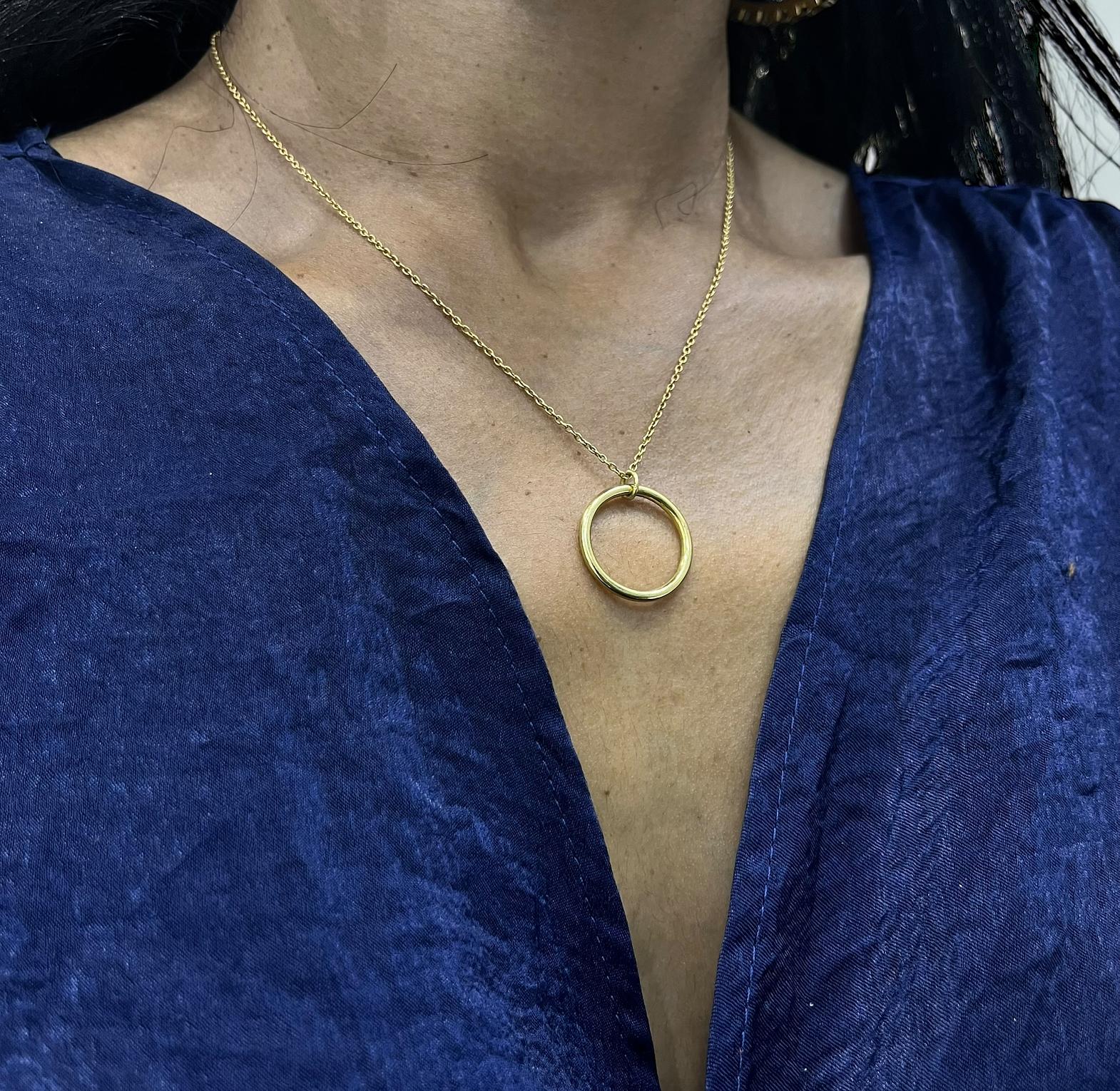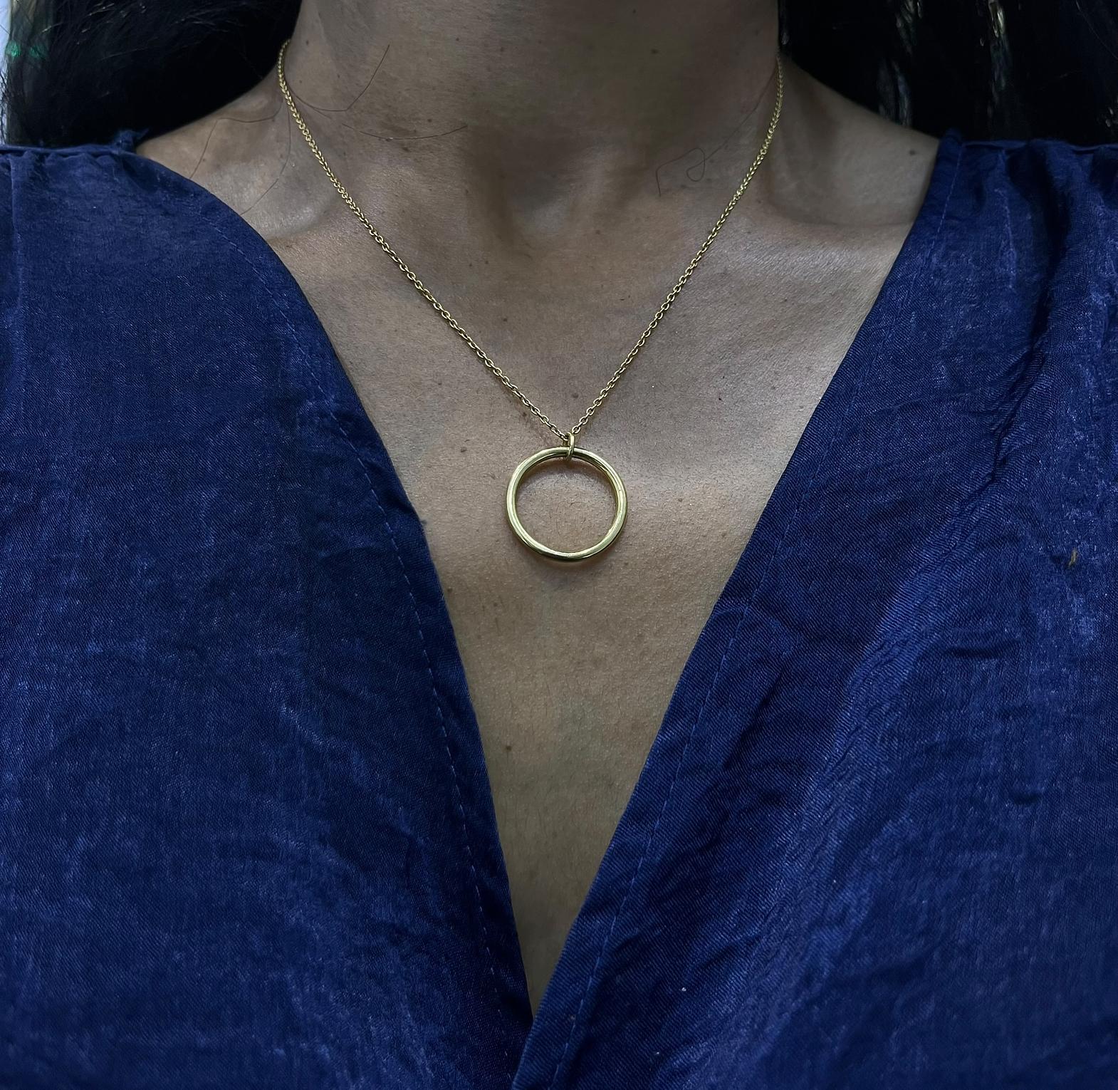 This is a minimalist brass chain necklace featuring a circular pendant,often referred to as an''eternity or karma''circle designed to symbolize unity.