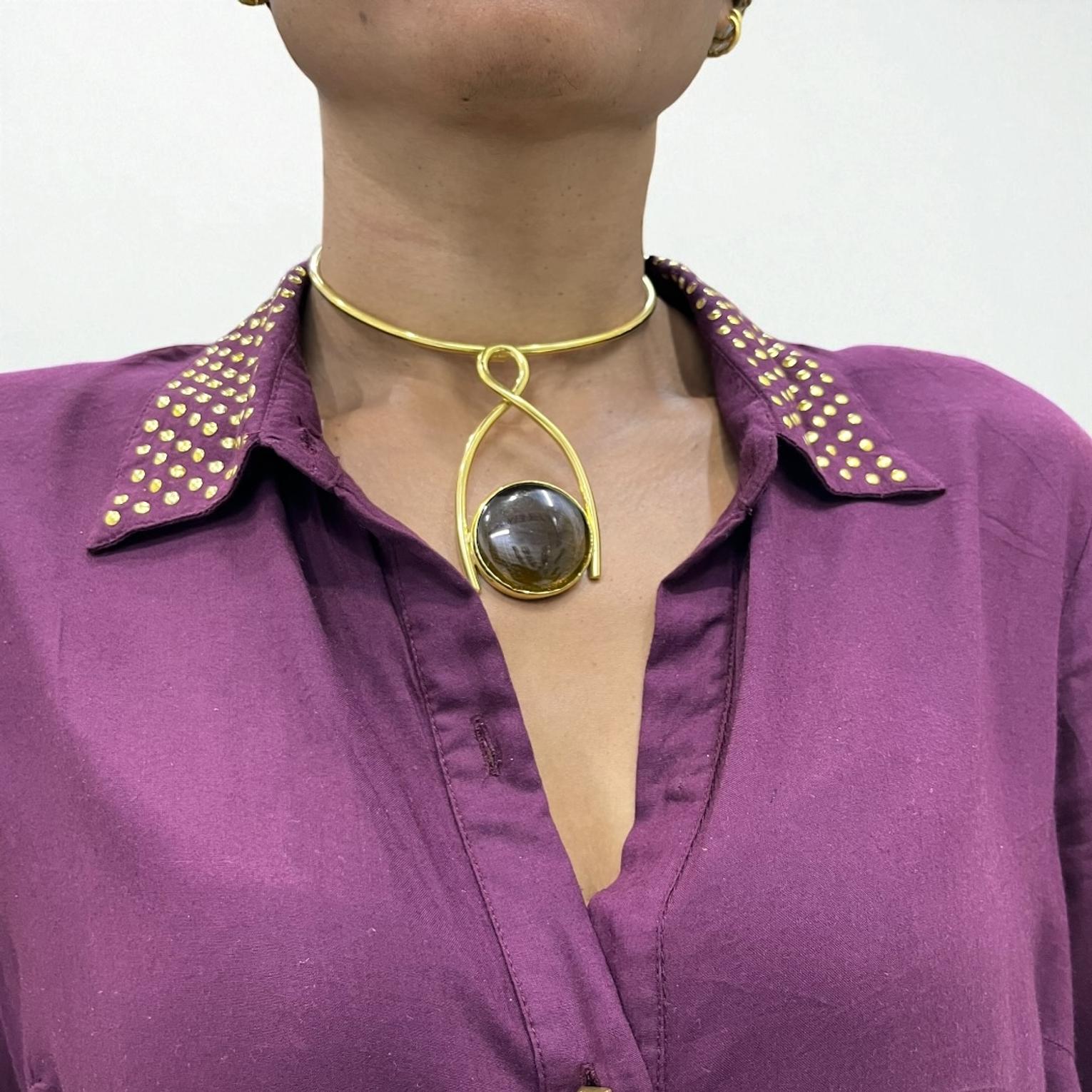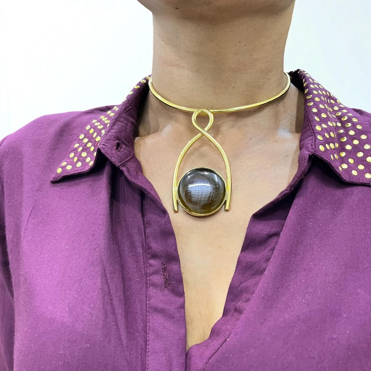 Part of our glass choker collection.A choker that has been beautifully handcrafted and a piece that is bound to make one look twice;made from brass and brown glass for the centrepiece.