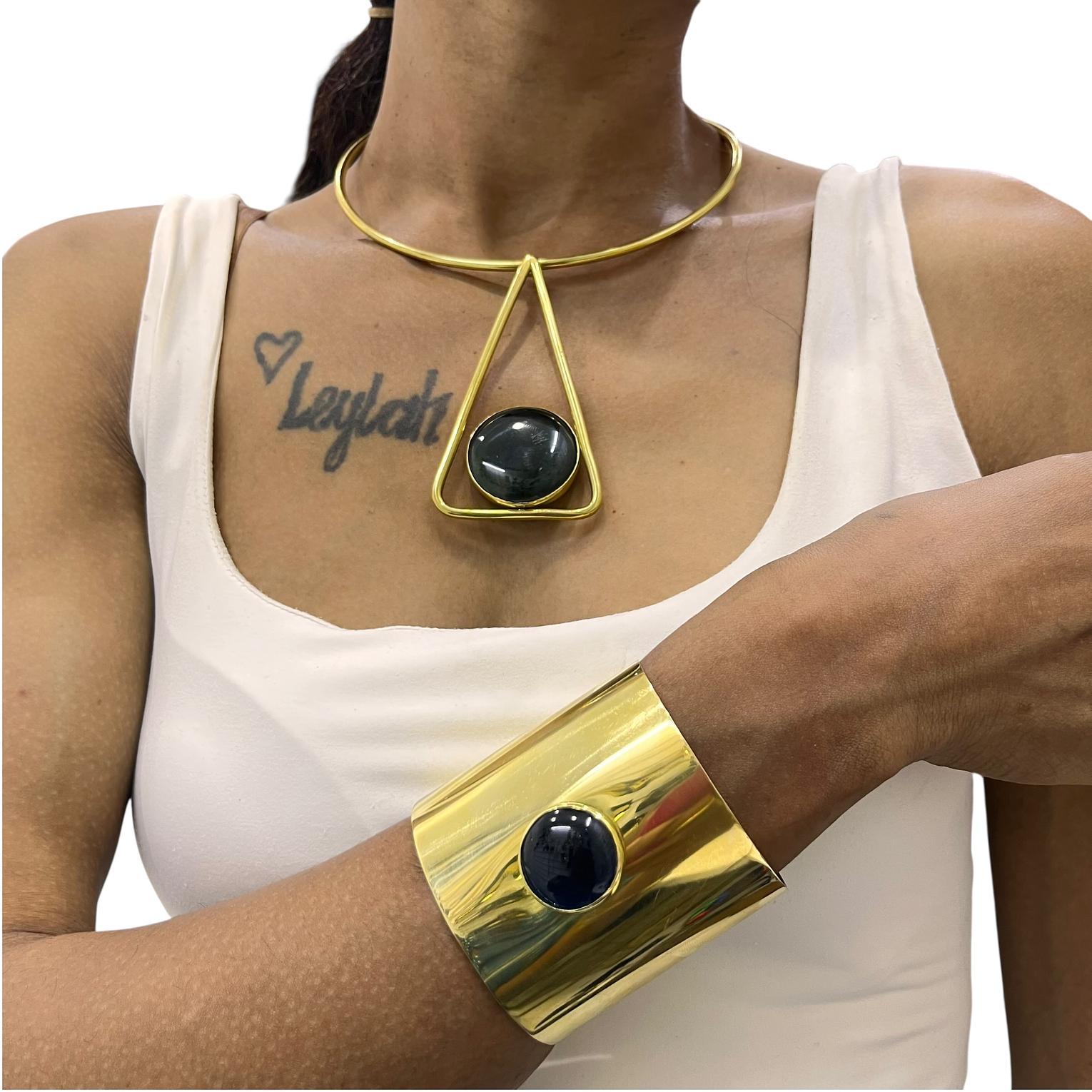 It typically consists of a bold collar style necklace and a matching wide cuff bracelet,both featuring a prominent inset store or resin centerpiece.