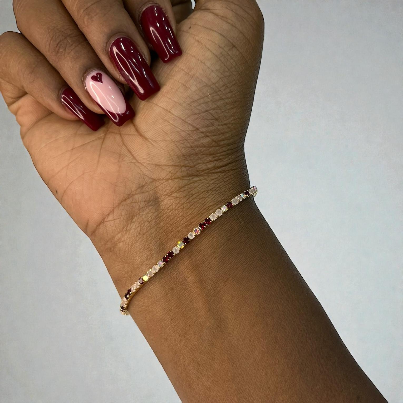 The specific set is known for its luxurious golden finish and 5 individual stretchy strands adorned with crystals in neutral tones like mauve,taupe,and clear.