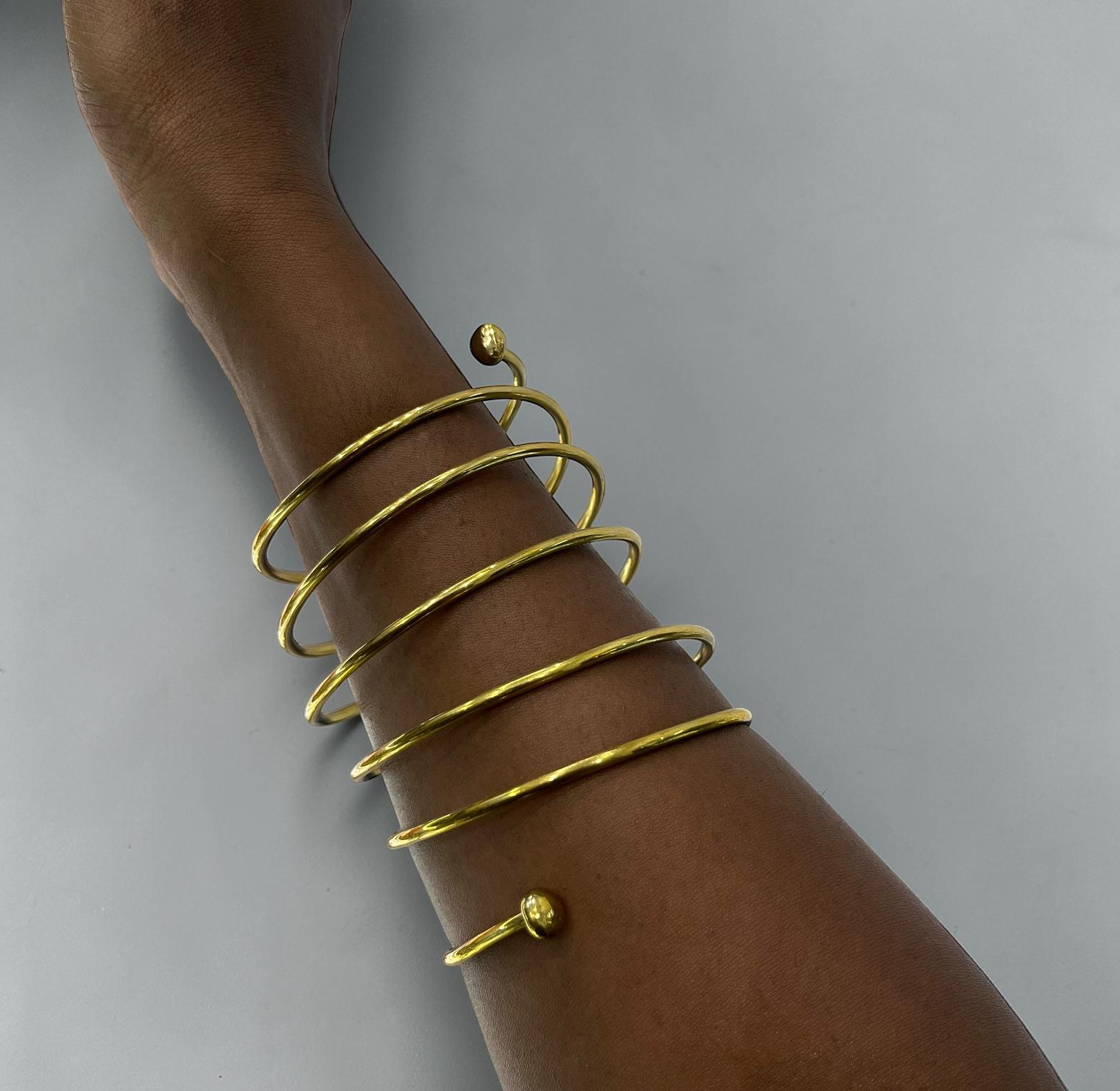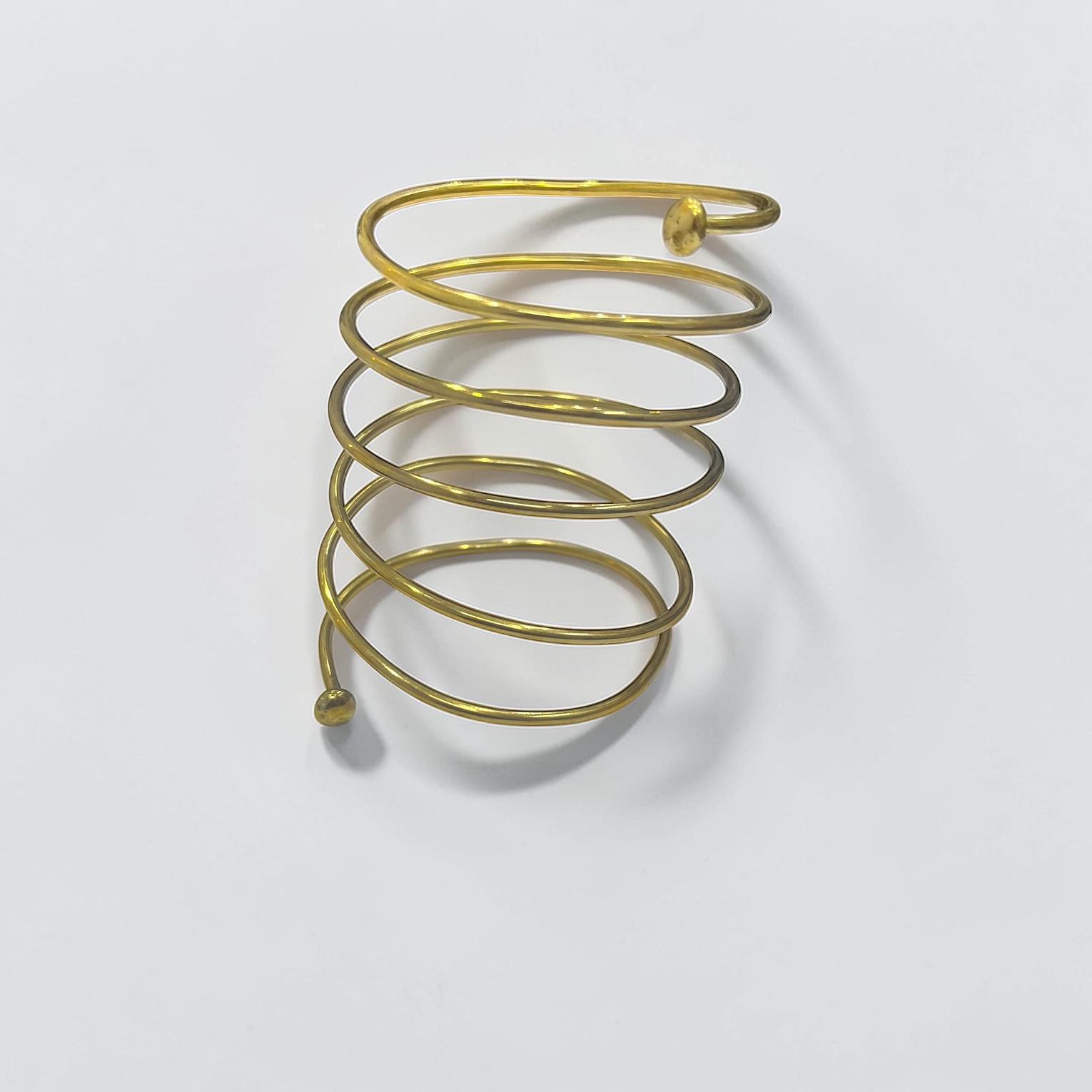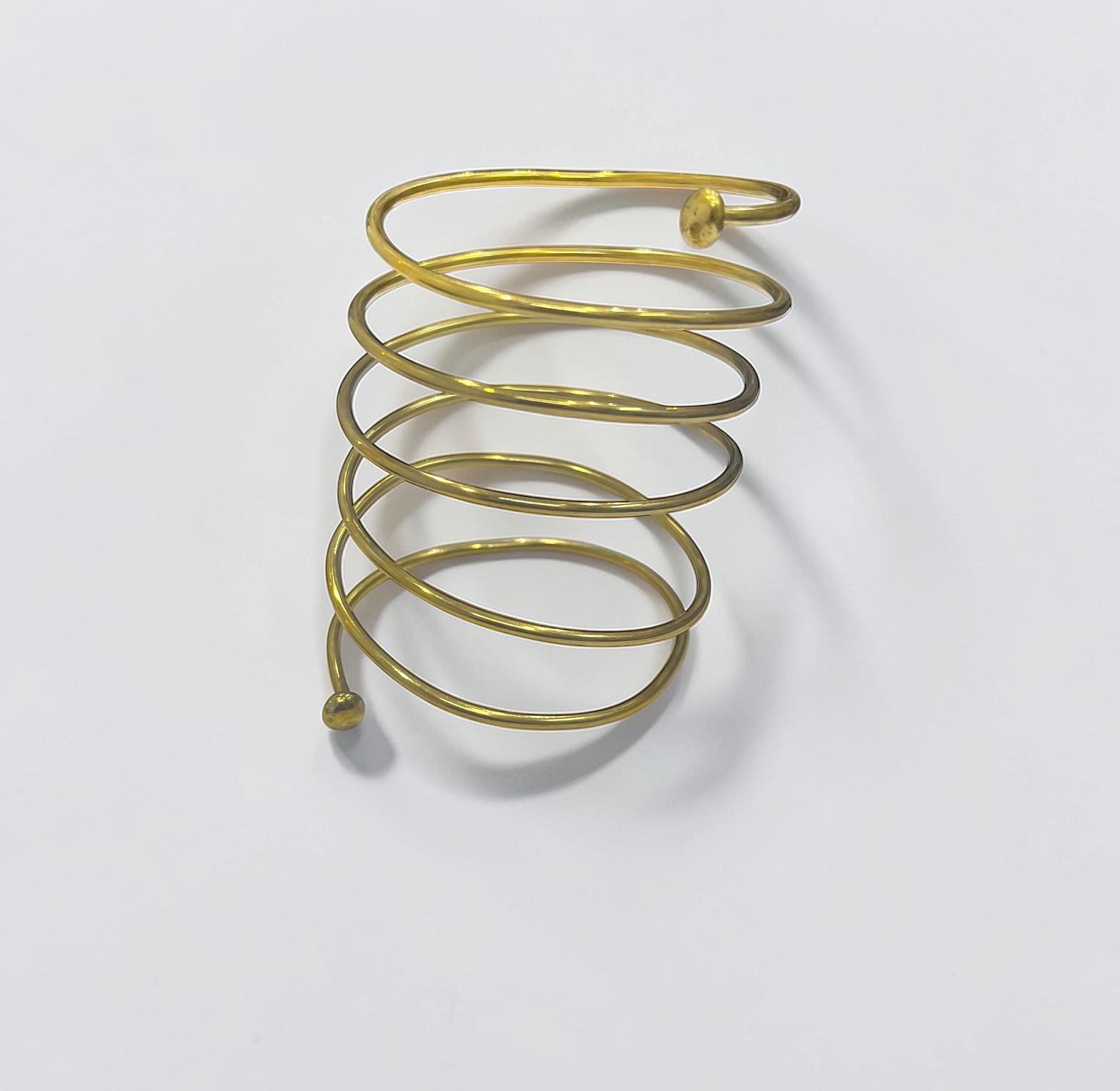 The item in the image is a multi-layered gold-tone spiral arm cuff or bangle bracelete.Its unique design makes it a striking accessory.