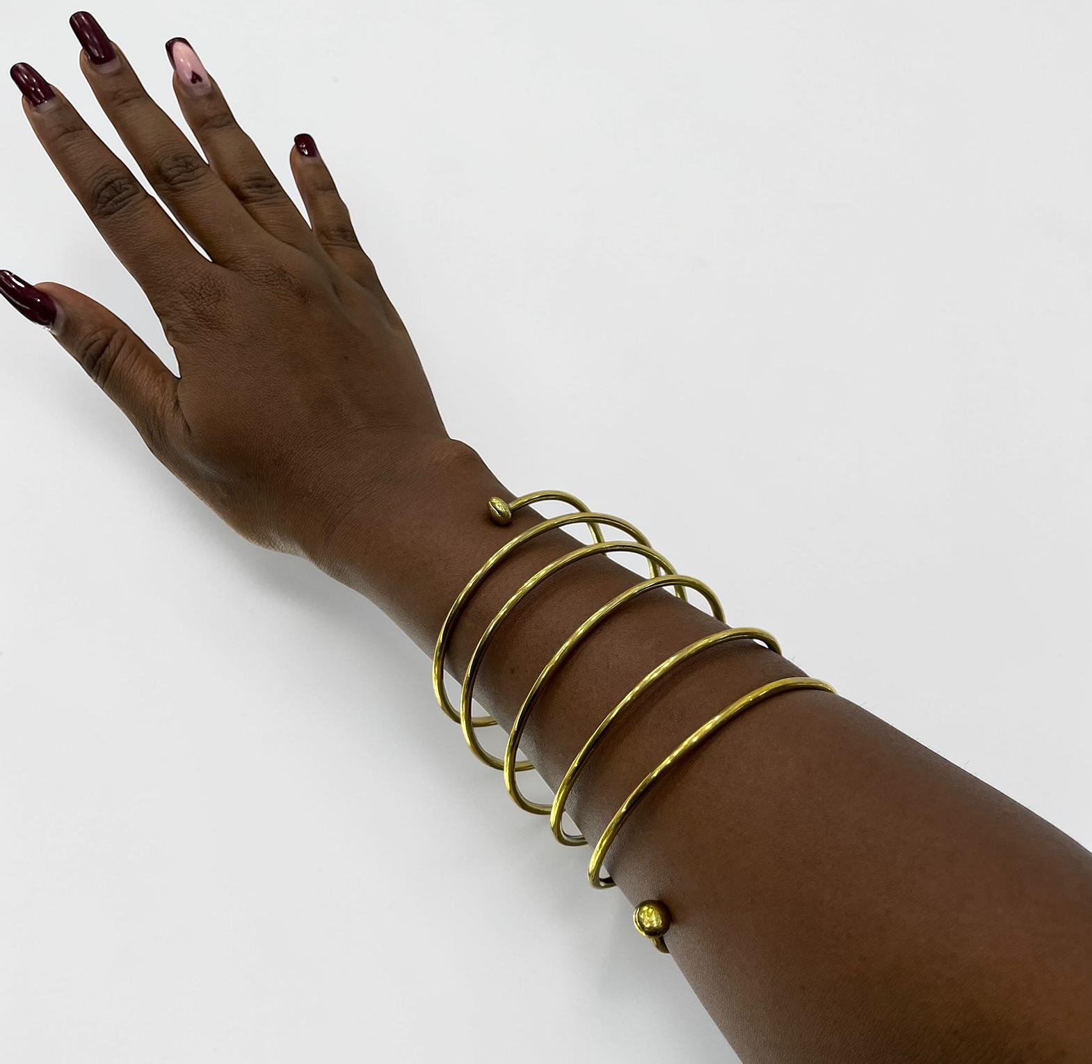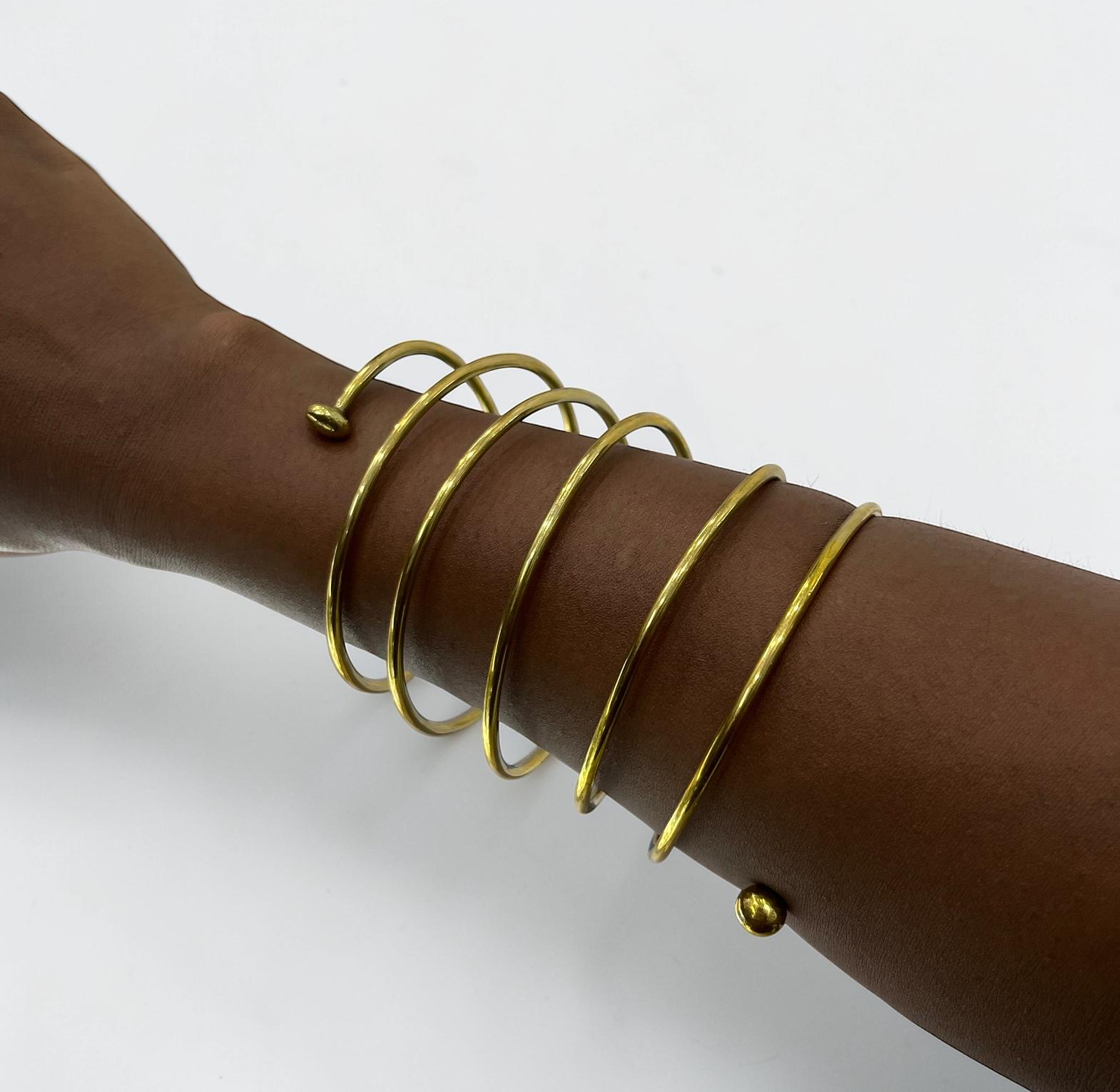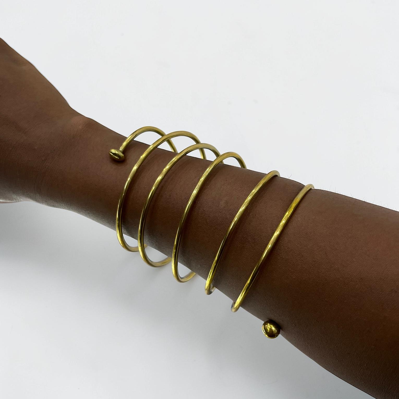 The item in the image is a multi-layered gold-tone spiral arm cuff or bangle bracelete.Its unique design makes it a striking accessory.
