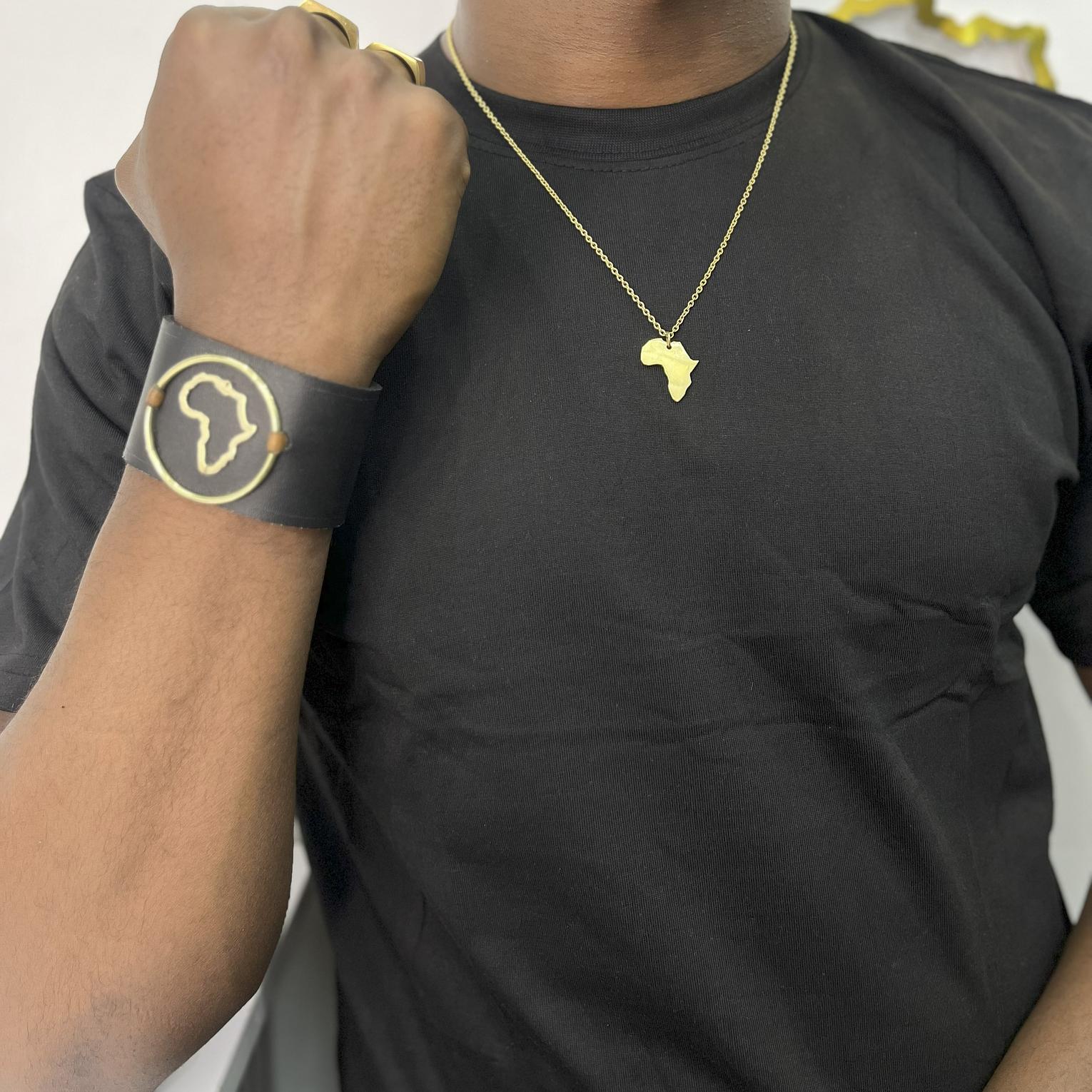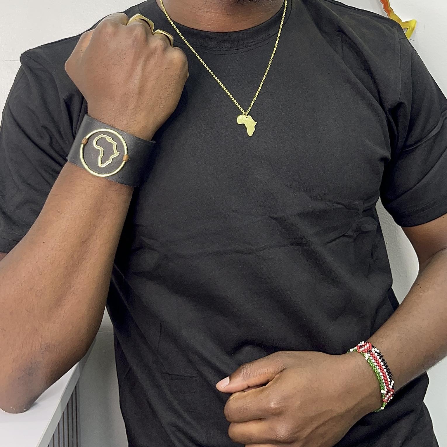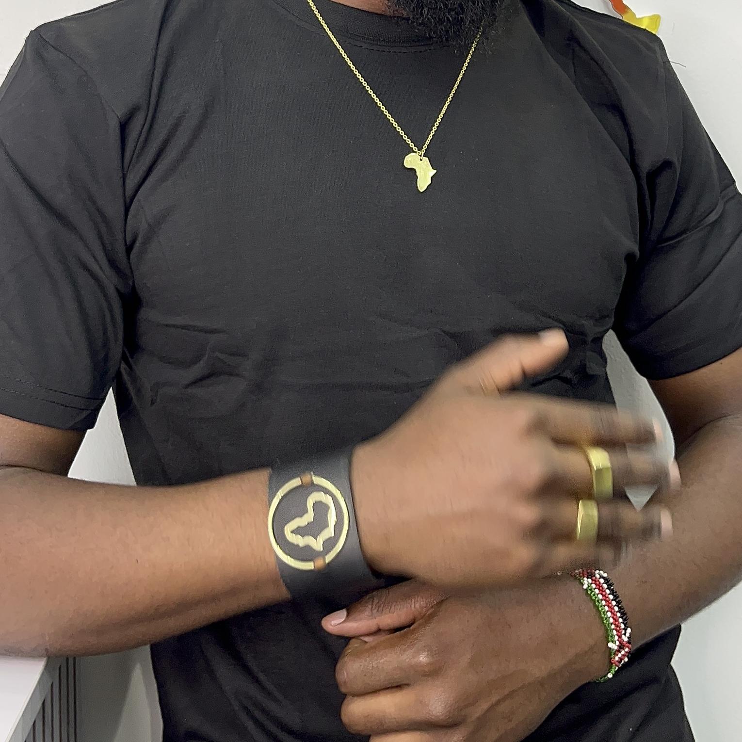 The Tau Bracelet is crafted from premium leather with bold brass accents, combining durability with style.