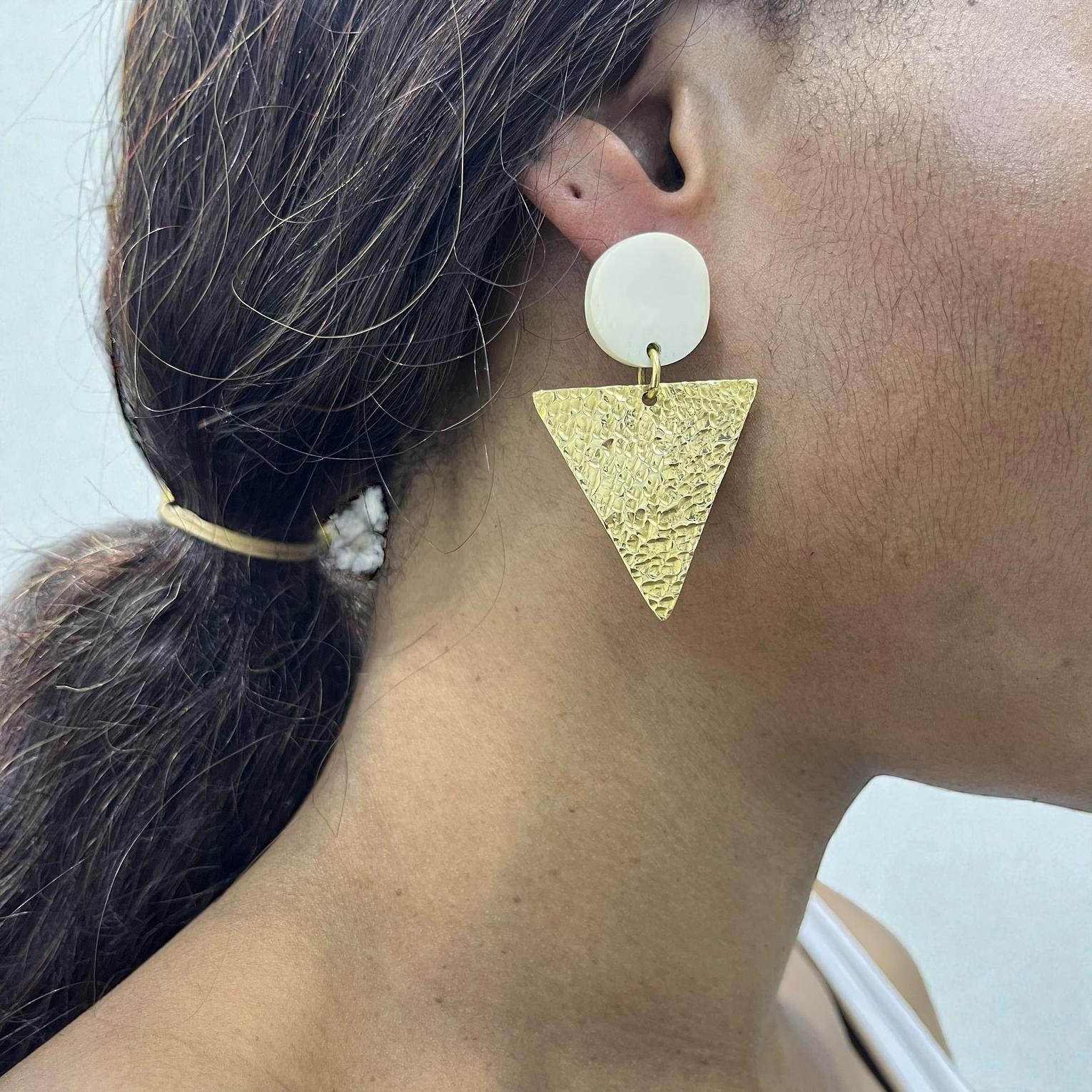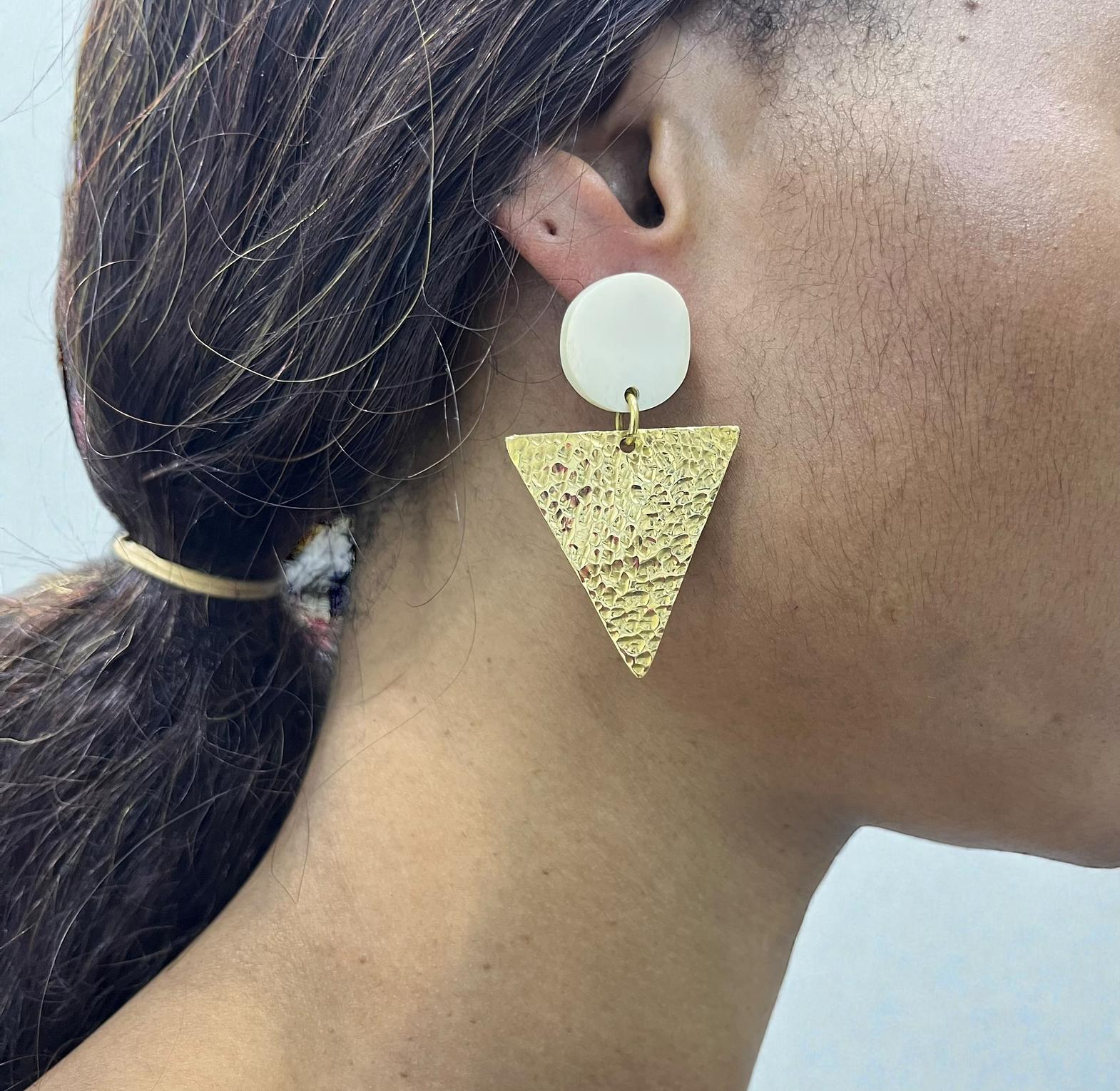 The earrings feature a minimalist geometric design consisting of a circular stud or disc at the top from which a large textured triangle is suspended.