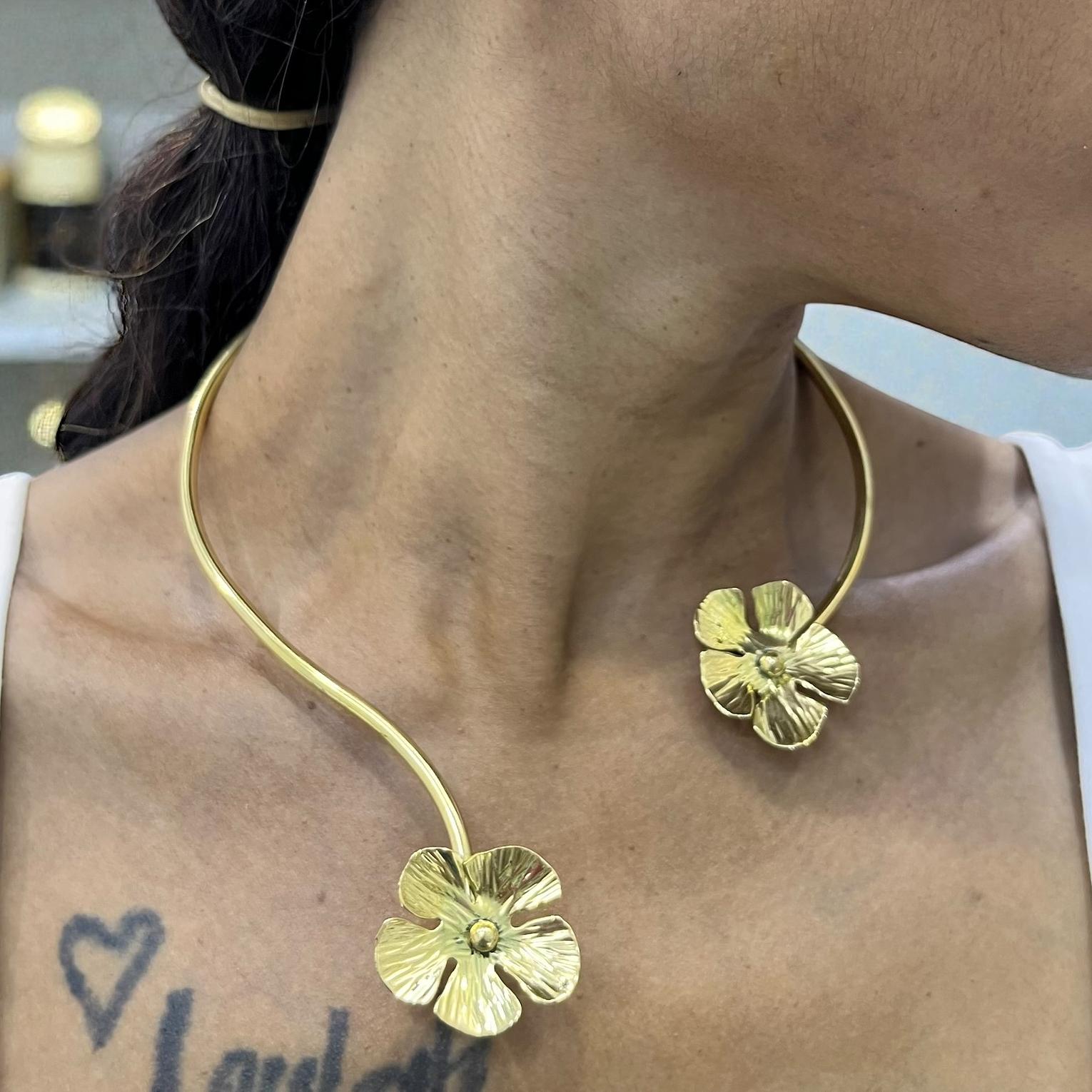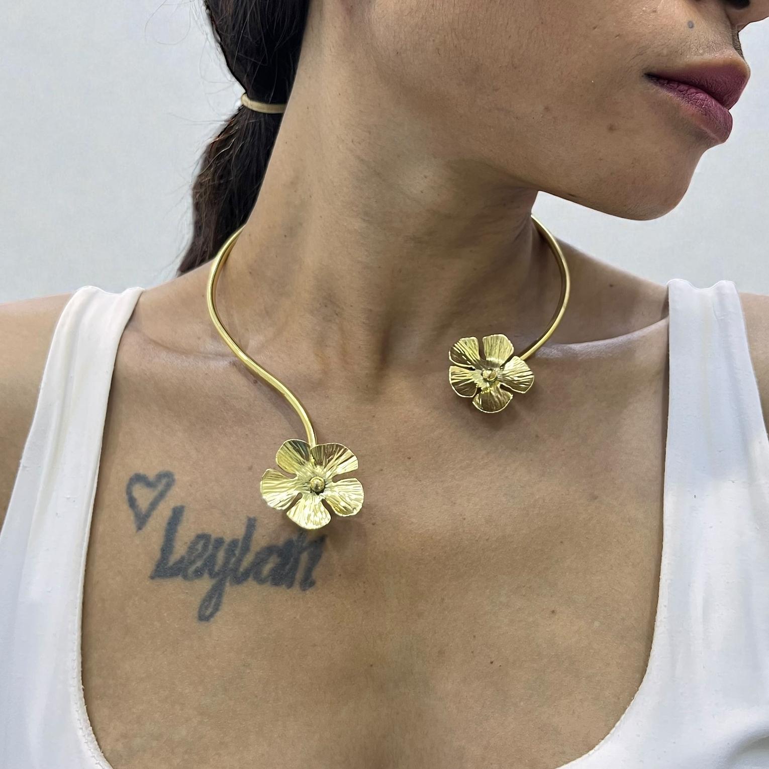 The specific style,characterized by its open-ended wire collar design with sculptural flower pendants at each end,is a popular statement accessory for both casual and formal occasions.
