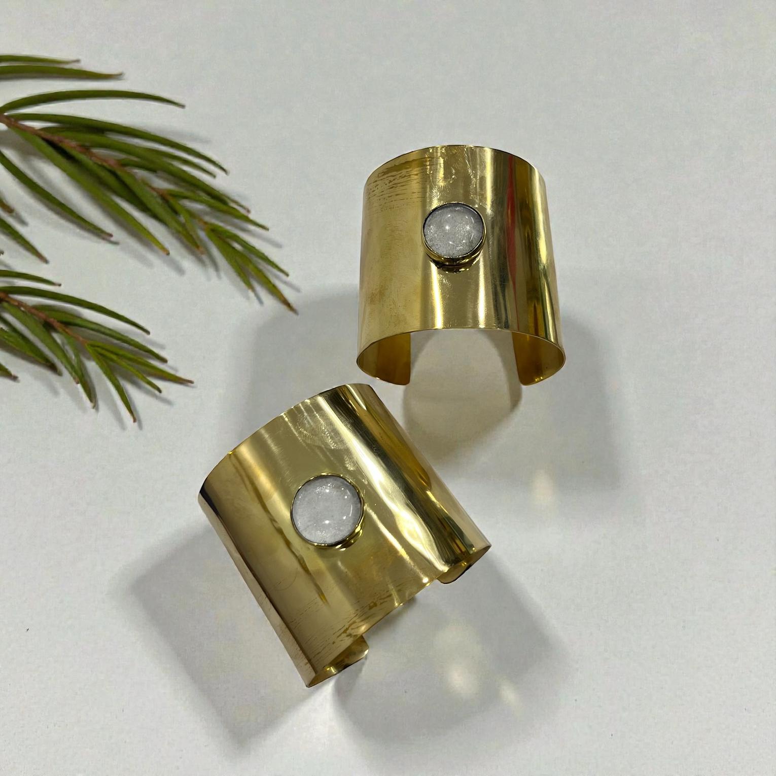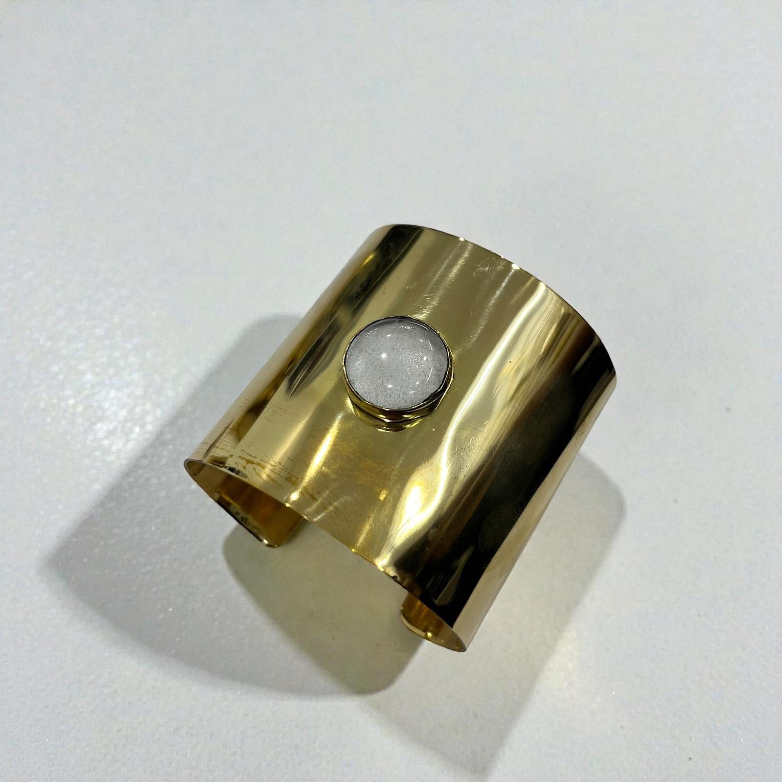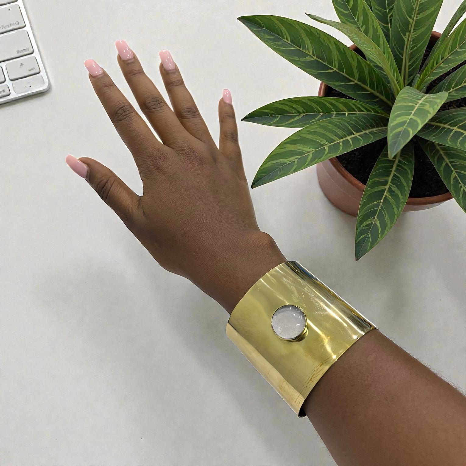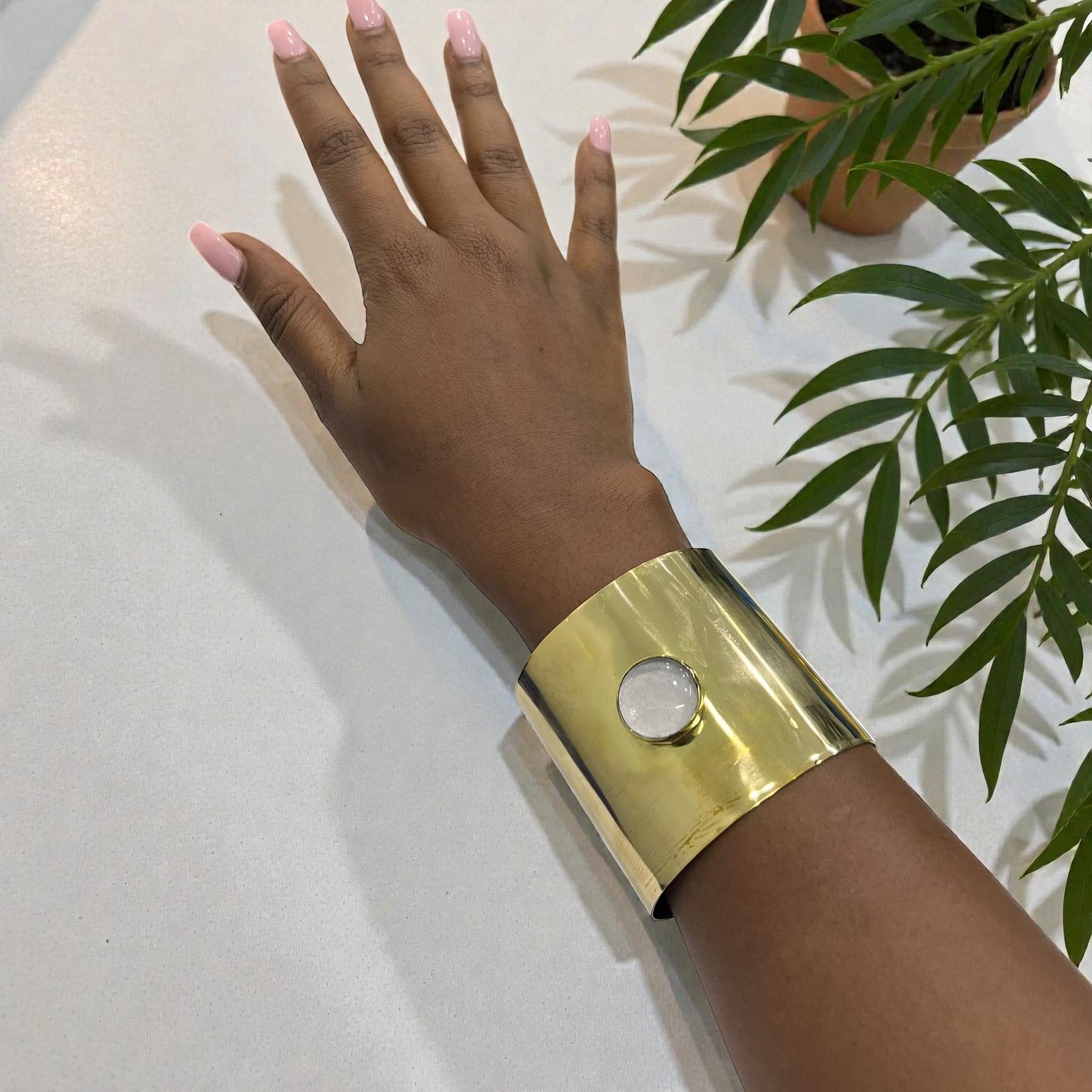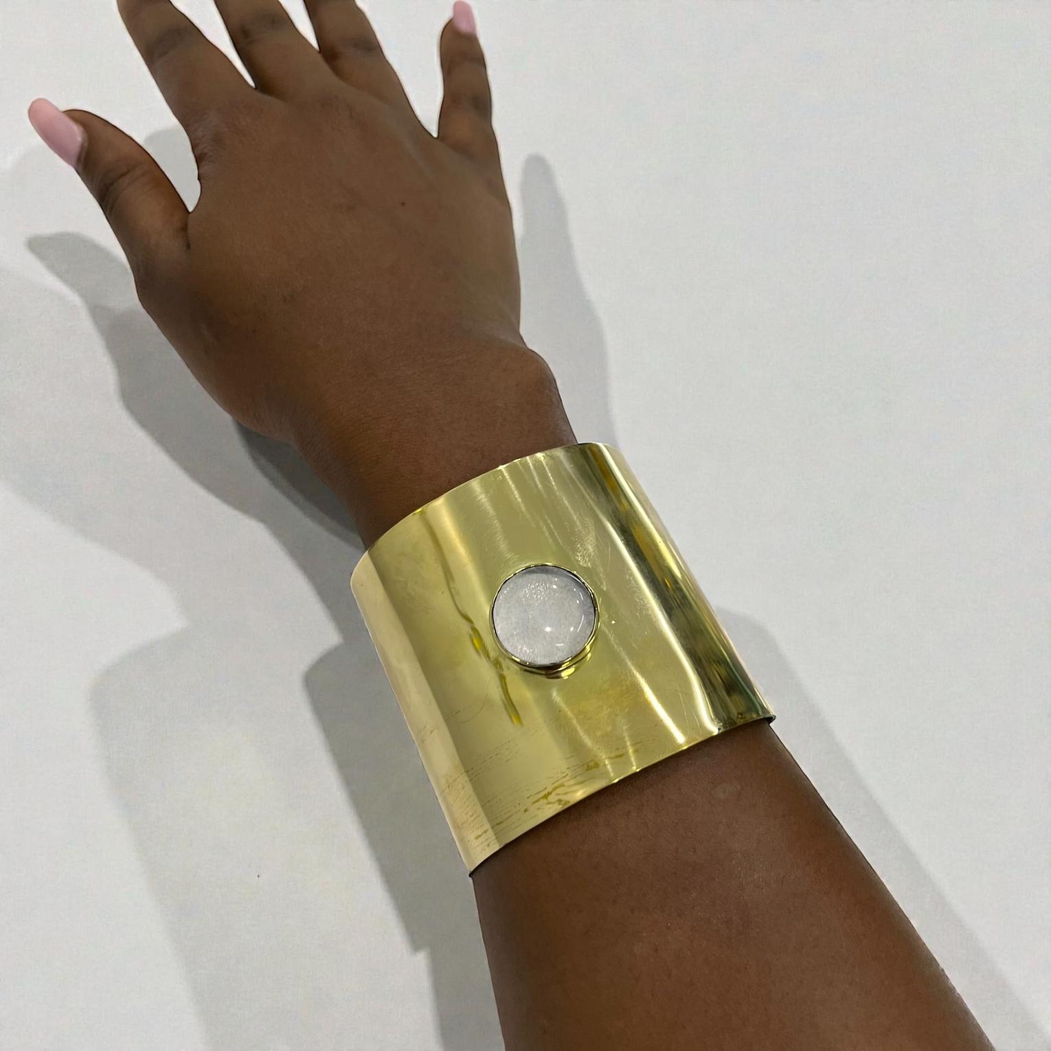 This Wide cuff bracelet is a statement look for differents occasion with a resin or similar material for the white circle.