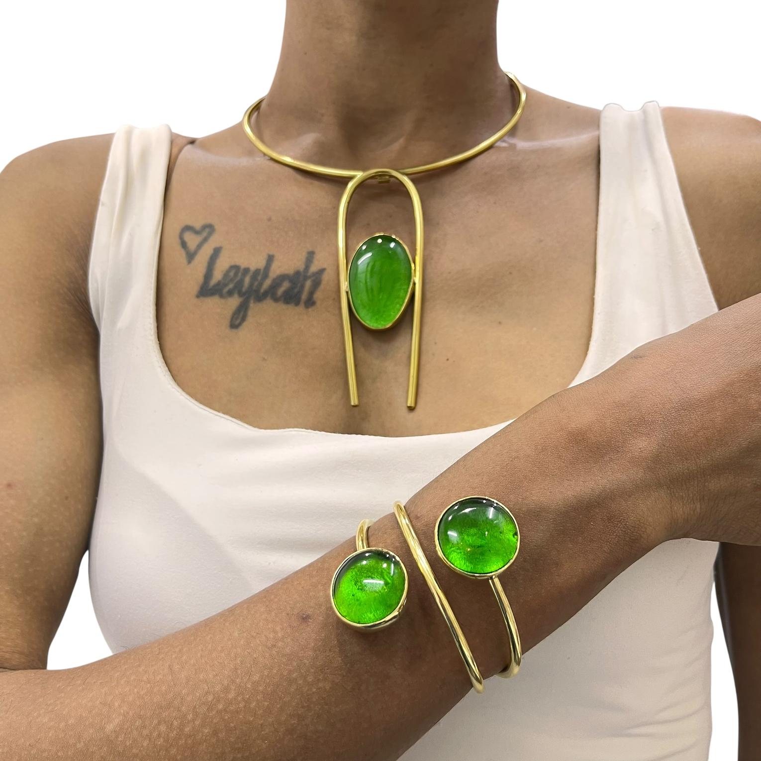 This jewelry set is a handcrafted ensemble made from recycled brass and green gemstones,widely recognized as a ''wiki''or''maisha''style pieces are typically artisanal creations from Kenya often associated with brands like PURELY BRASS AFRICA.