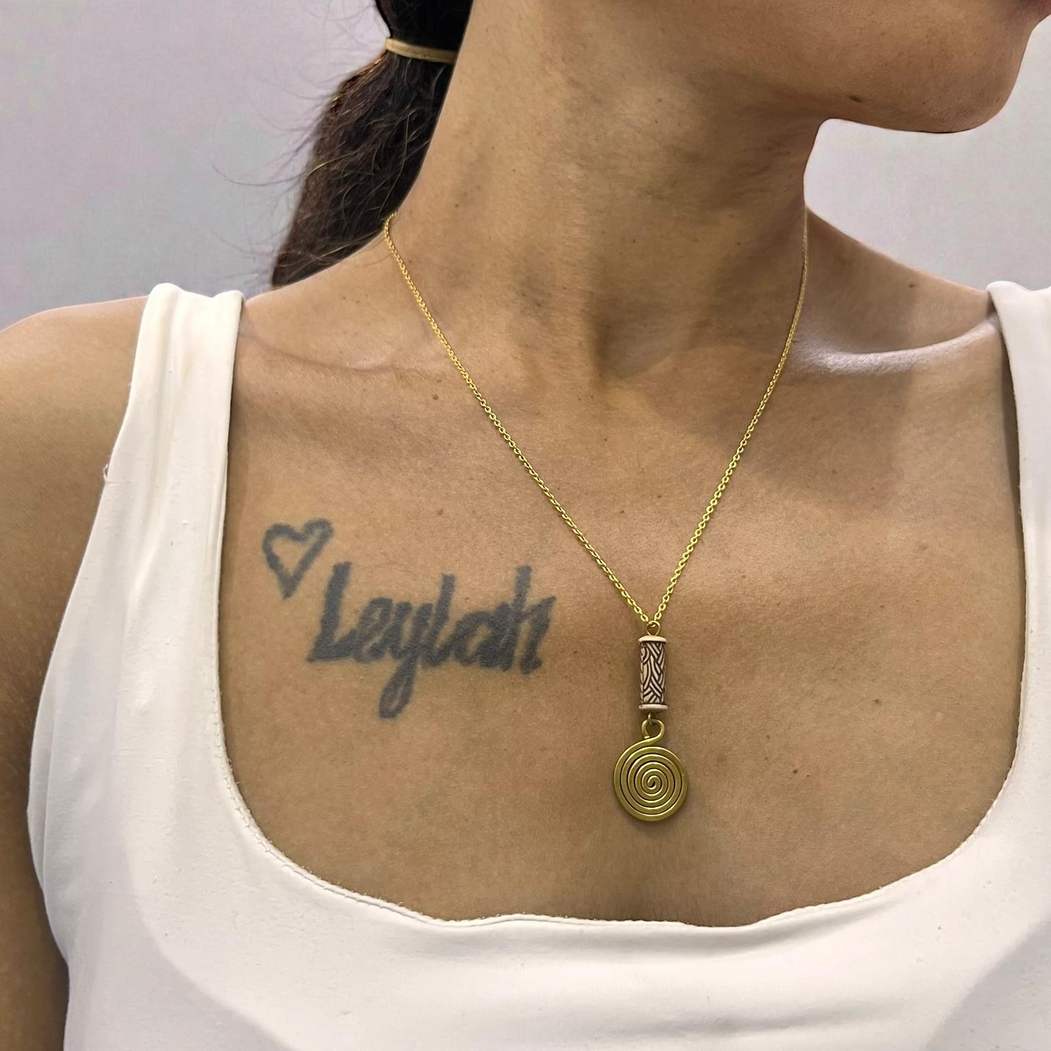 This necklace features a handcrafted brass pendant with a spiral design typical of artisan jewelry made in Kenya .