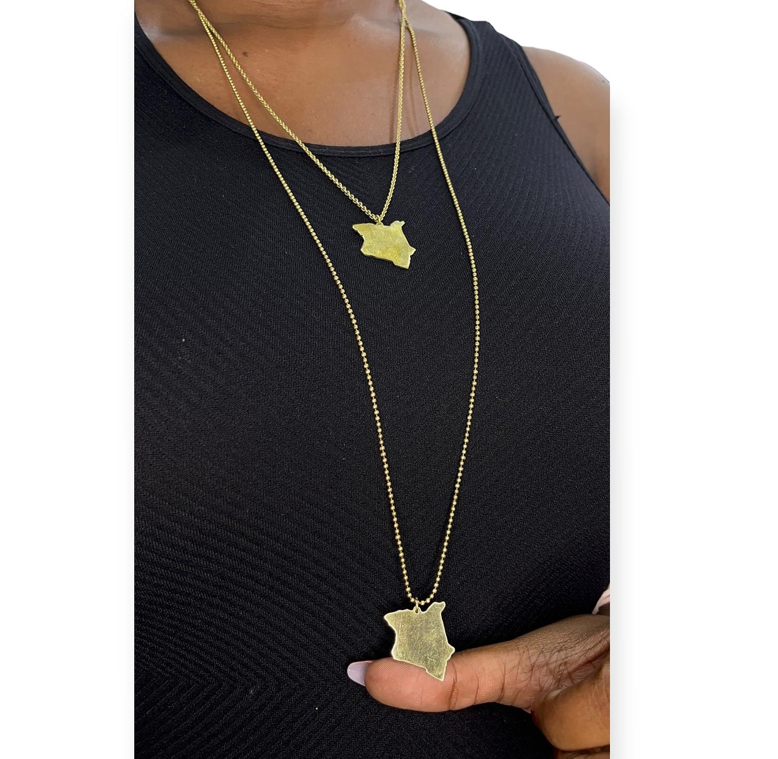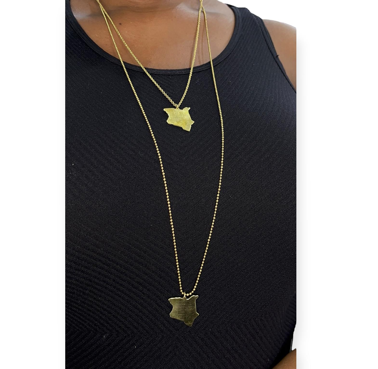 A brass long necklace inspired by We Asked for Her, and Behold, We Got Her (Yoruba).