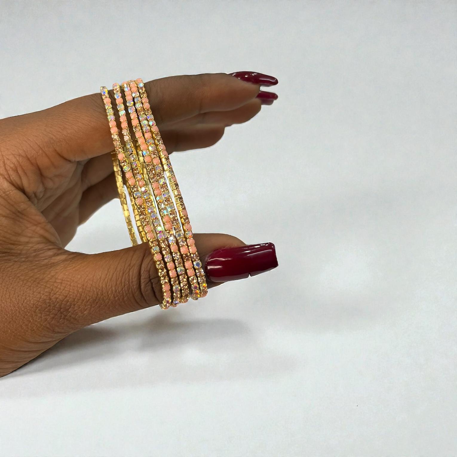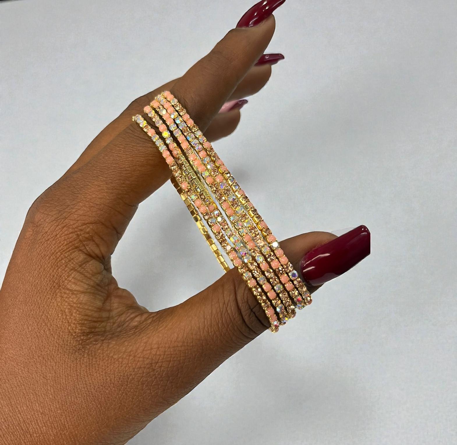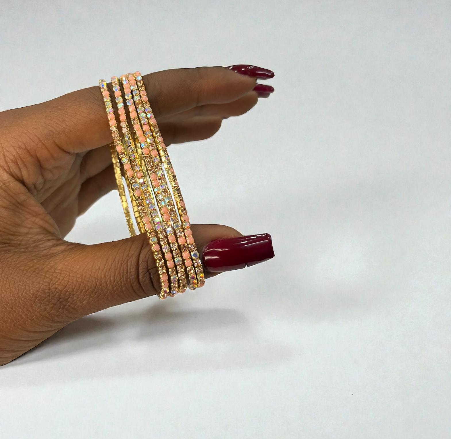 These are a set of five stretch bracelets feauturing iridescent ab crystal rhinestones and glass beads designed to catch the light.