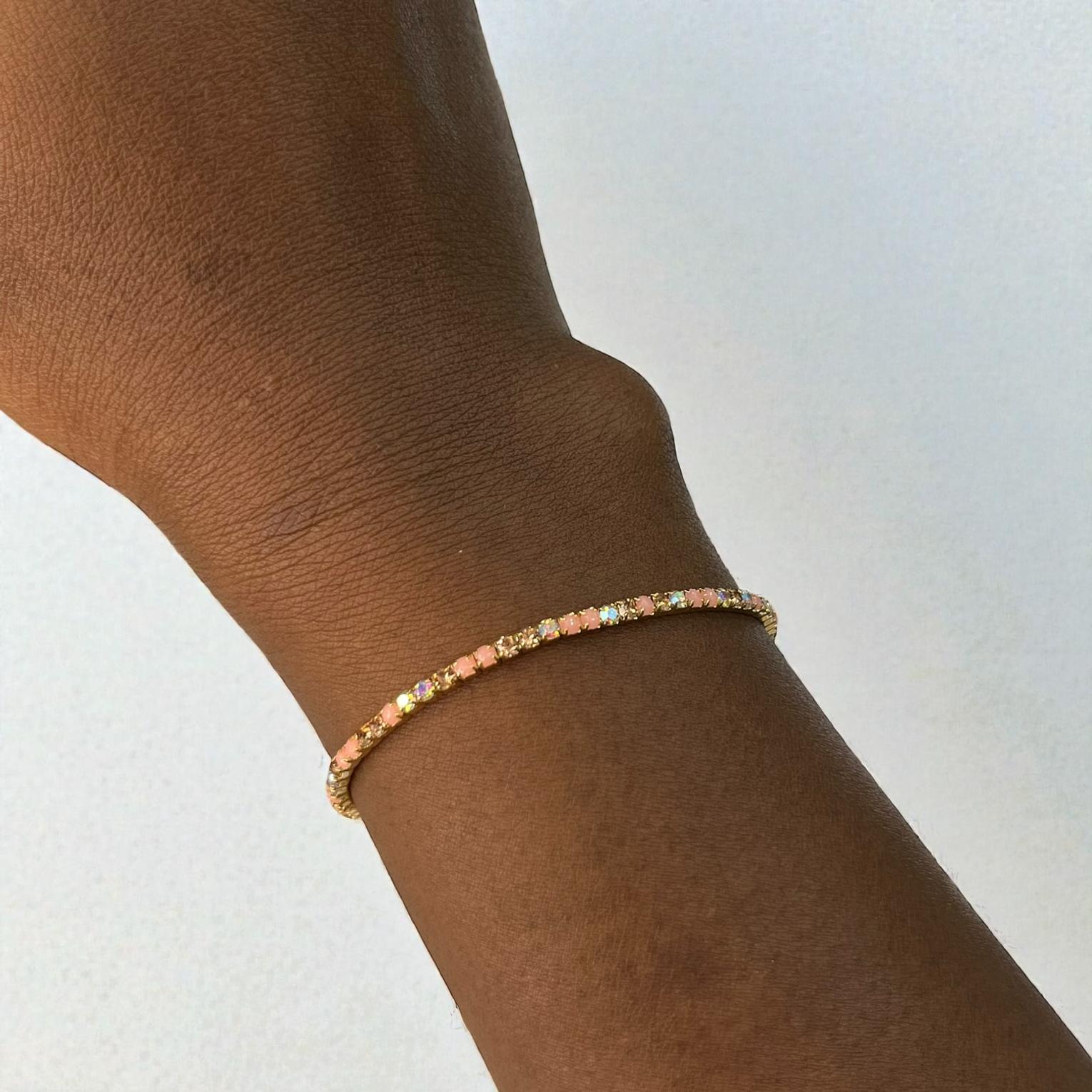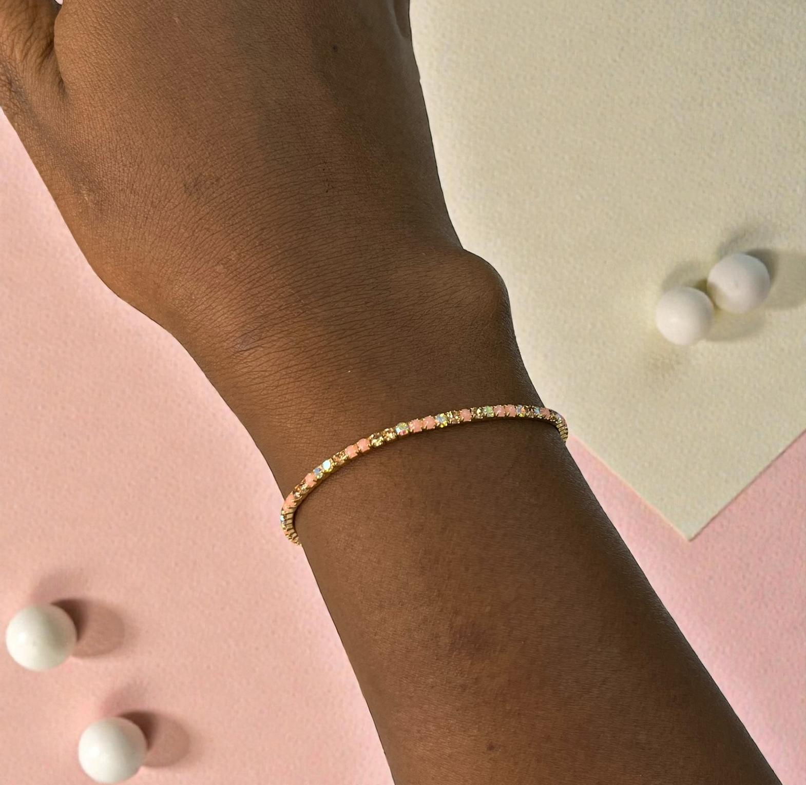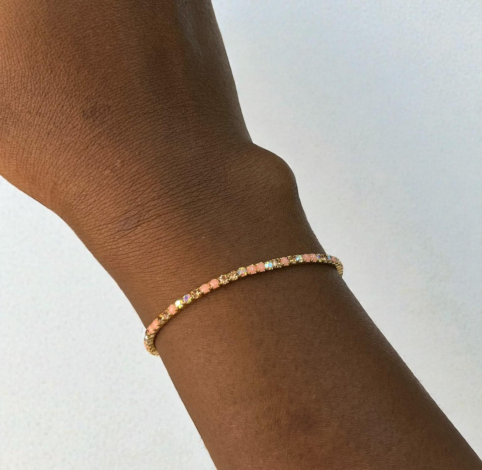 These are a set of five stretch bracelets feauturing iridescent ab crystal rhinestones and glass beads designed to catch the light.