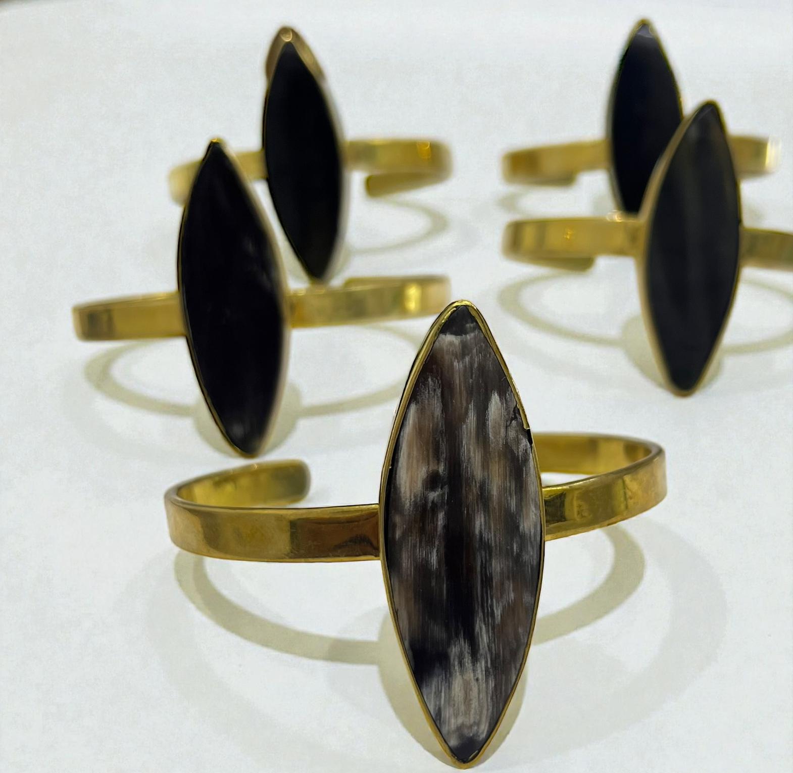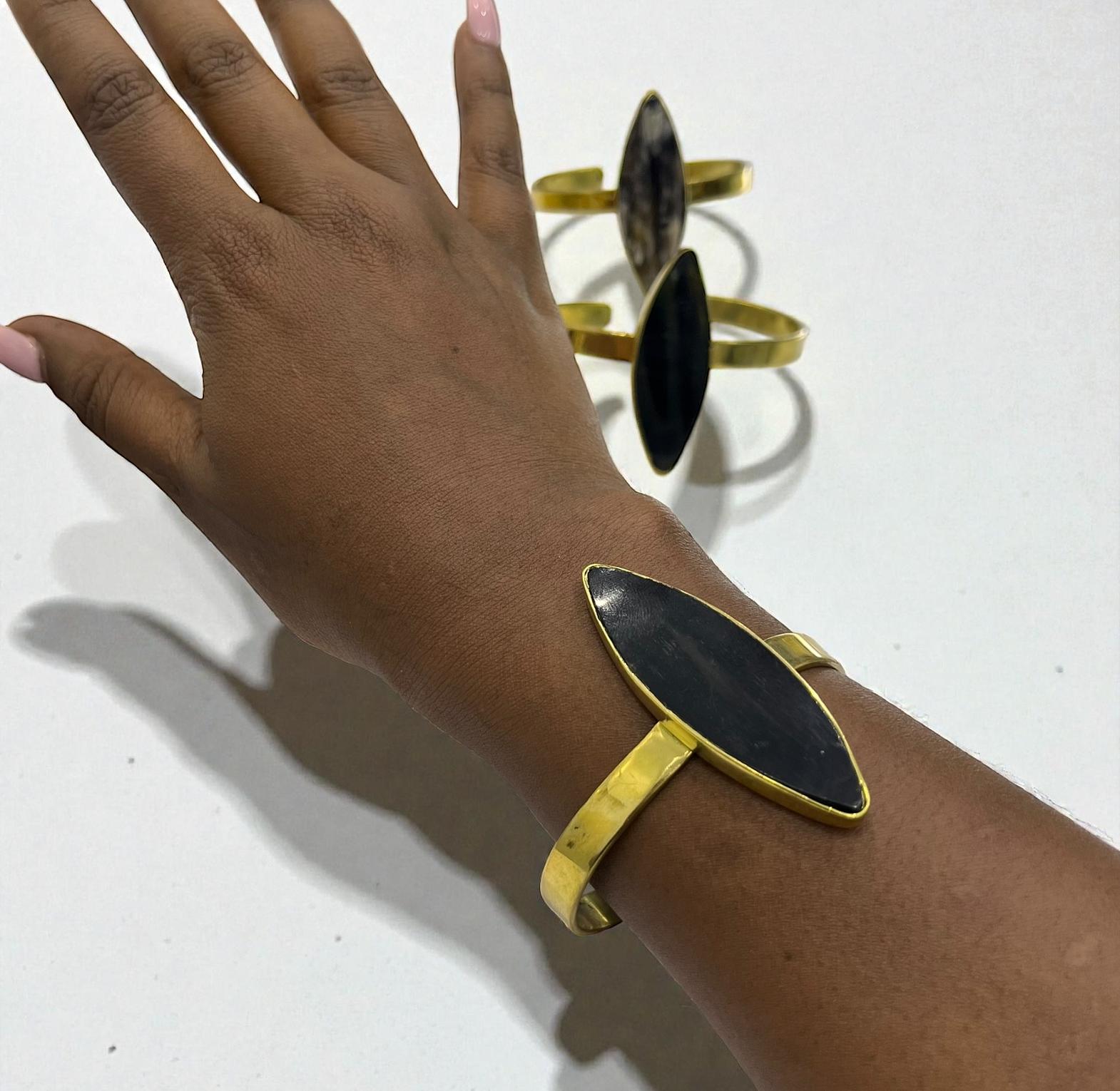 This is an adjustable brass cuff bracelet featuring a black,oval-shaped center stone,handcrafted in Kenya.