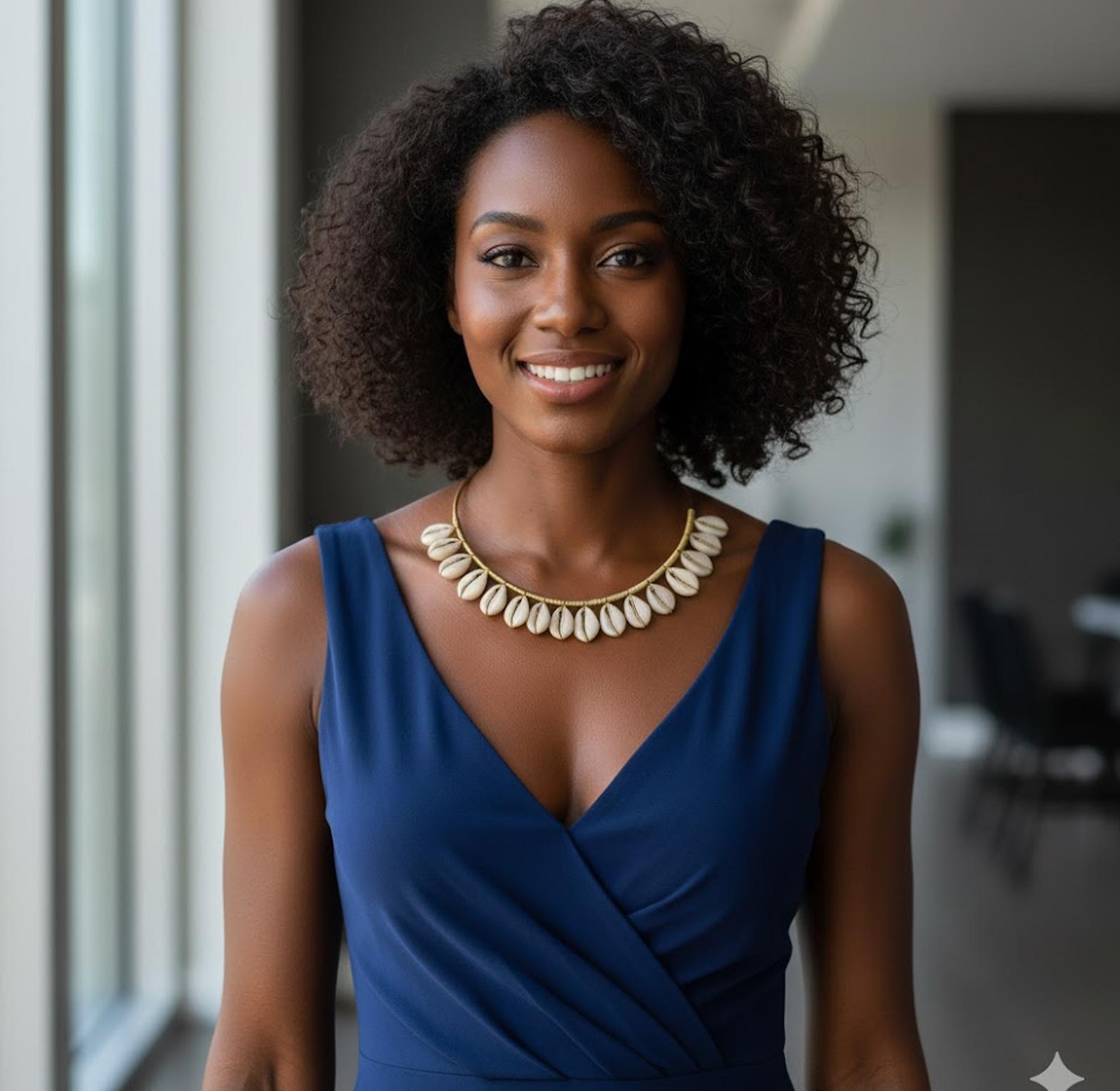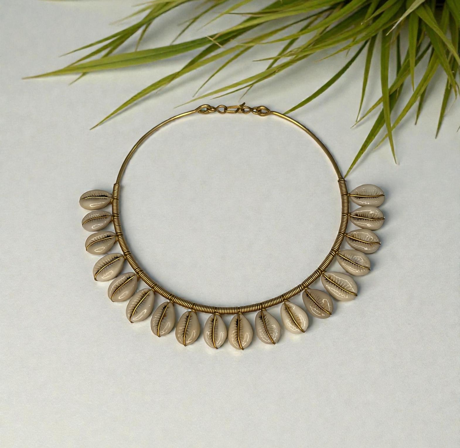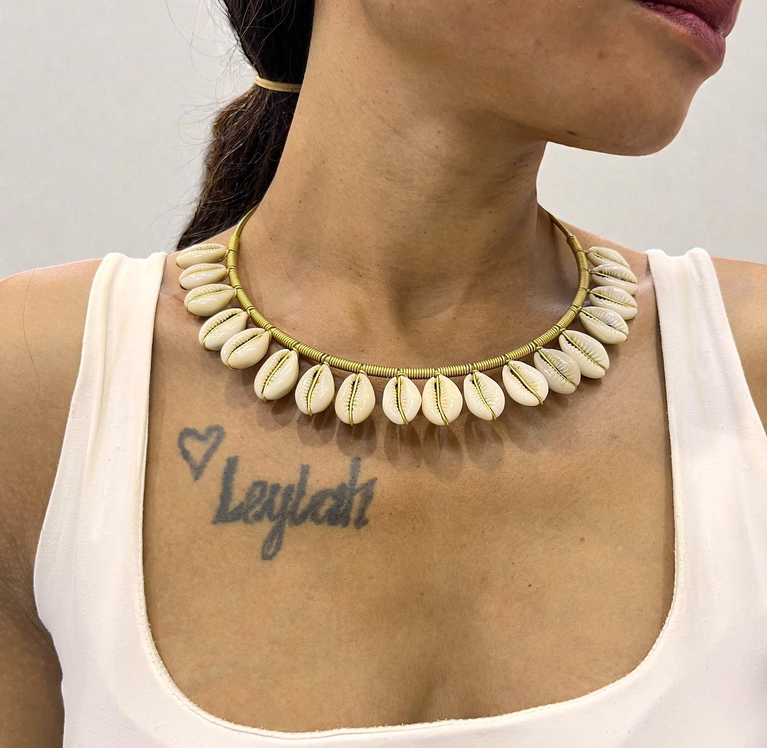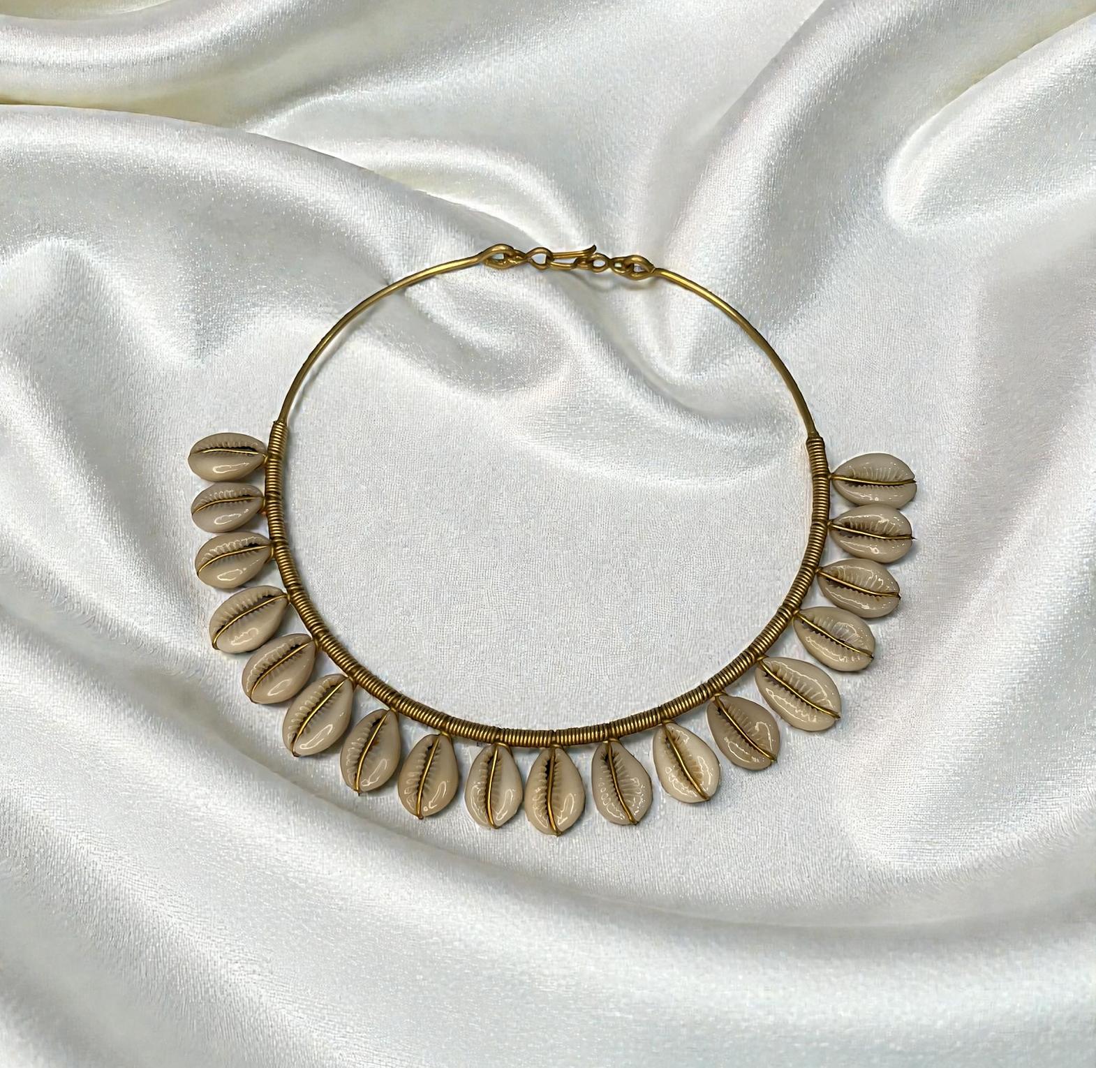 This is a boho cowrieshell choker featuring natural cowrie shells strung along a sleek gold-toned wire.