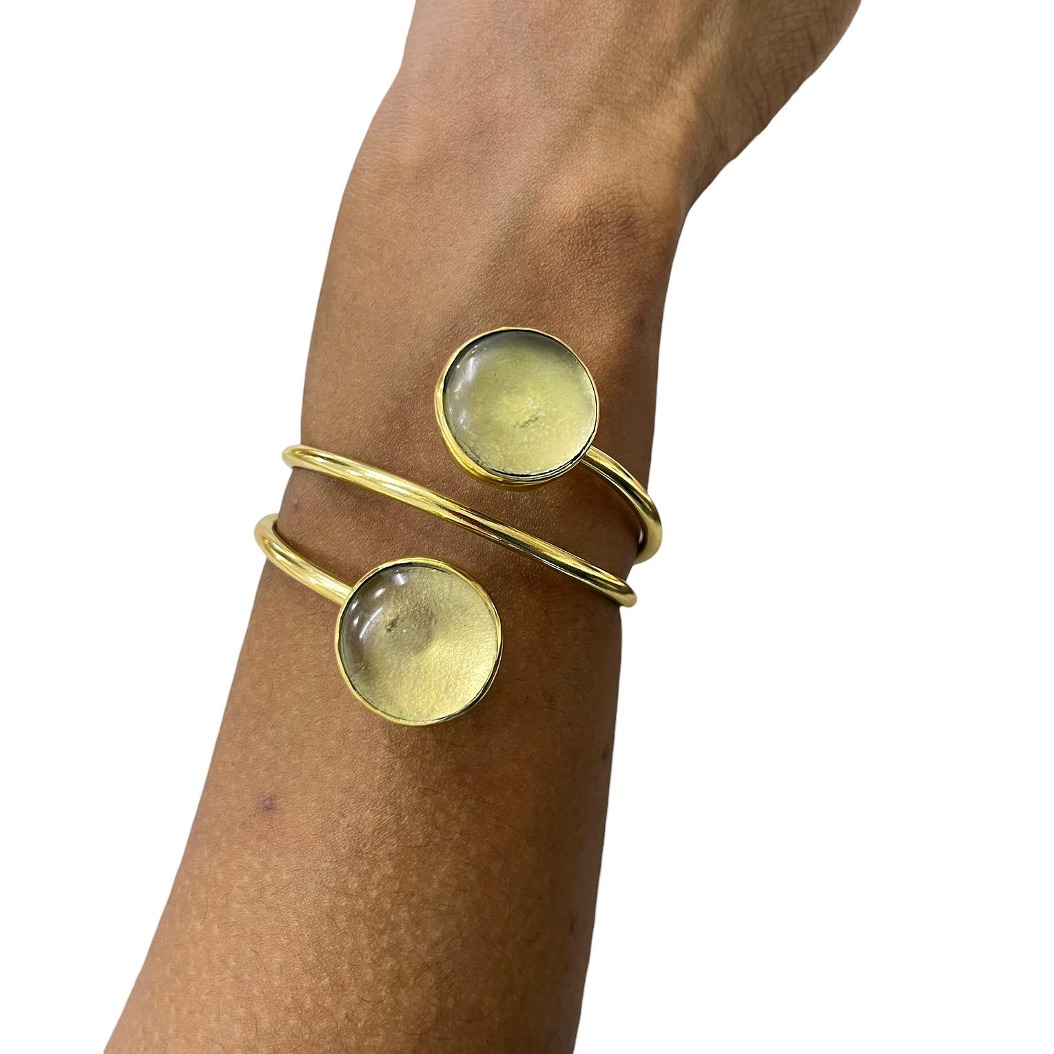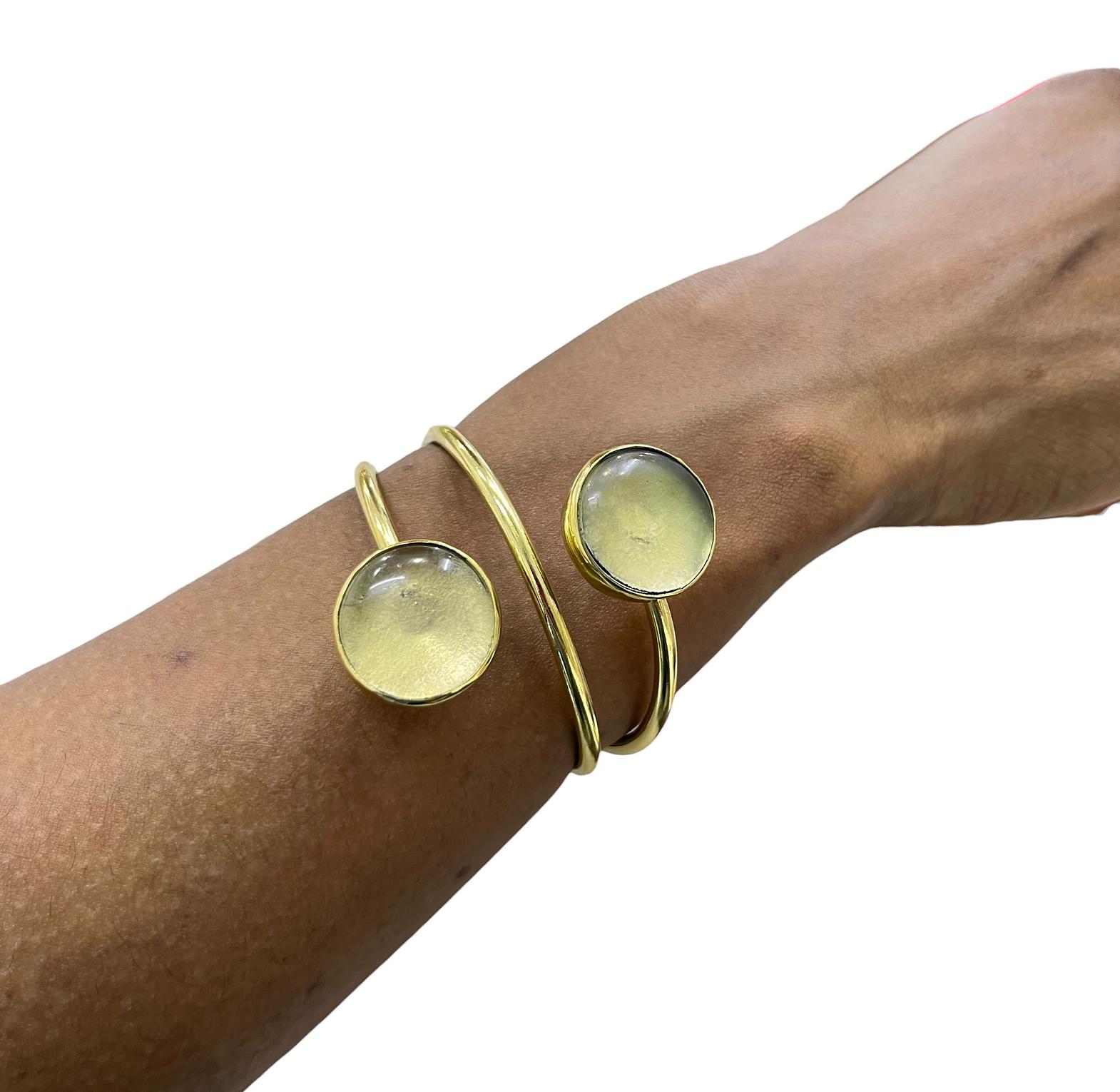 Bypass bracelet is a cuff design with circular gemstone or decorative settings at each end.