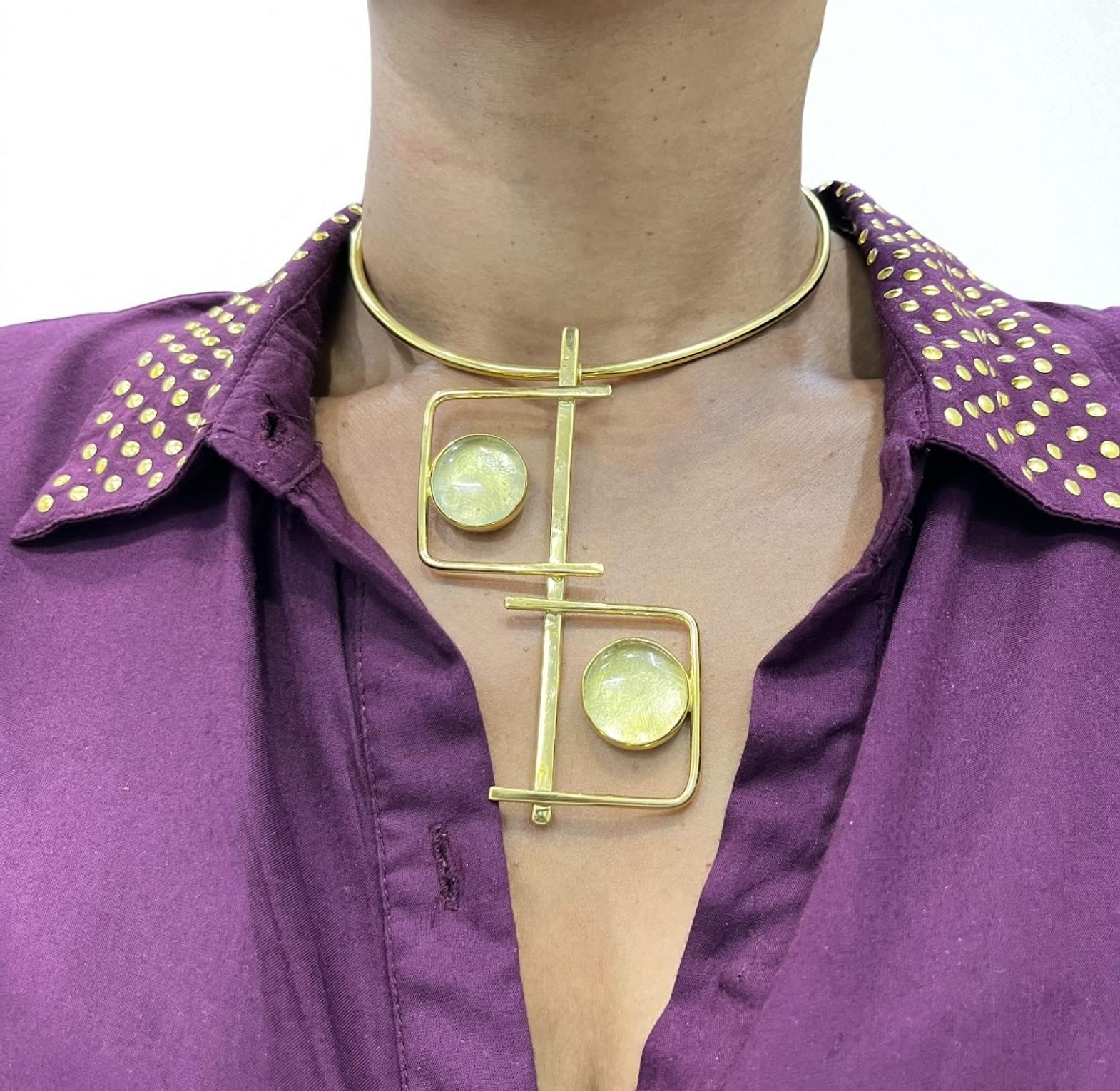 Collar brass choker appears to be a unique,desingner piece likely made of brass with white stone or glass bead elements.