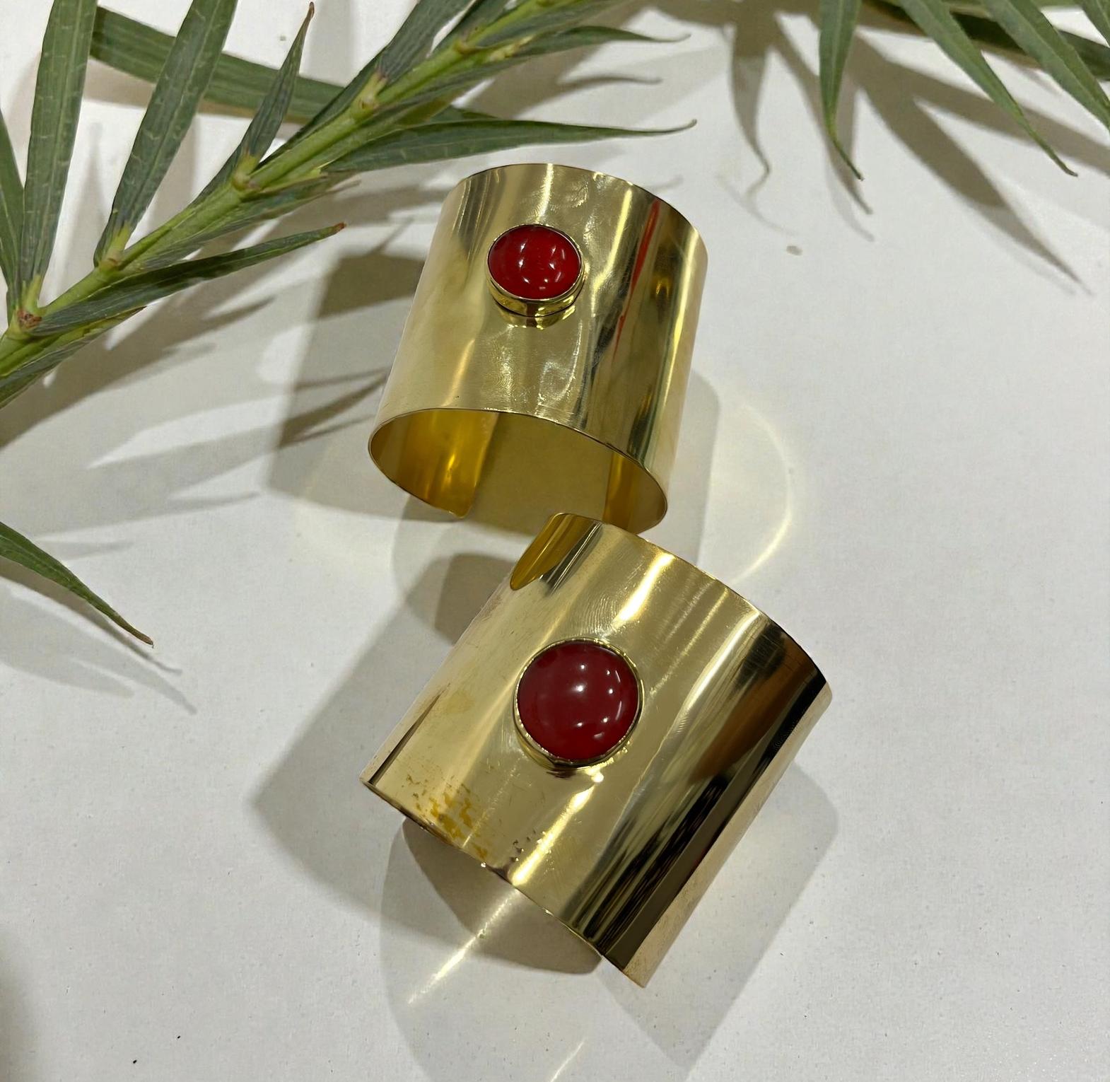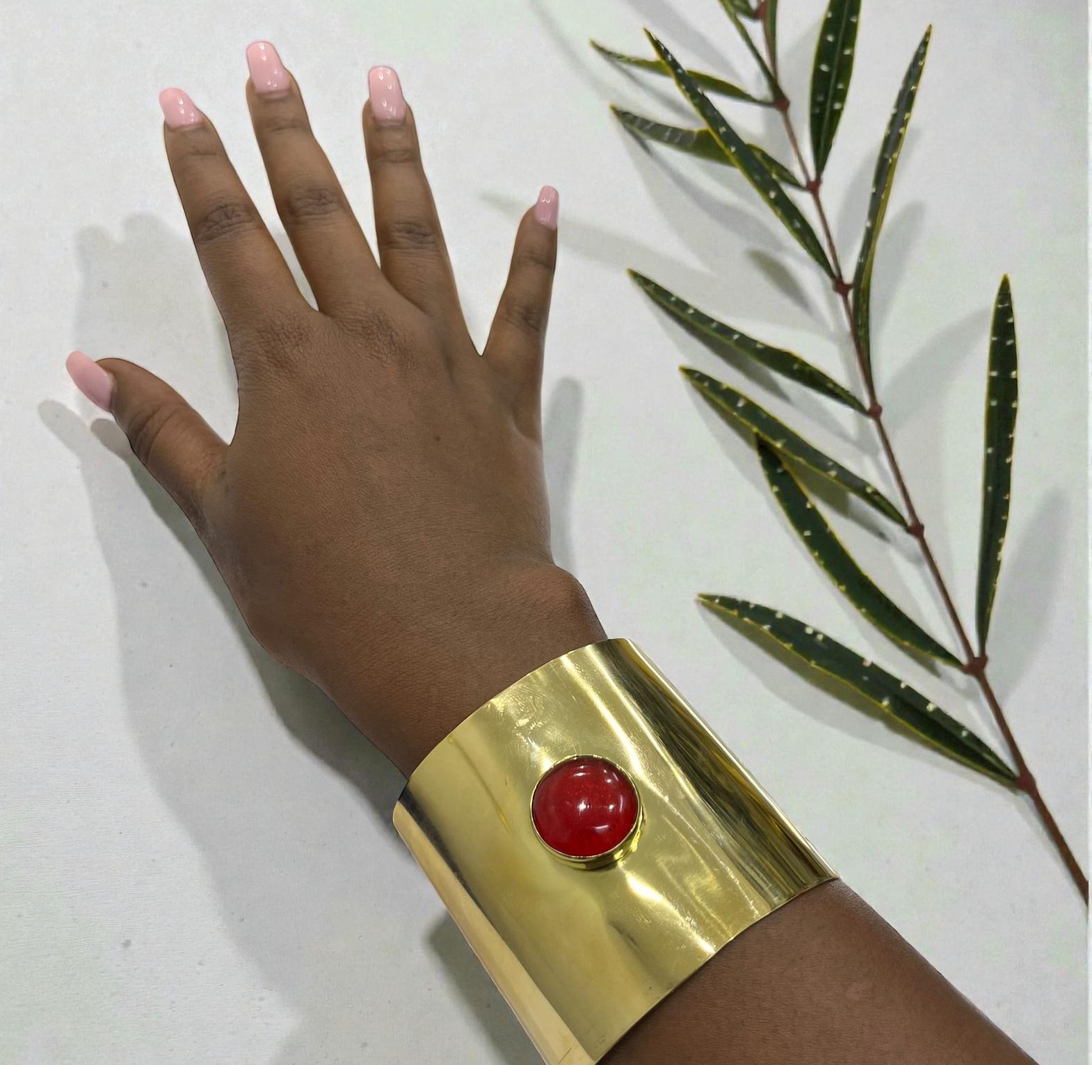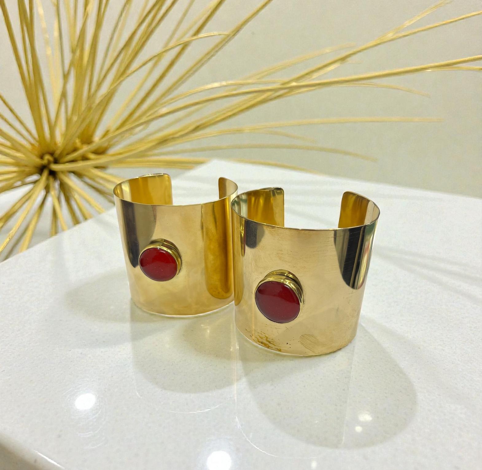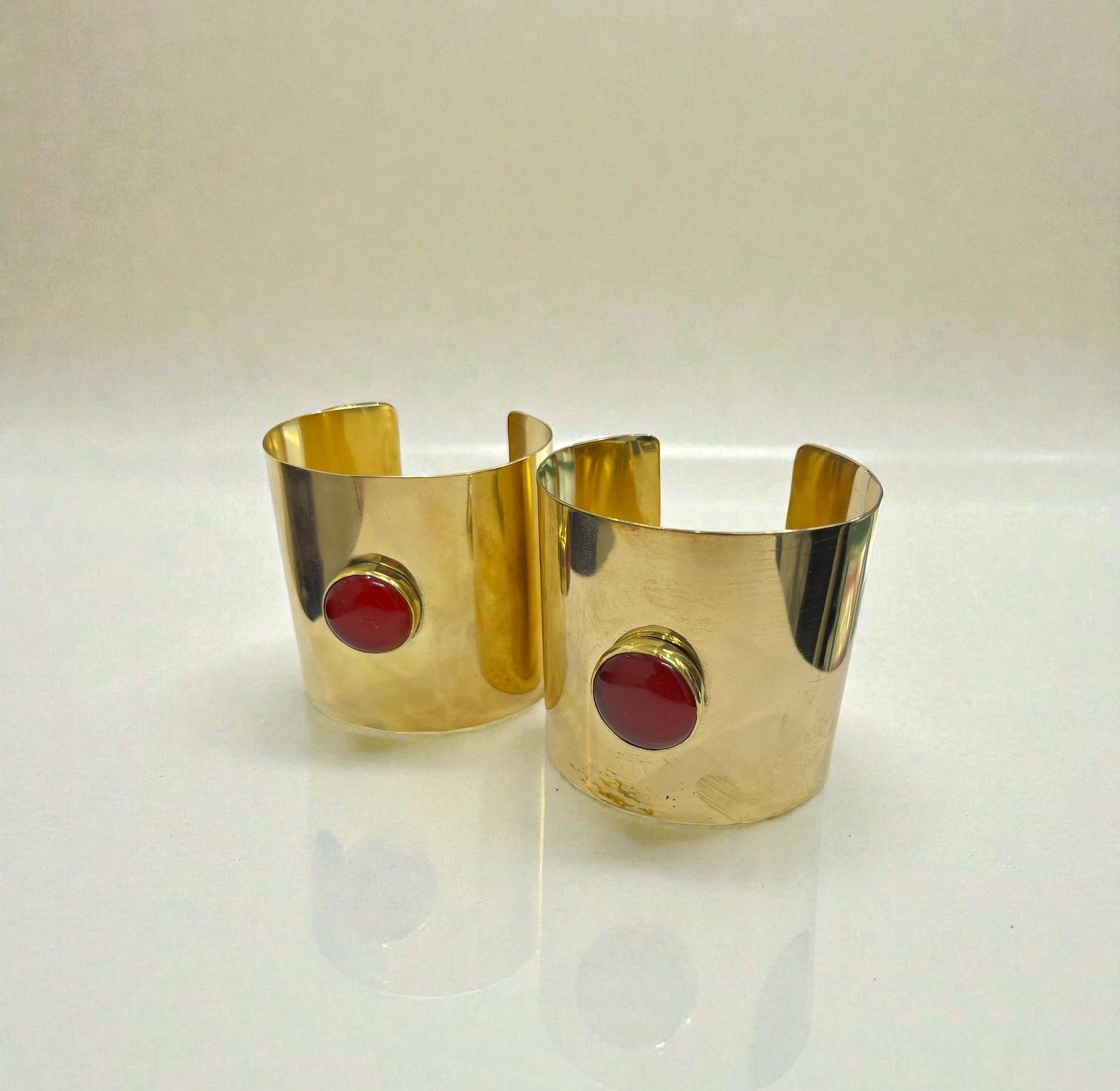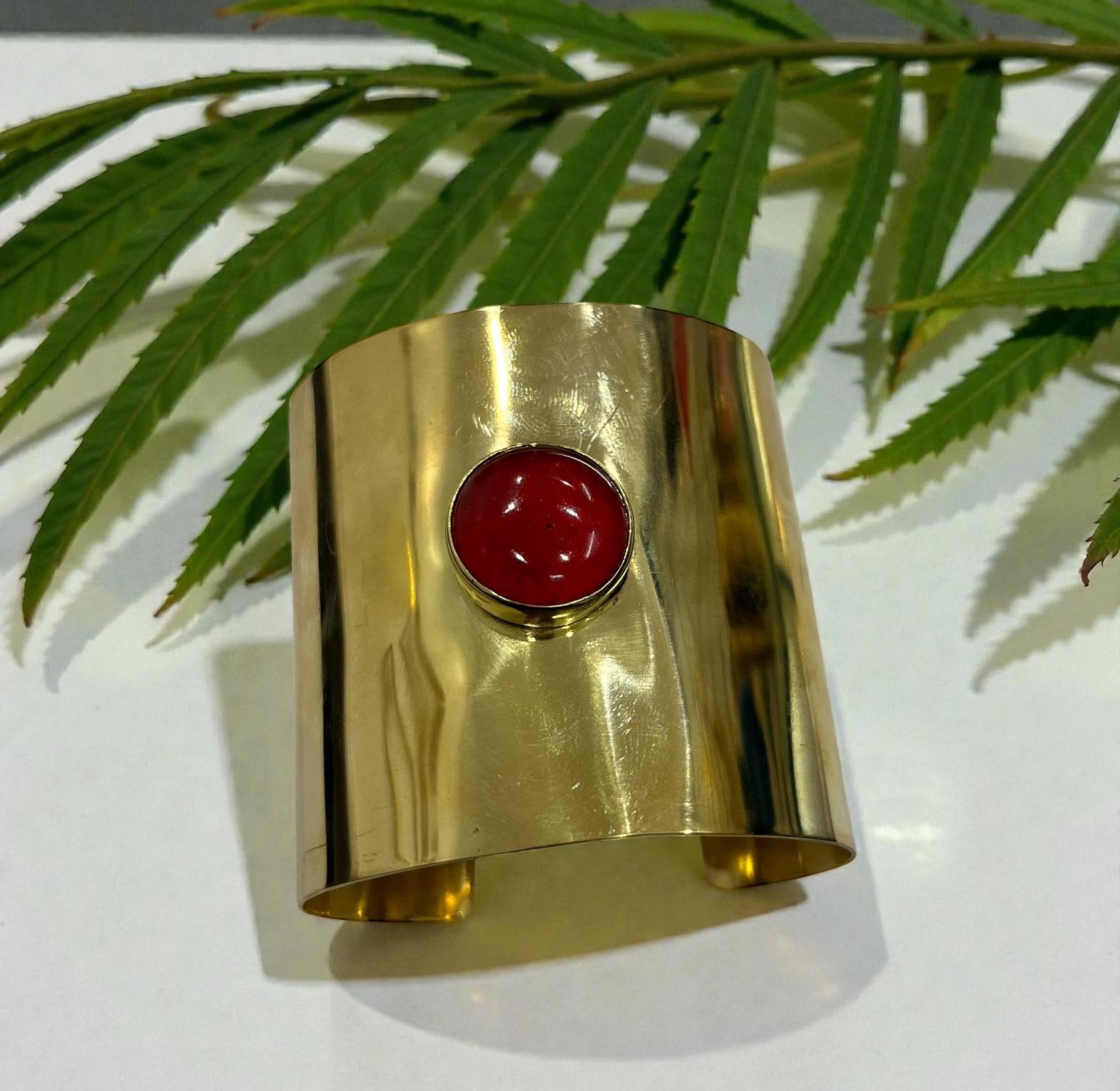 The bracelete is characterized by a wide polished metal cuff in a gold tone,consistent with the modernist or brutalist style popular in the 1970s.