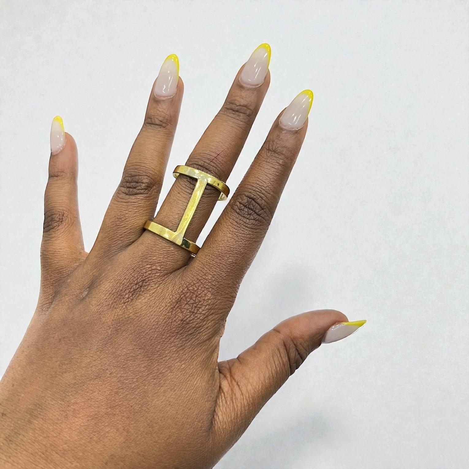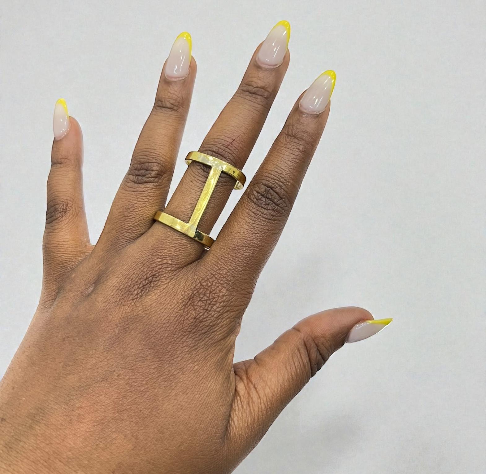 The design is a bold,chunky,and open-ended band featuring a prominent horizontal bar crossing a vertical bar,forming a 'T'shape.