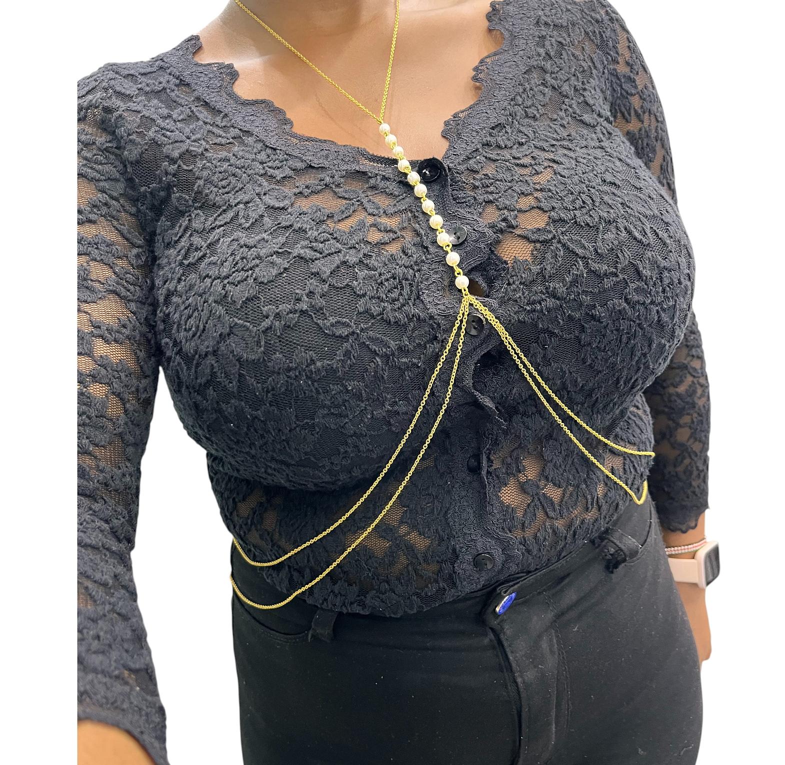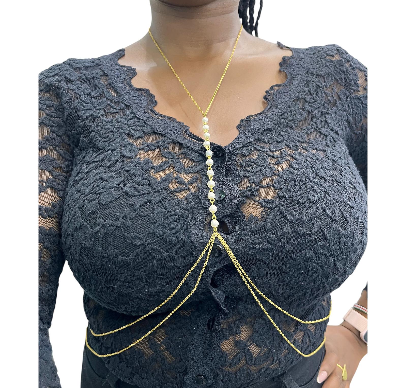 Our dainty pearl body chain, handcrafted with luminous pearls and warm brass, is made for the woman who loves subtle luxury with a bold heart.