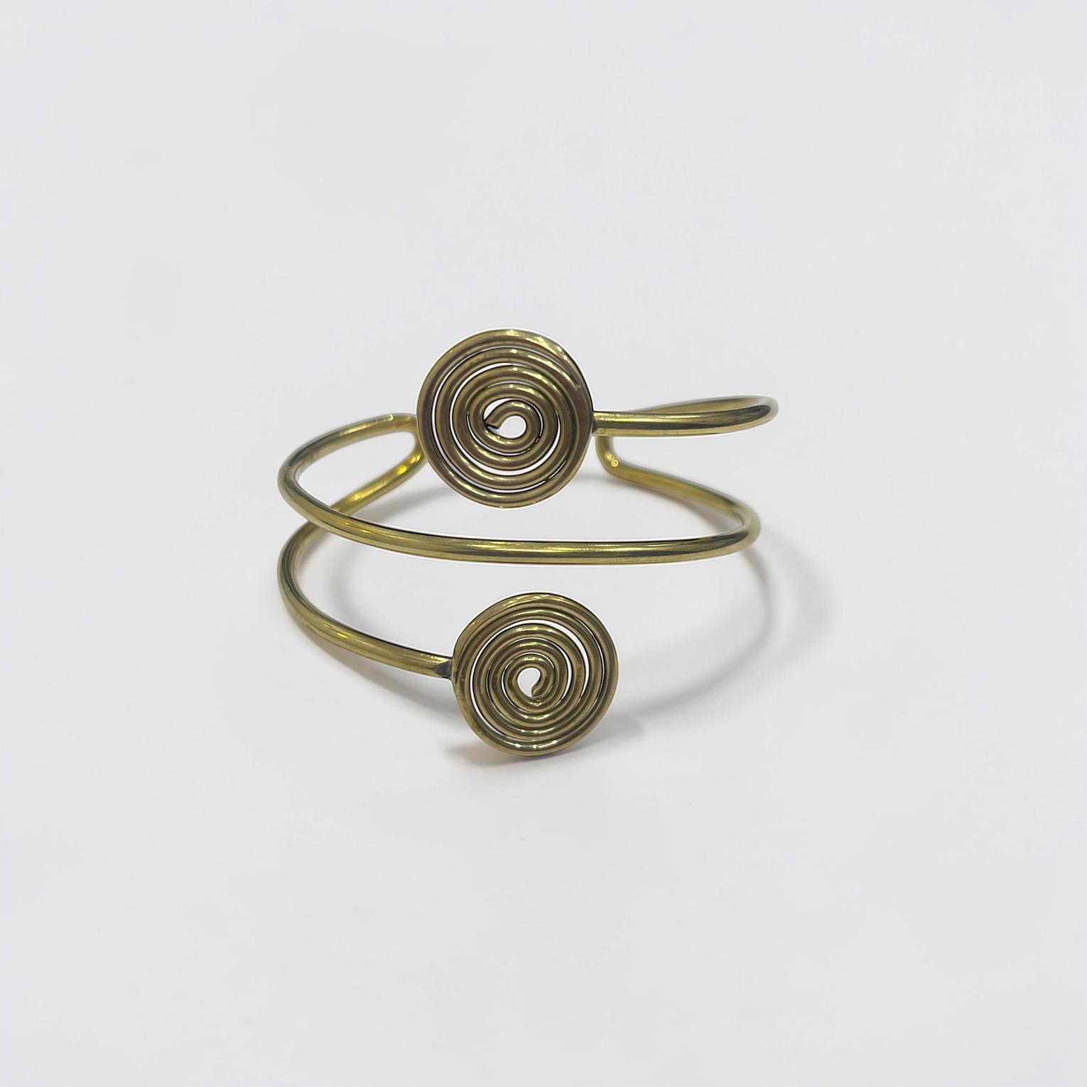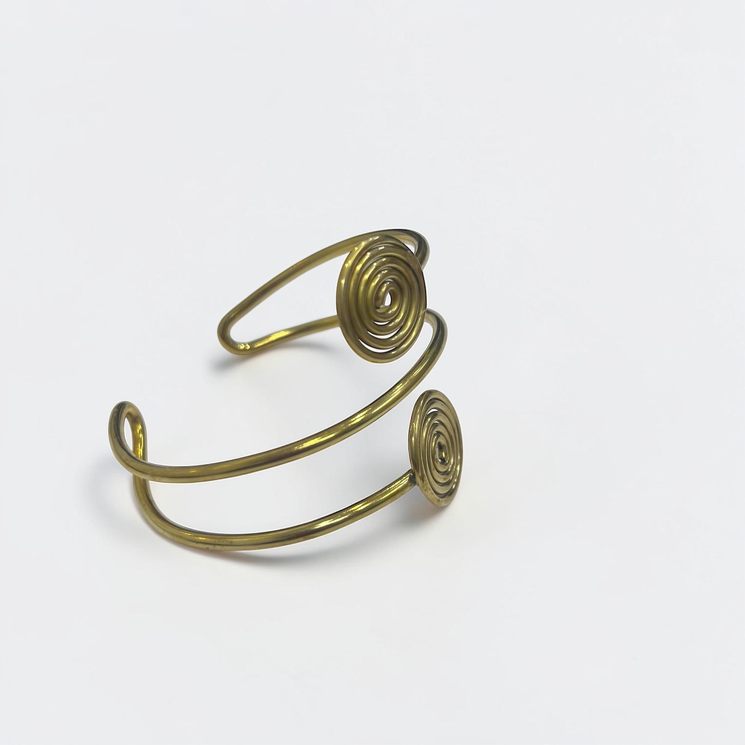 The style piece is a Double Spiral Arm Cuff,a popular accessory often handcrafted from brass or gold-plated metal.Its adjustable and minimalist design.