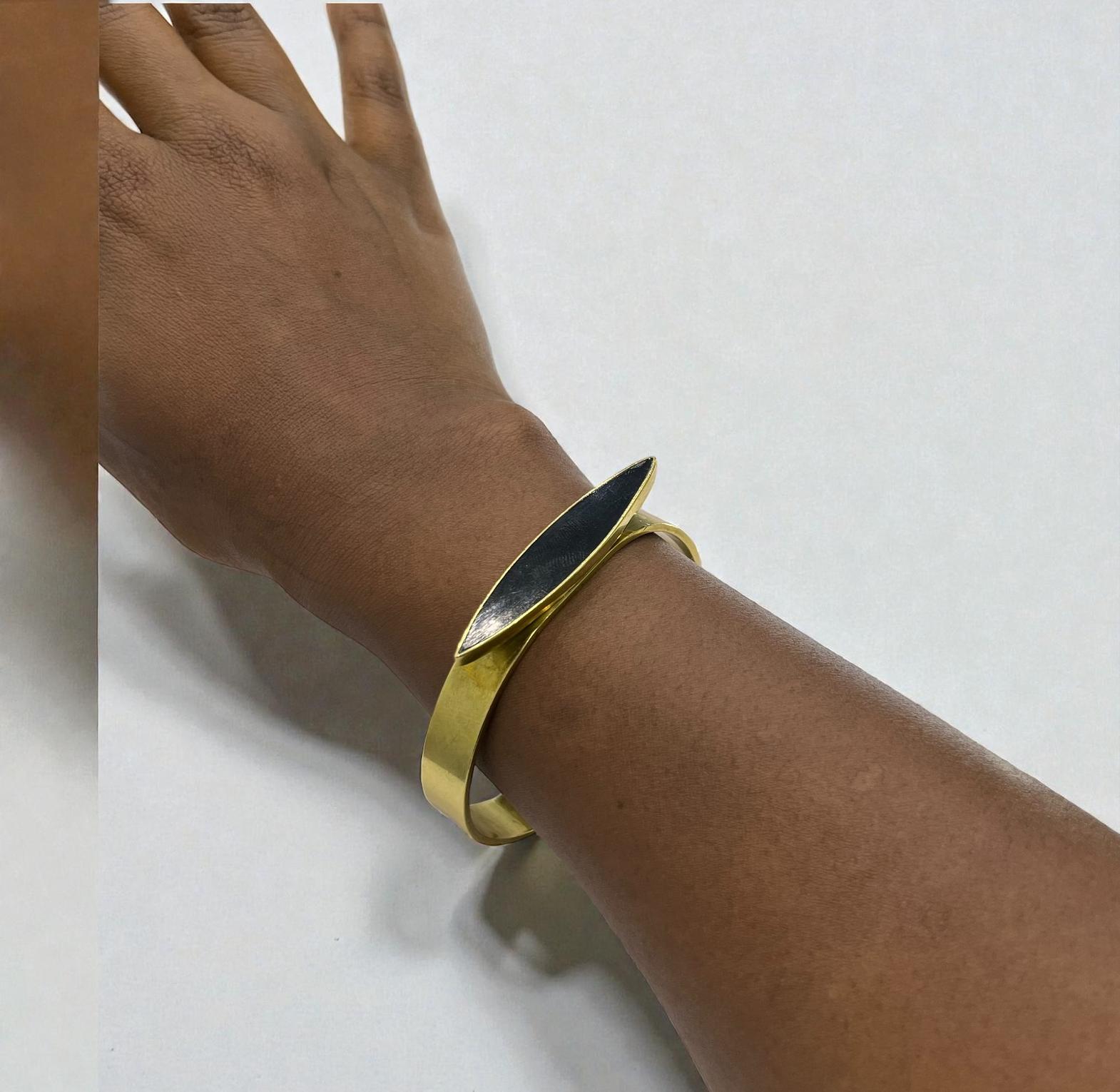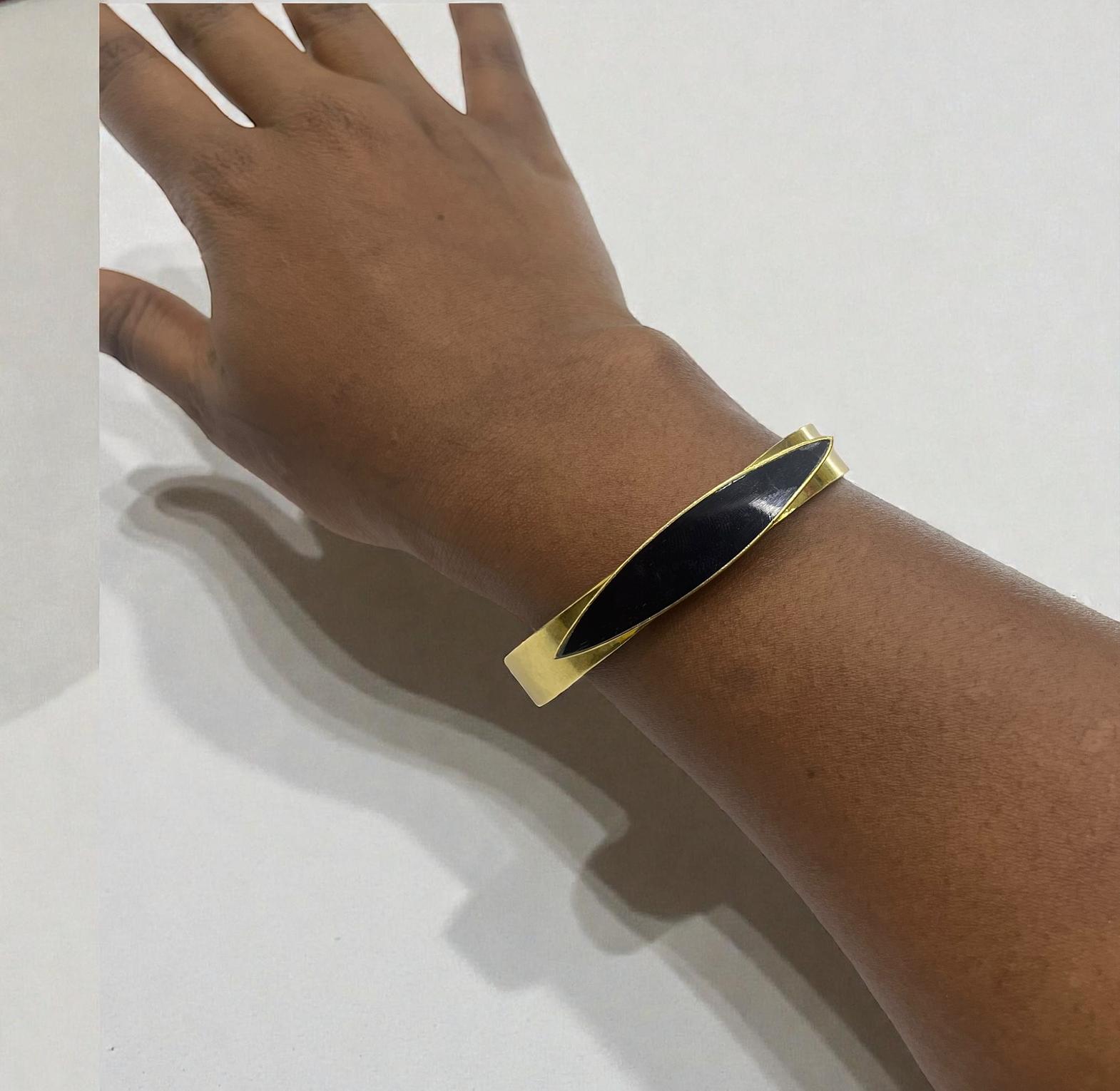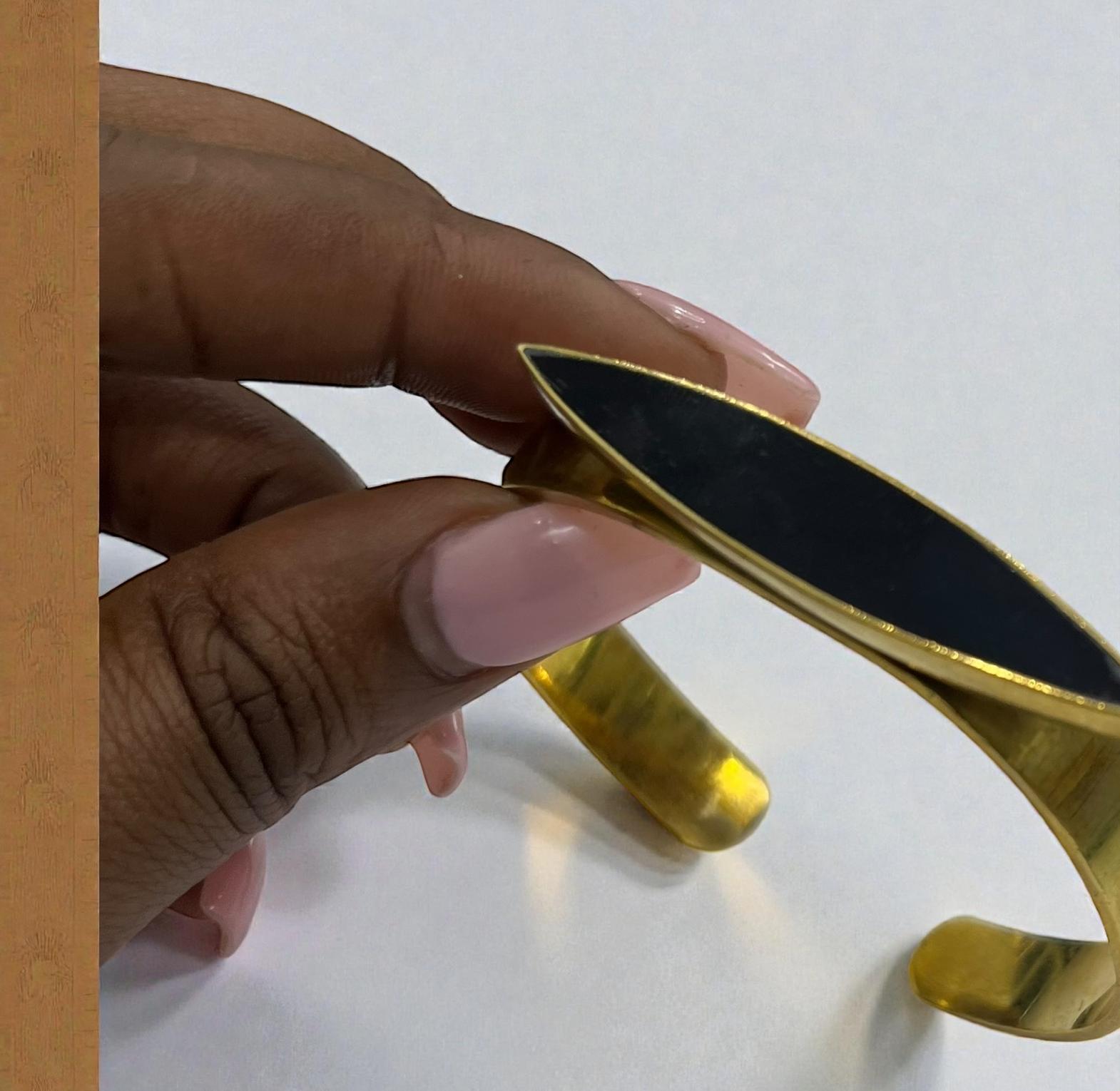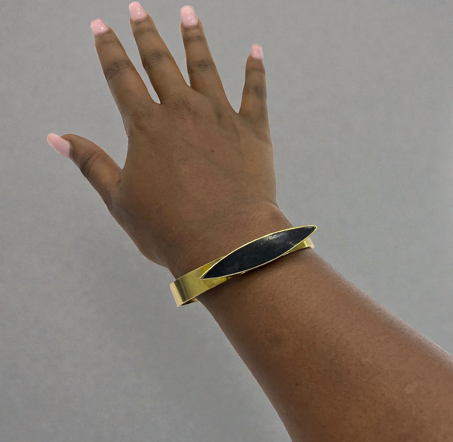 It is described as brass cuff bracelete featuring a sleek;eye-catching black bone inlay shaped in delicate crescent.