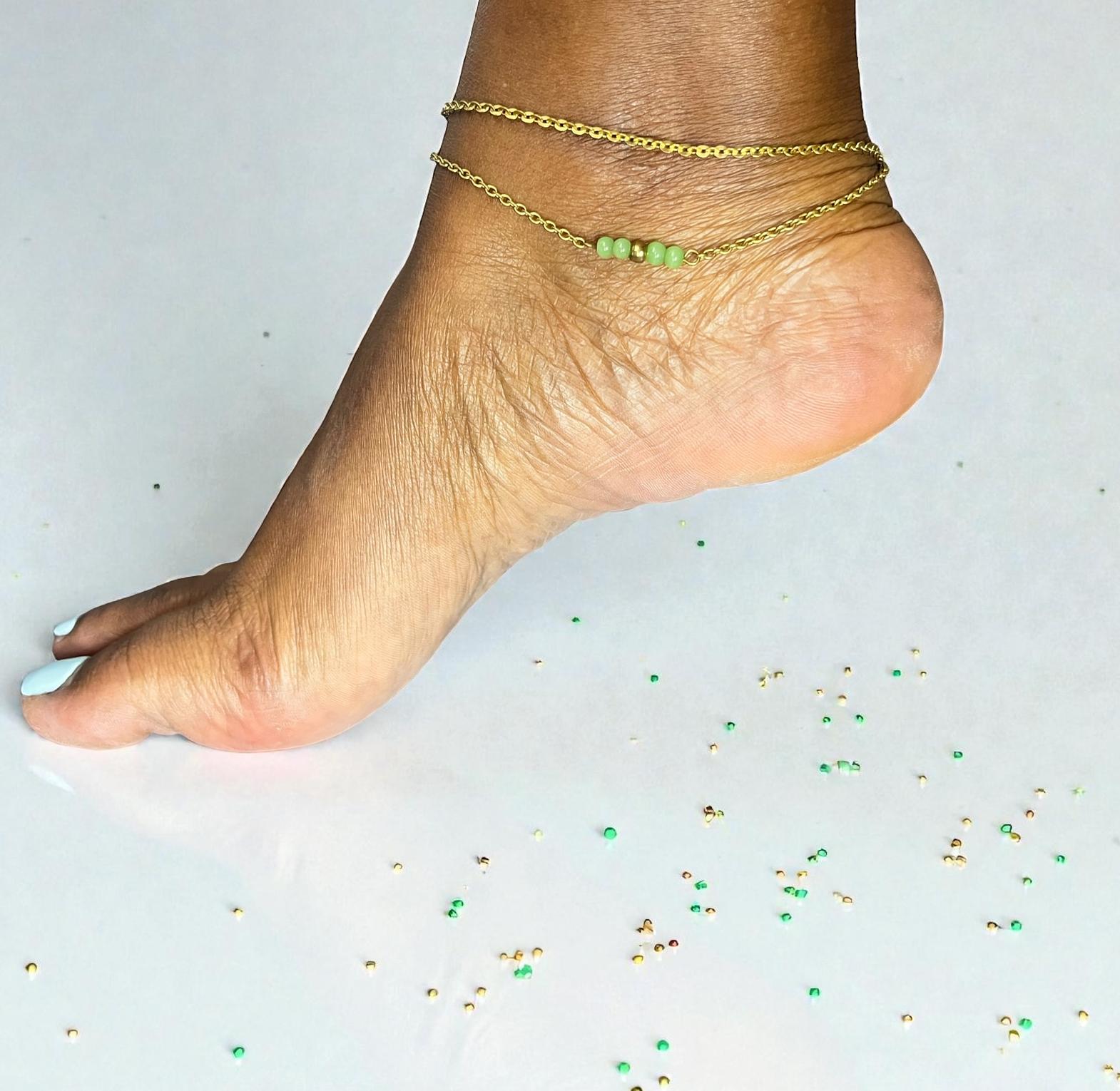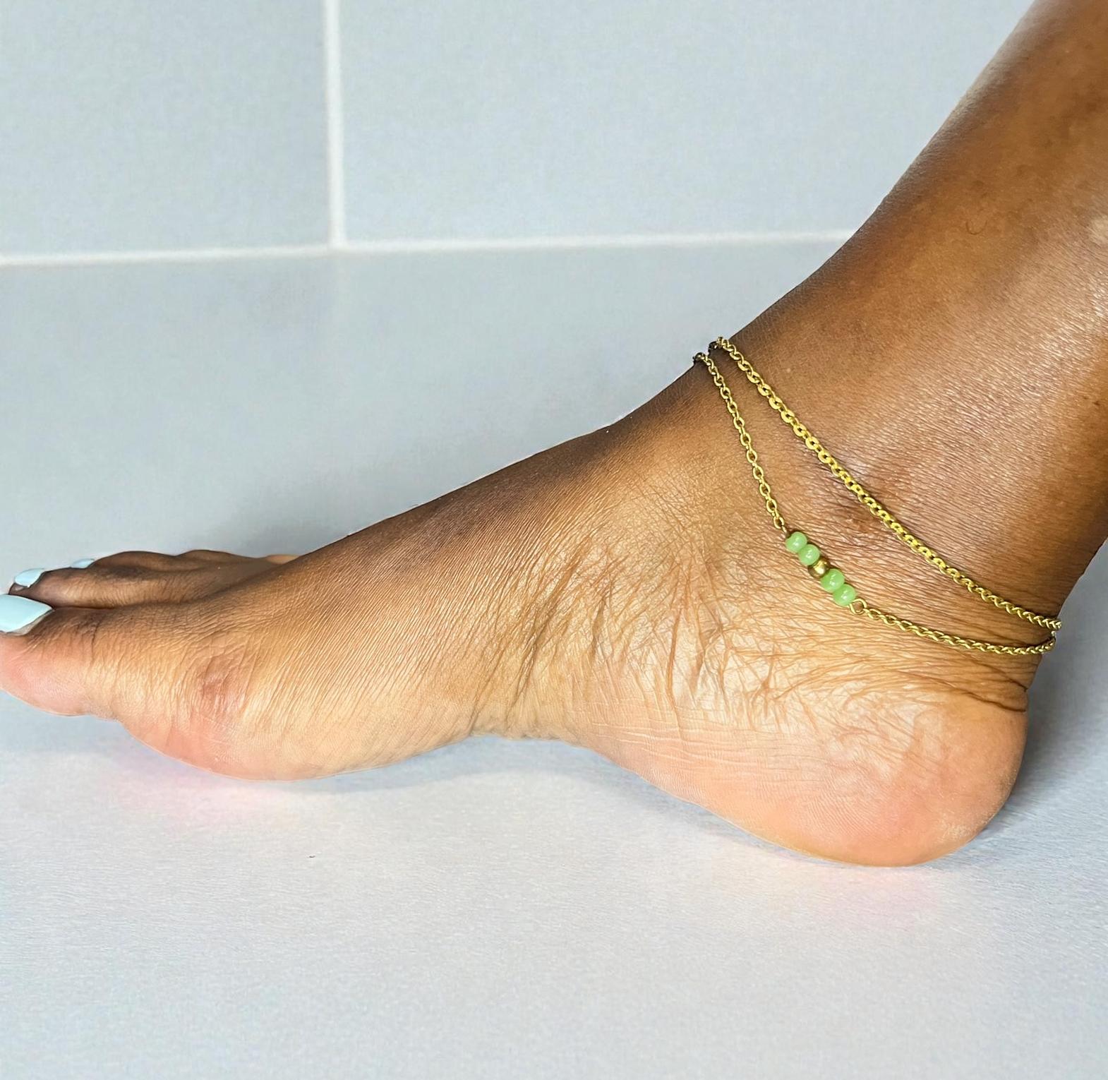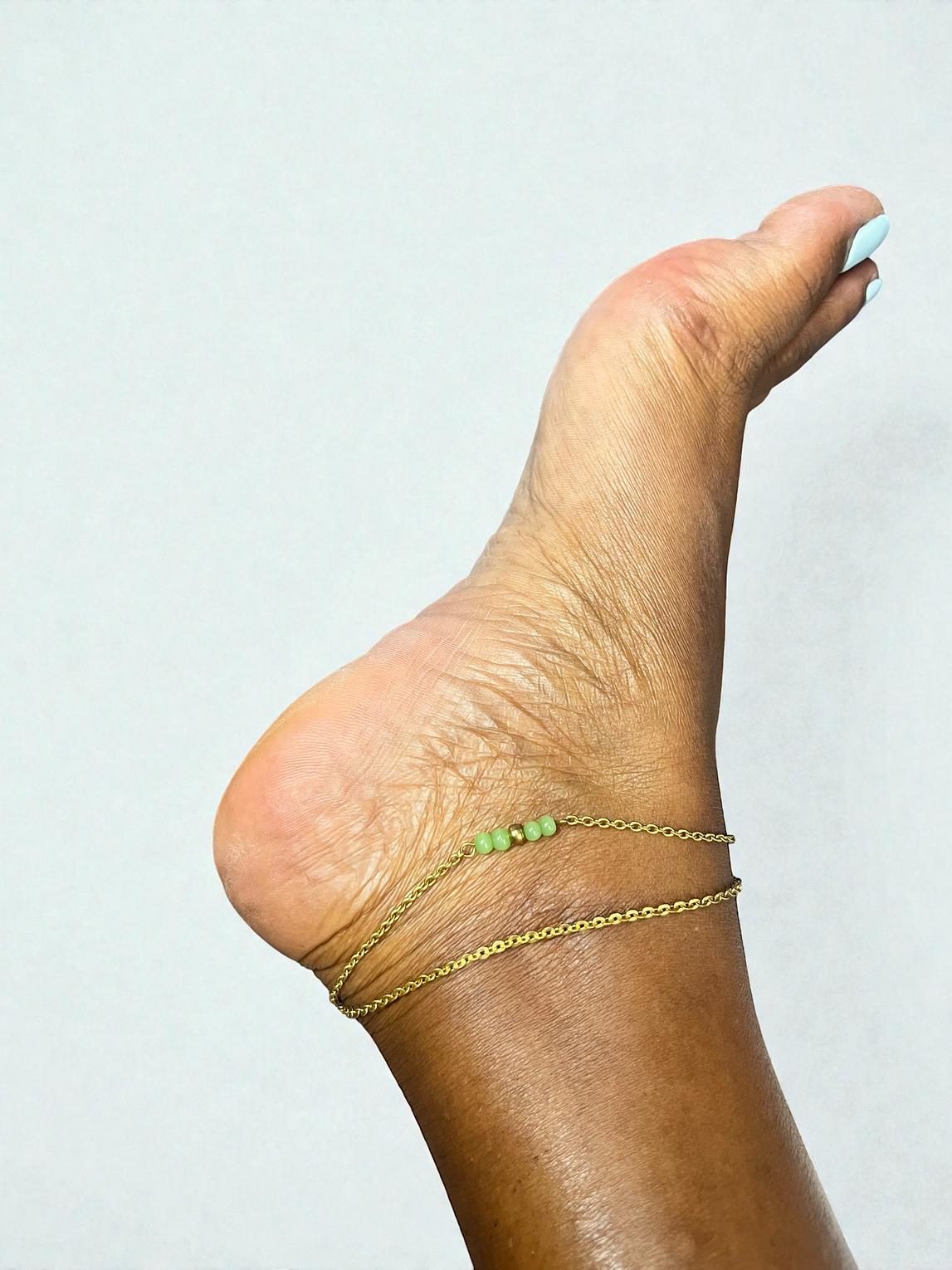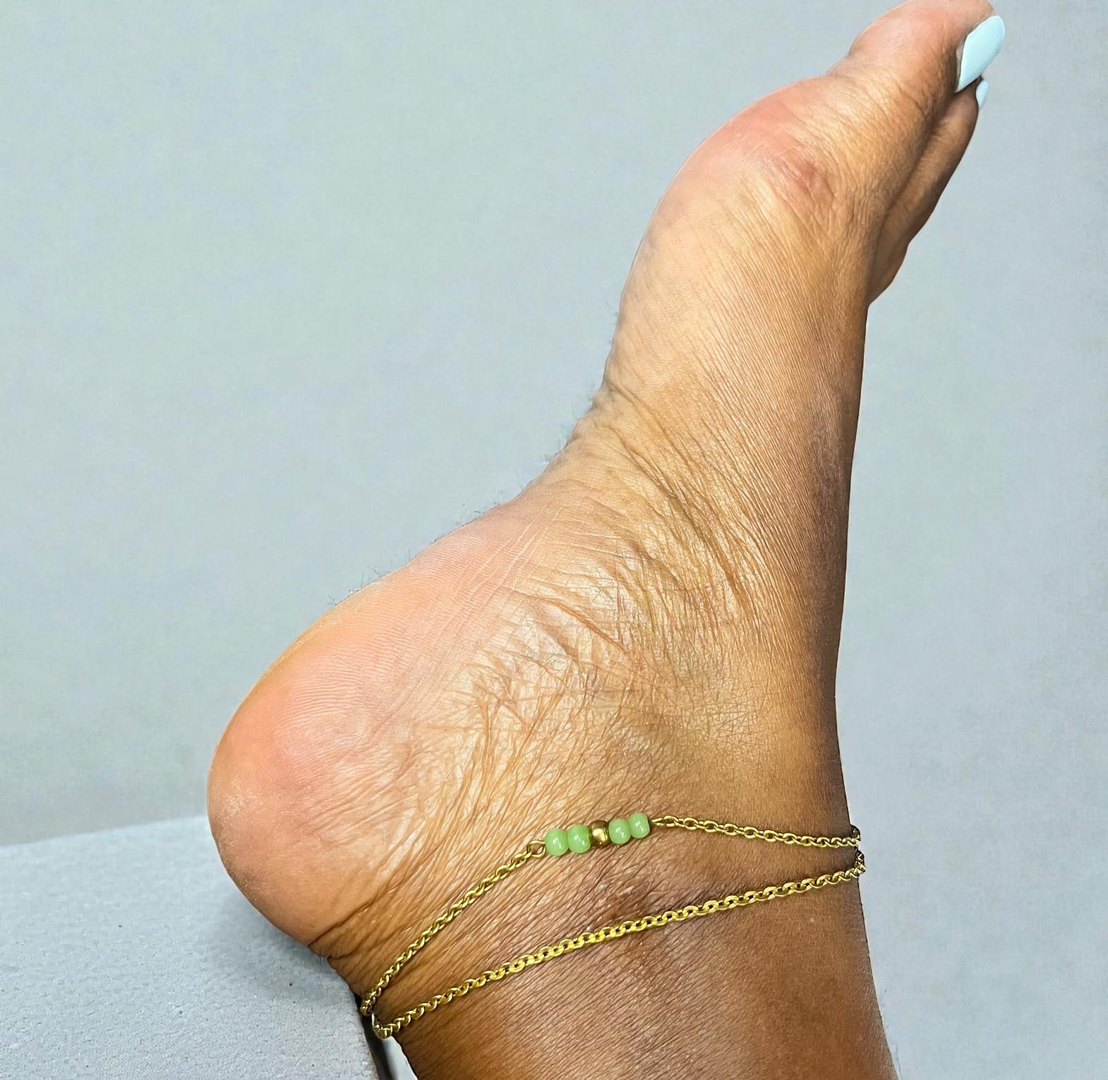 The piece appears to be a double-layered anklet.one layer consists of a simple chain,while the other features a central bar of three or four green beads