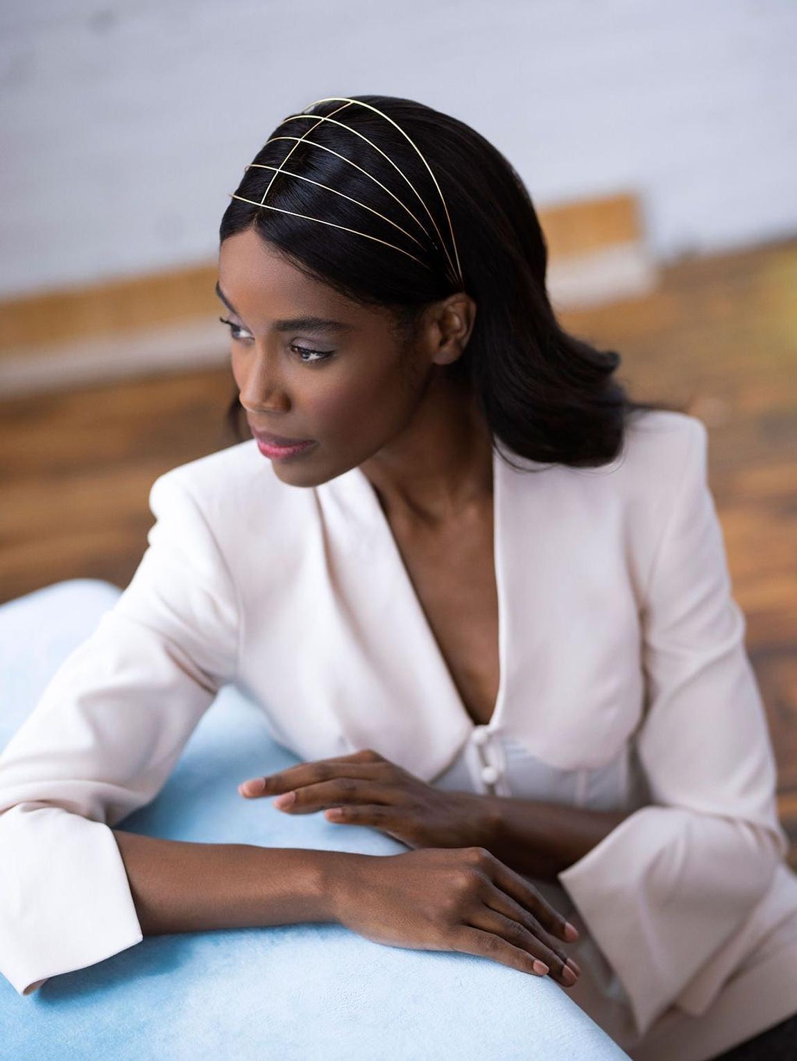 This headband it appears to be made of a reflective material,likely metal or metallic thread/wire witha a bright gold finish.