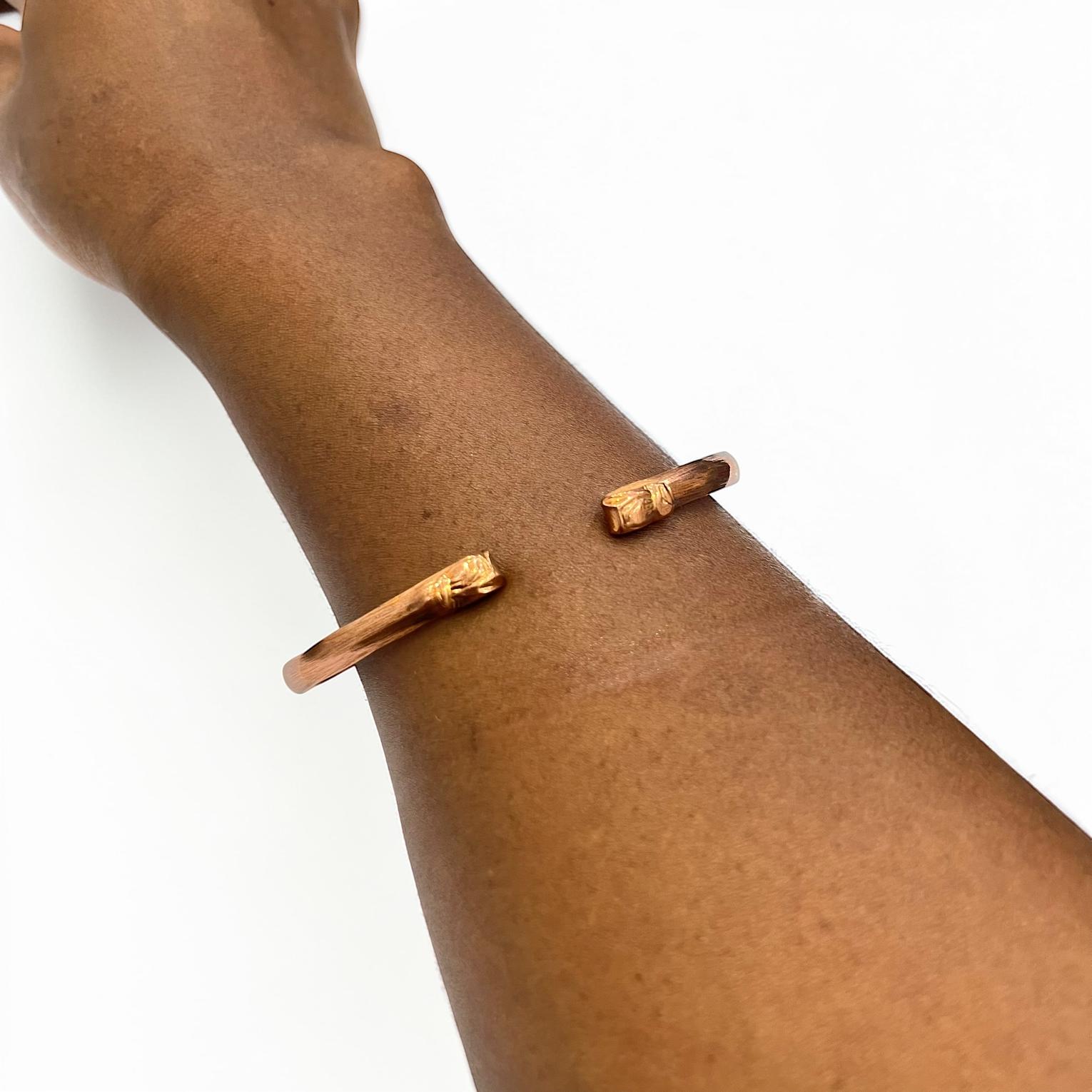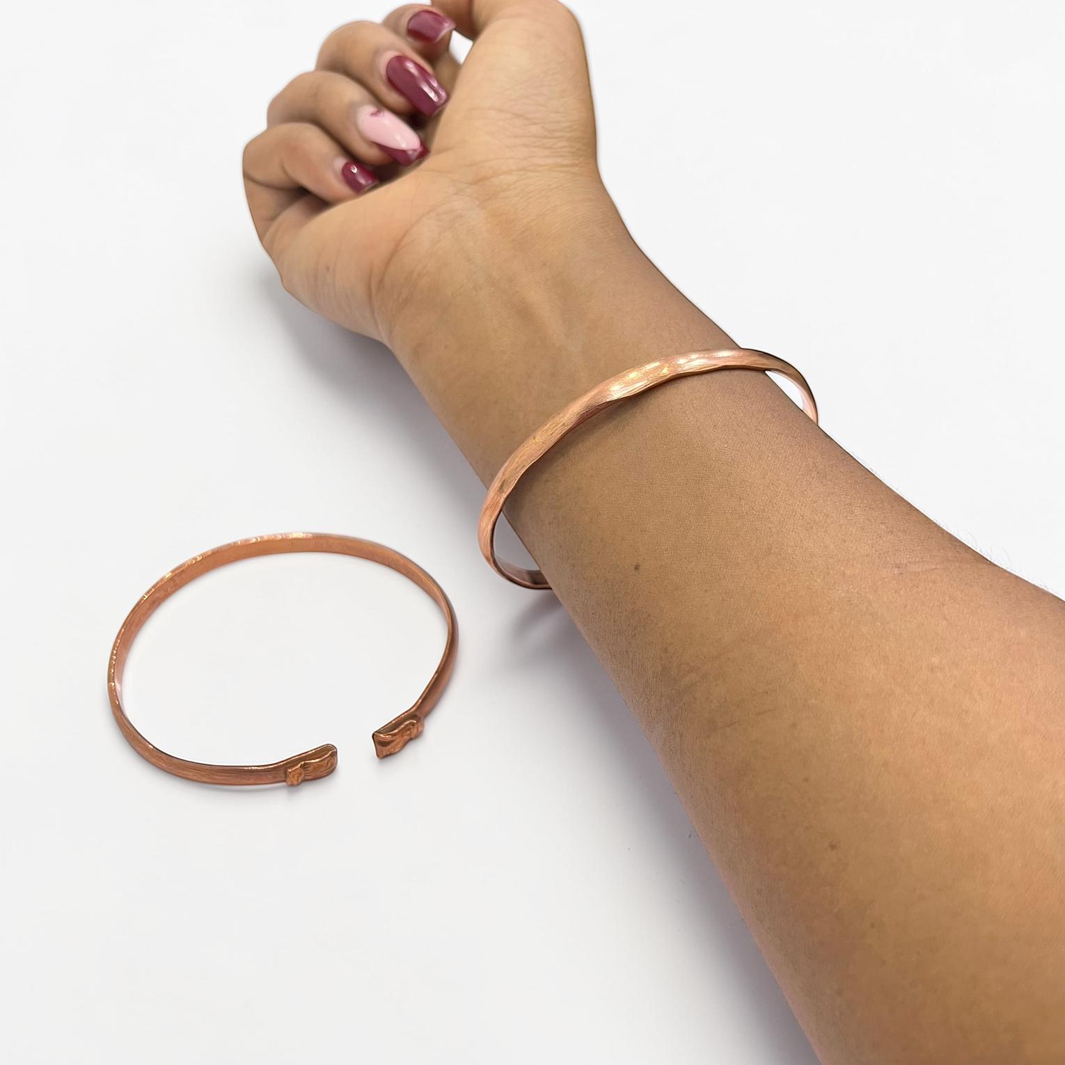 This image features a handmade copper bangle bracelet,often worn for its rustic aesthetic or potential therapeutic benefits.