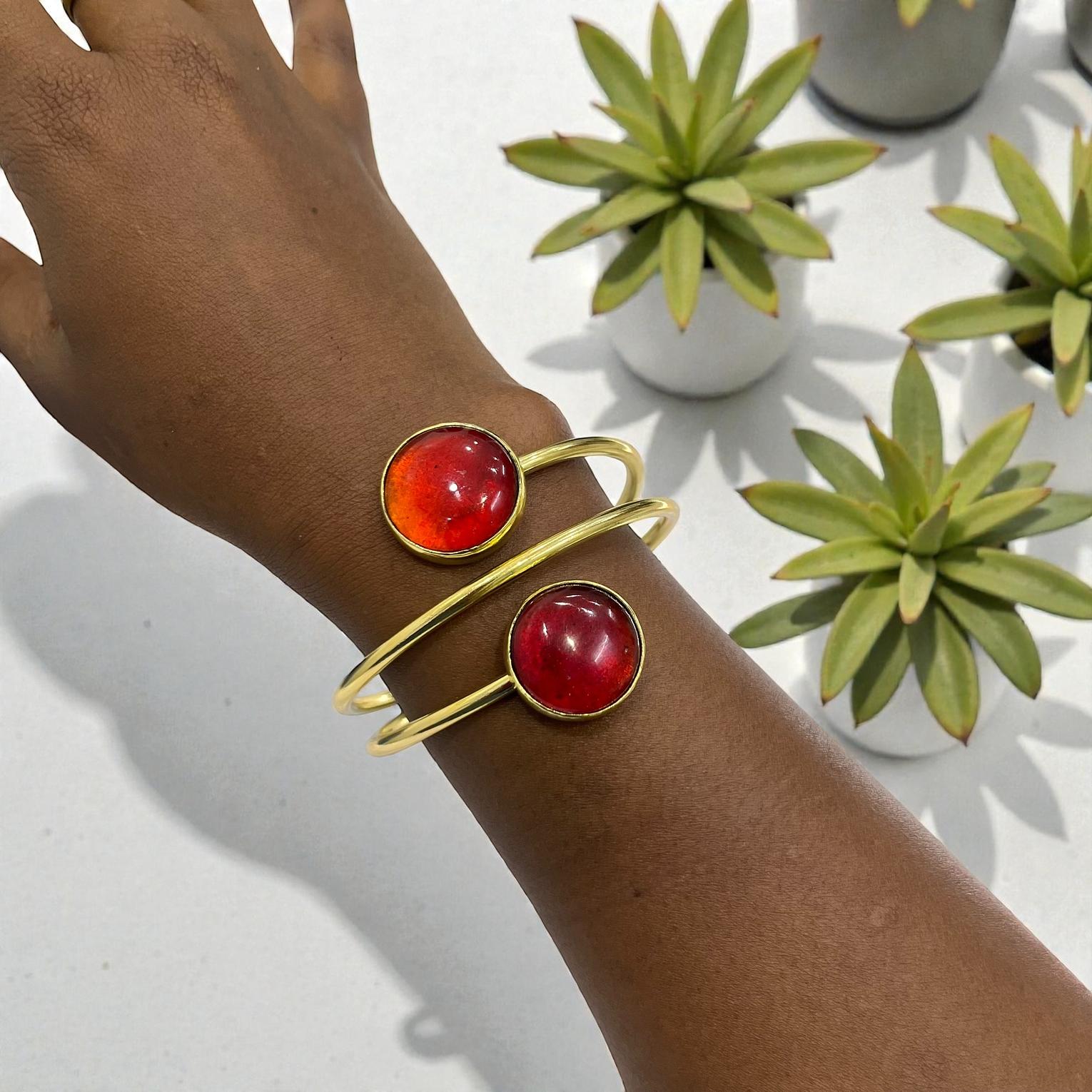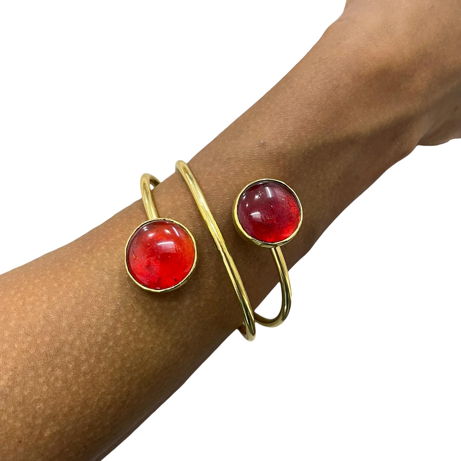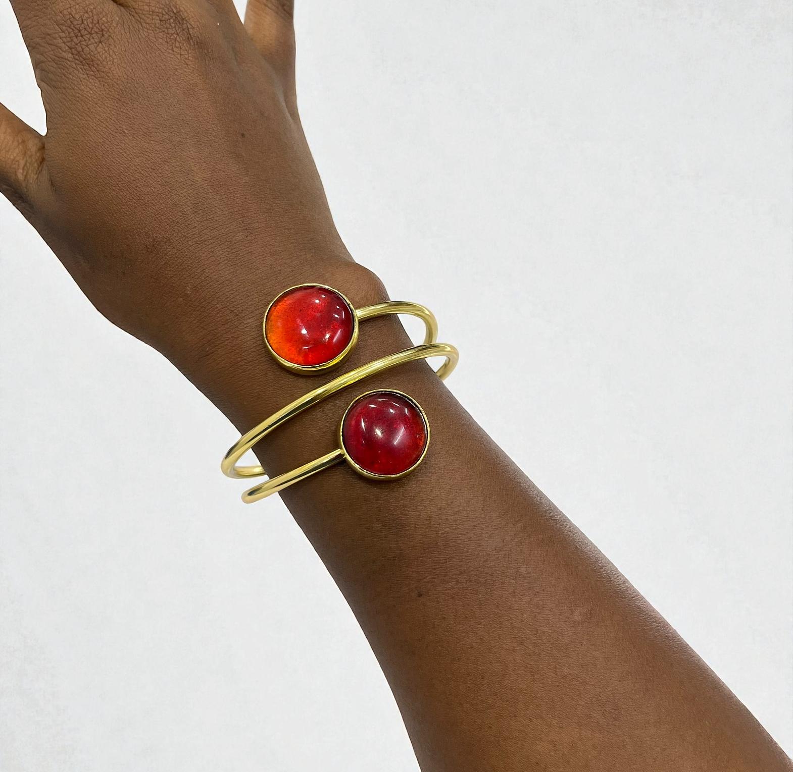 This stylish accessory is a open bangle,often handcrafted frommaterial like brass and featuring vibrant gemstones or glass elements.