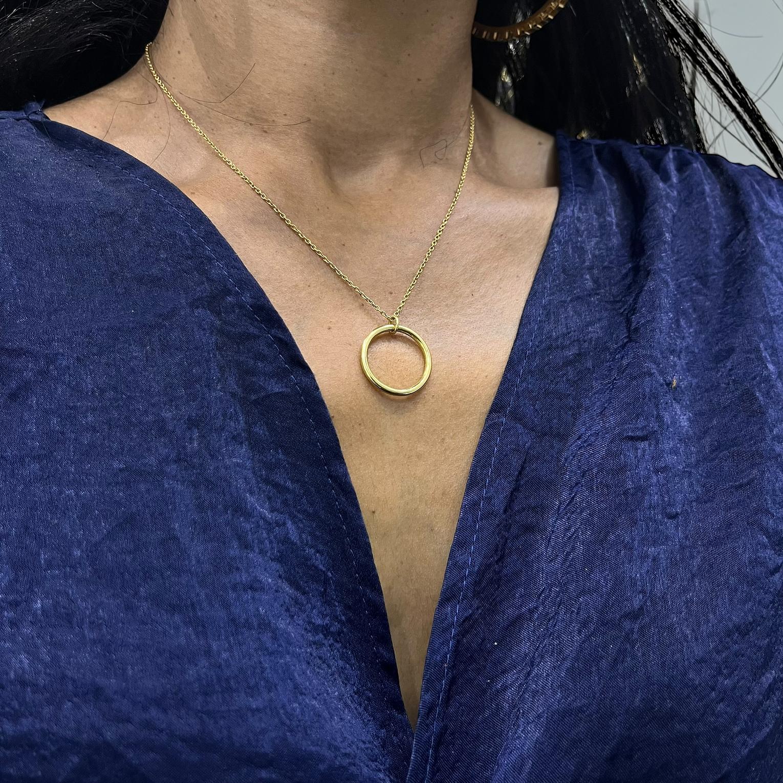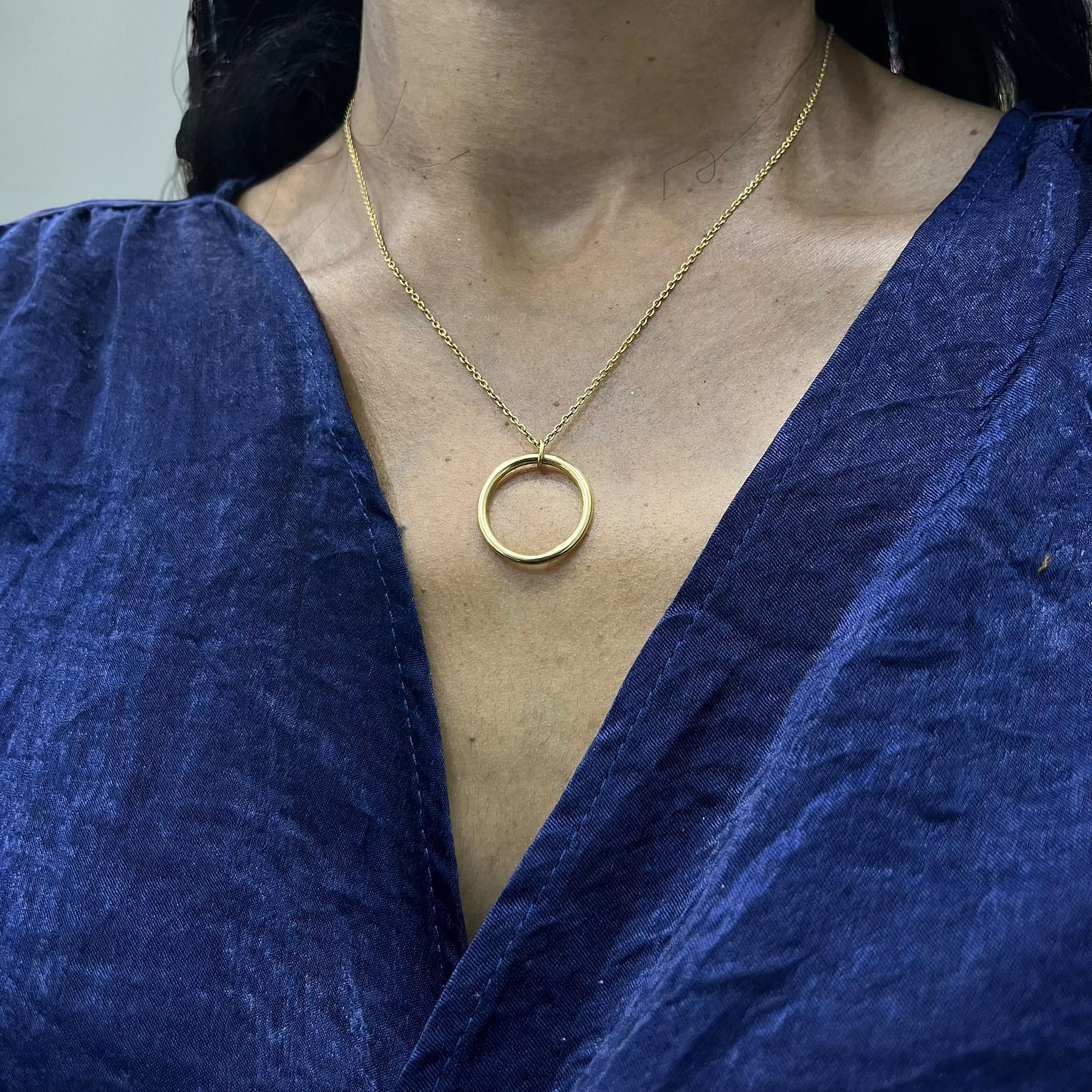 This is a minimalist brass chain necklace featuring a circular pendant,often referred to as an''eternity or karma''circle designed to symbolize unity.