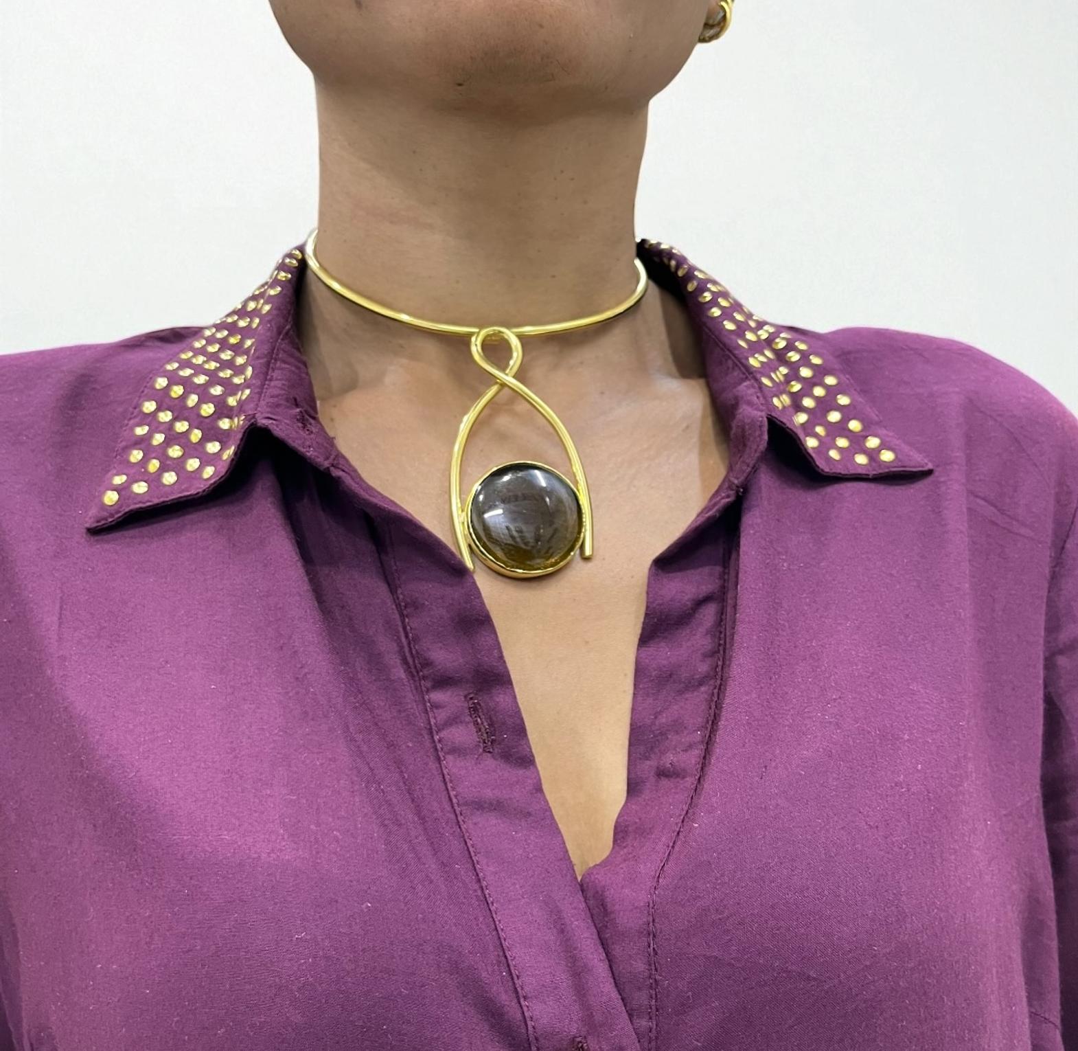 Part of our glass choker collection.A choker that has been beautifully handcrafted and a piece that is bound to make one look twice;made from brass and brown glass for the centrepiece.