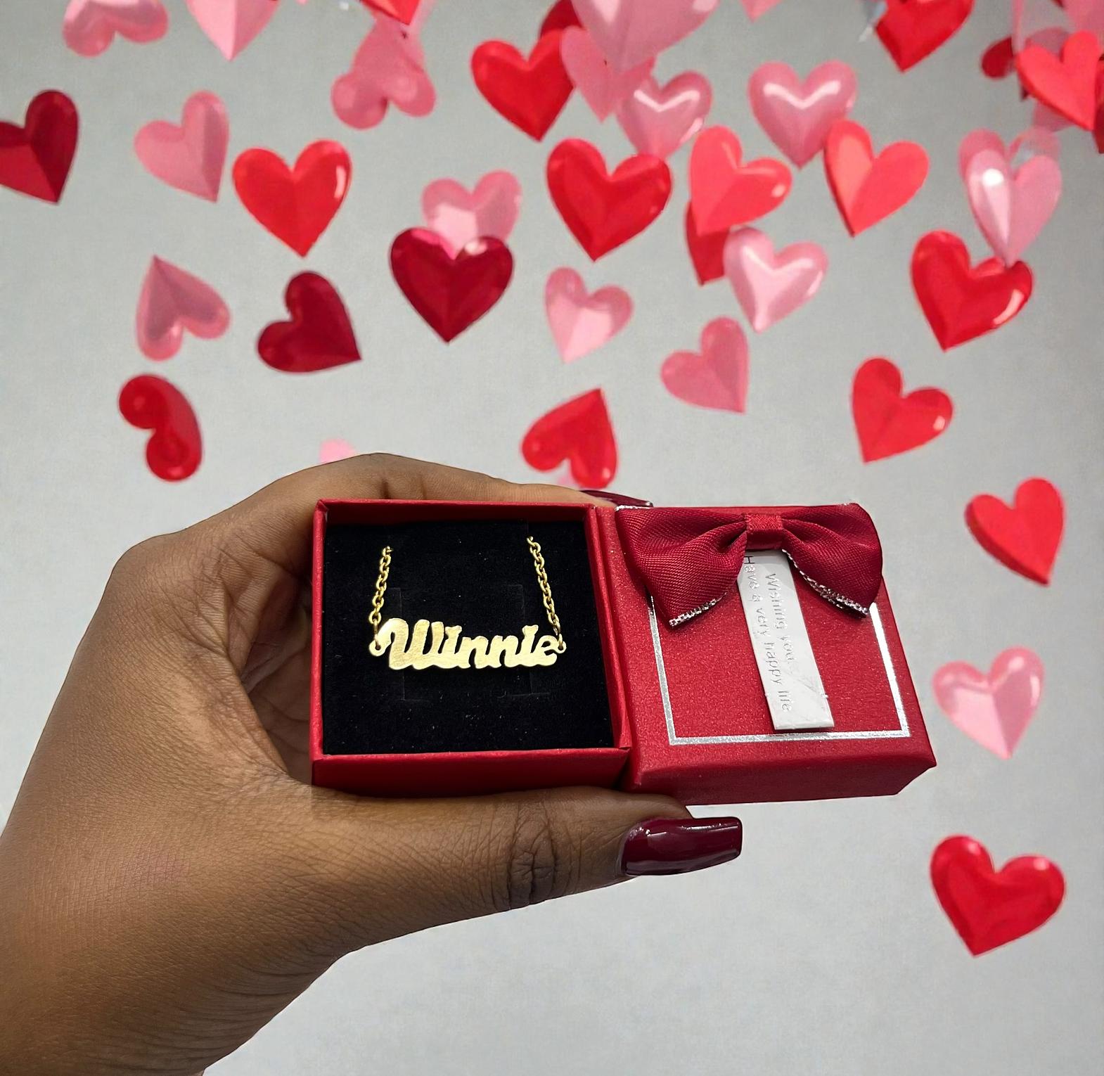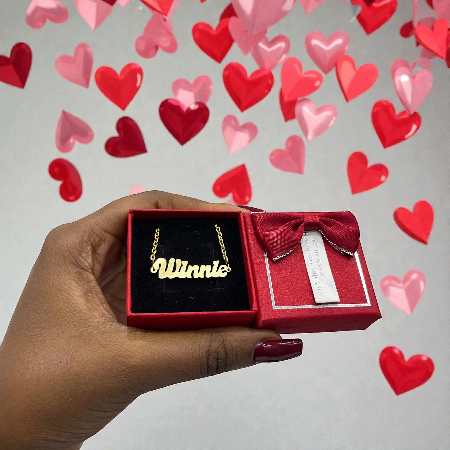 The image show a personalized name necklace,likely a custom jewelry piece,presented in a red gift box.