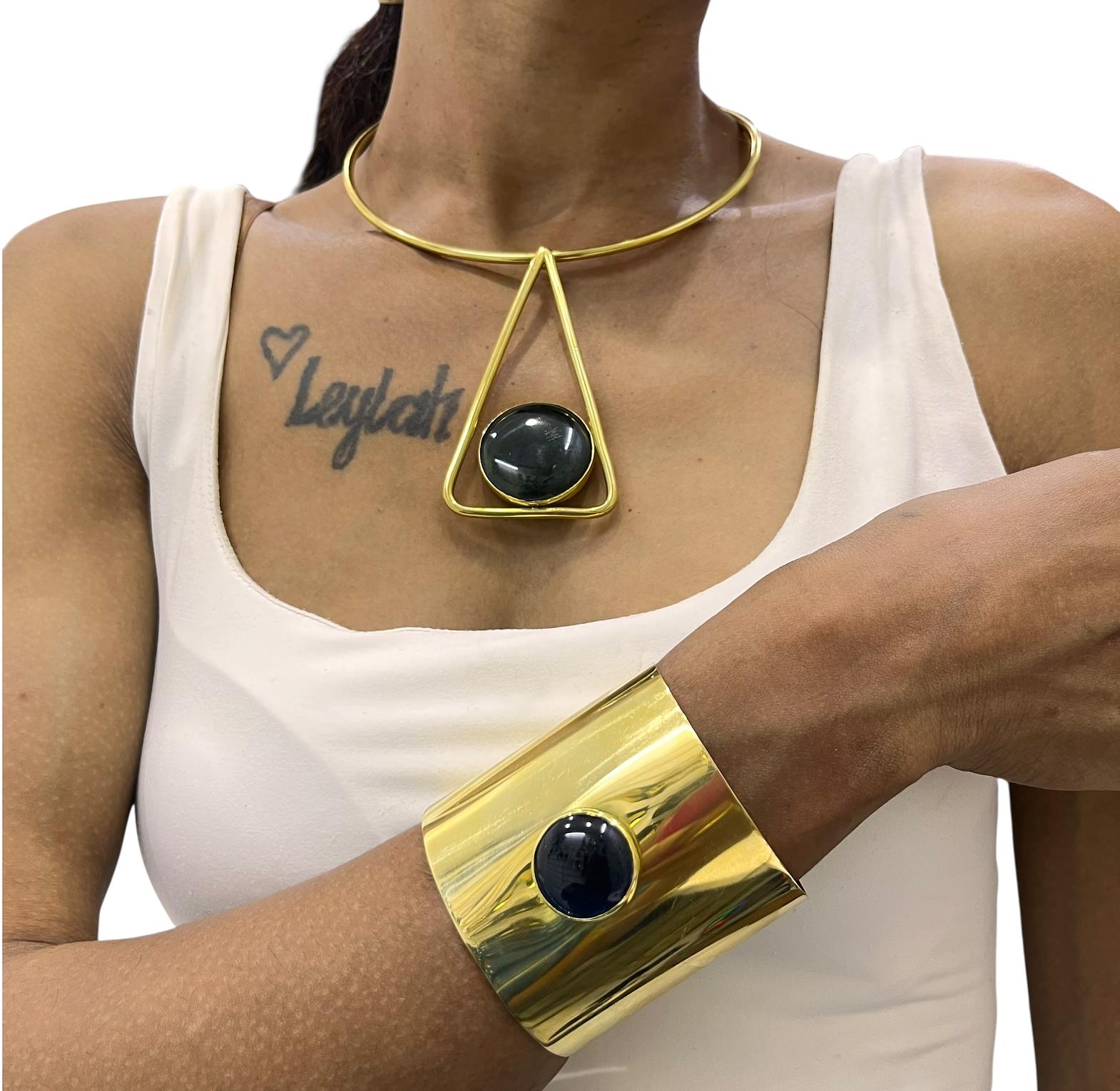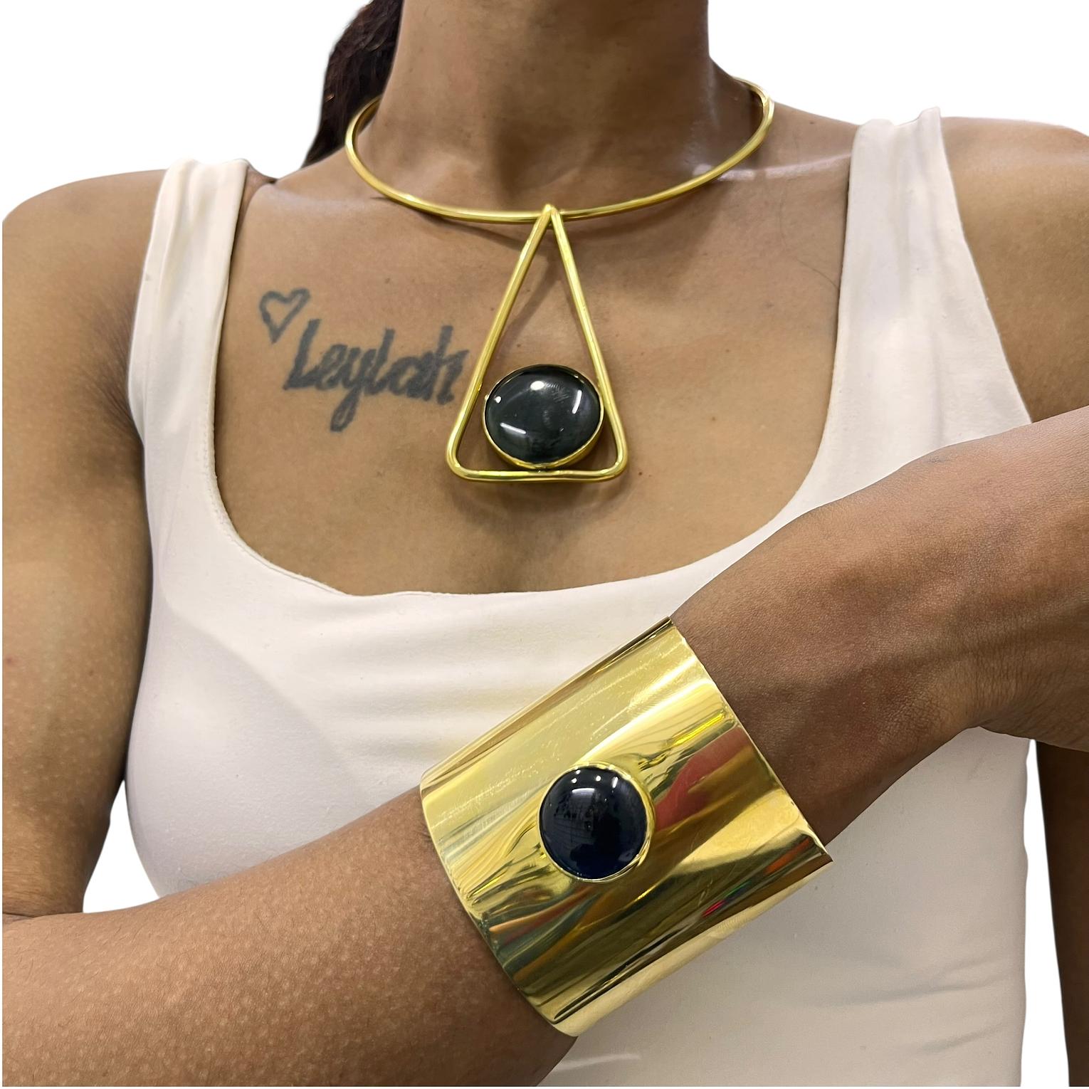 It typically consists of a bold collar style necklace and a matching wide cuff bracelet,both featuring a prominent inset store or resin centerpiece.