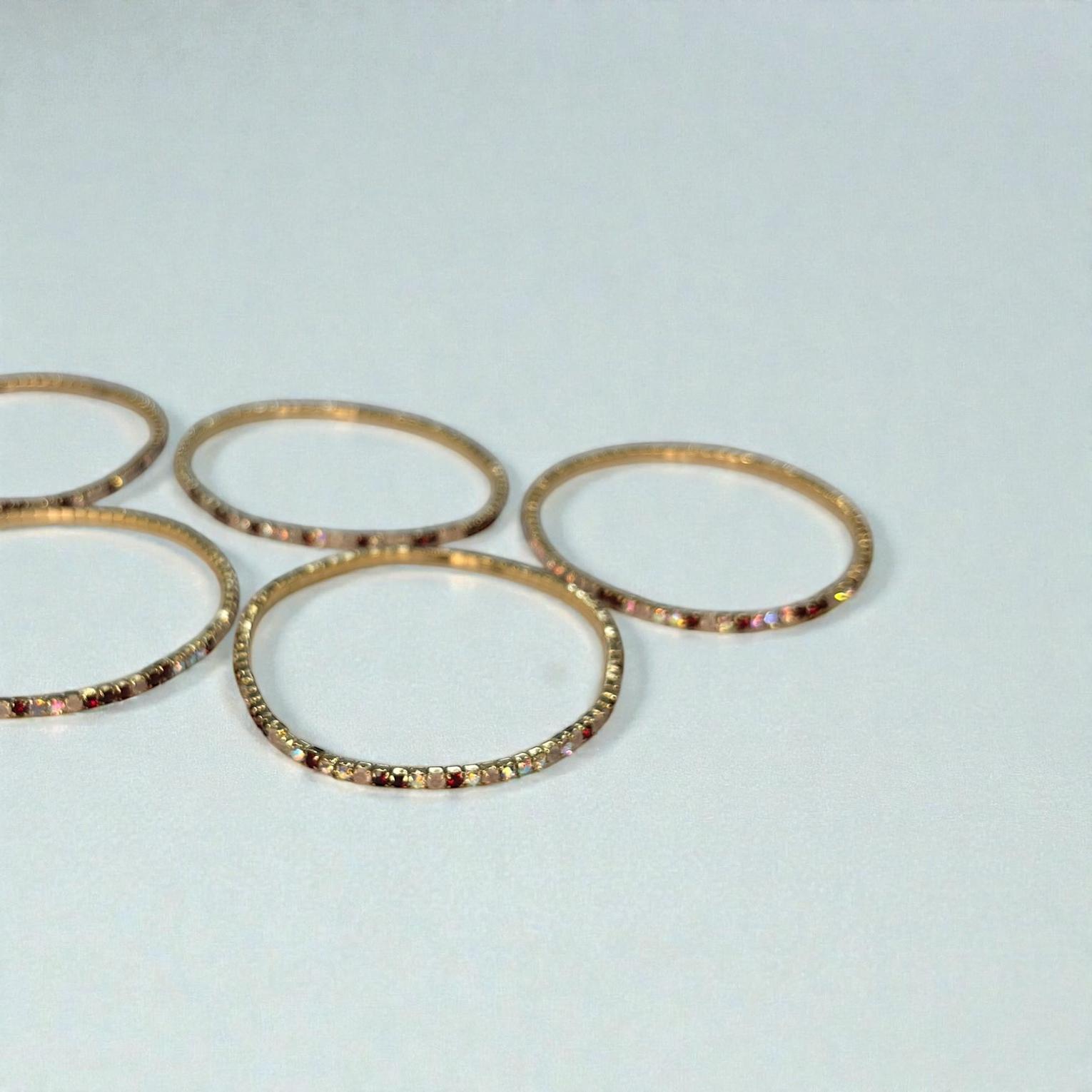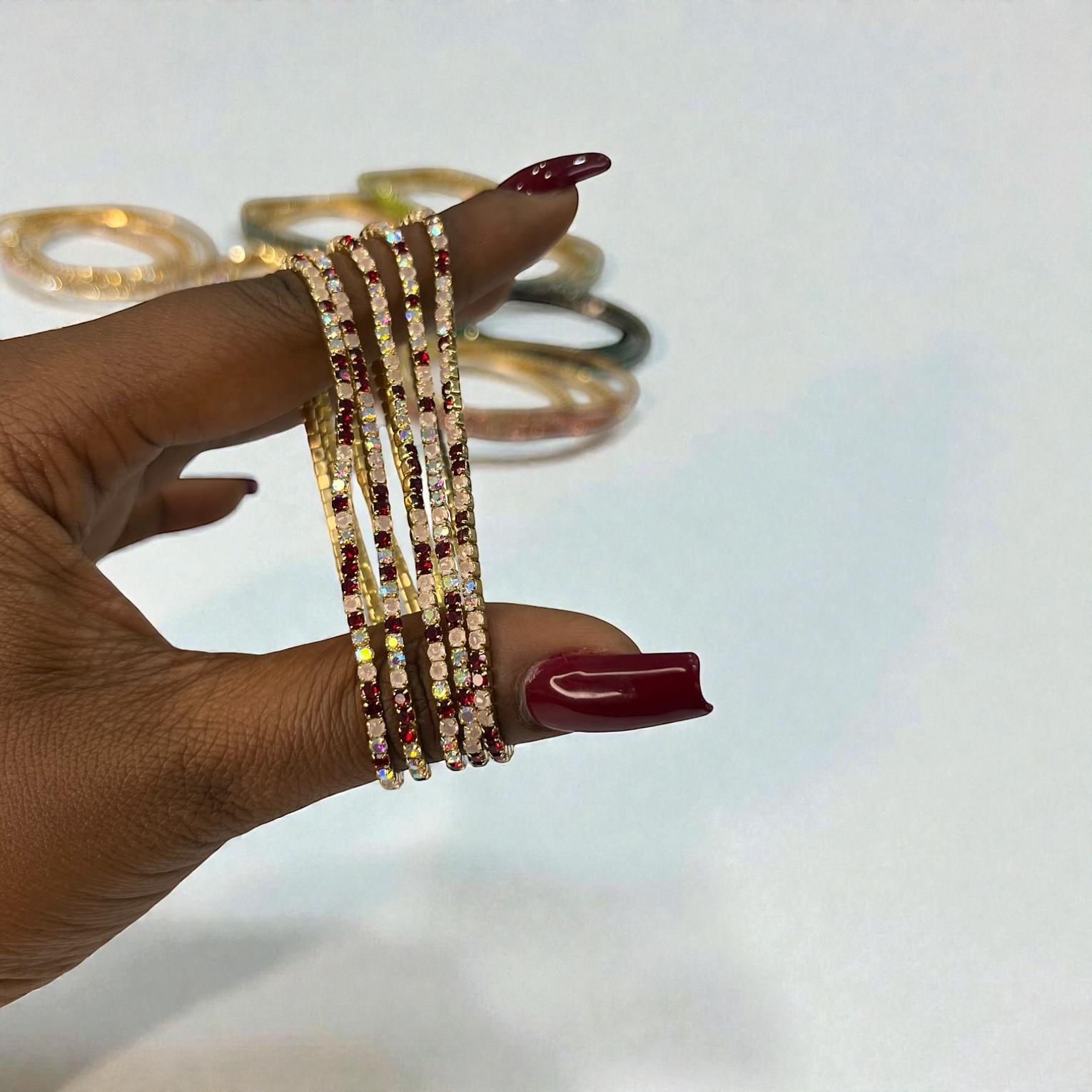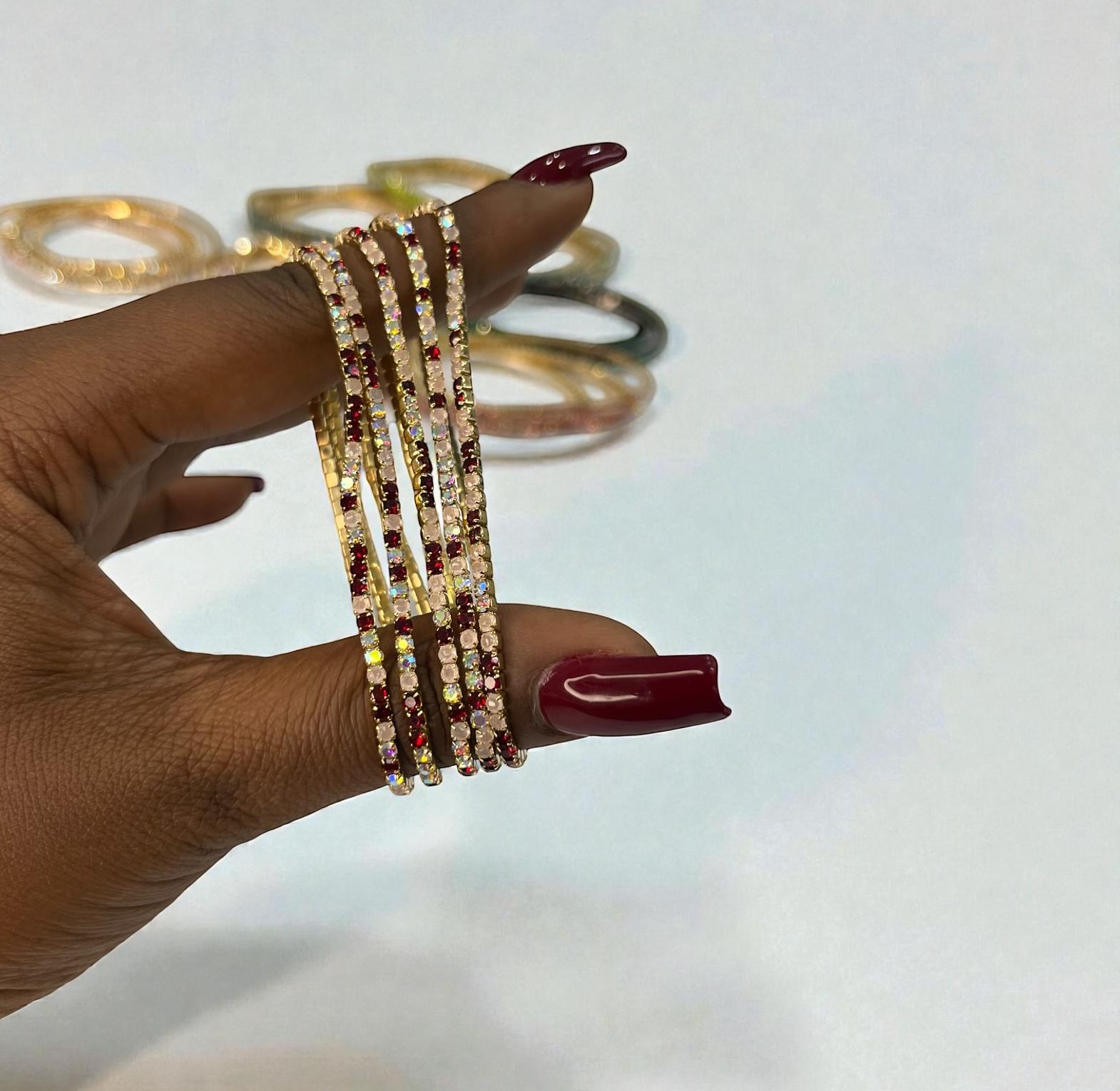 The specific set is known for its luxurious golden finish and 5 individual stretchy strands adorned with crystals in neutral tones like mauve,taupe,and clear.