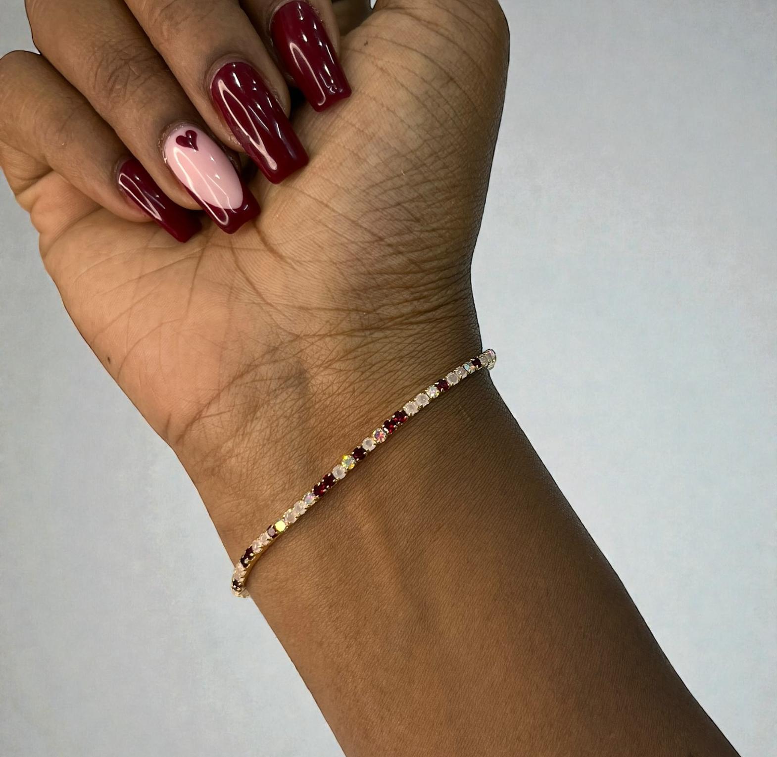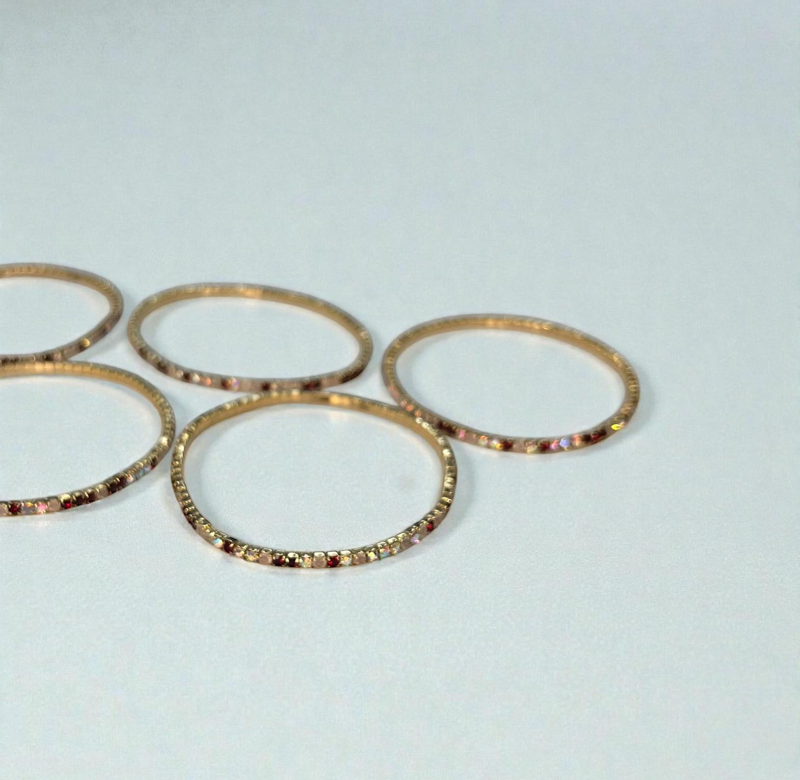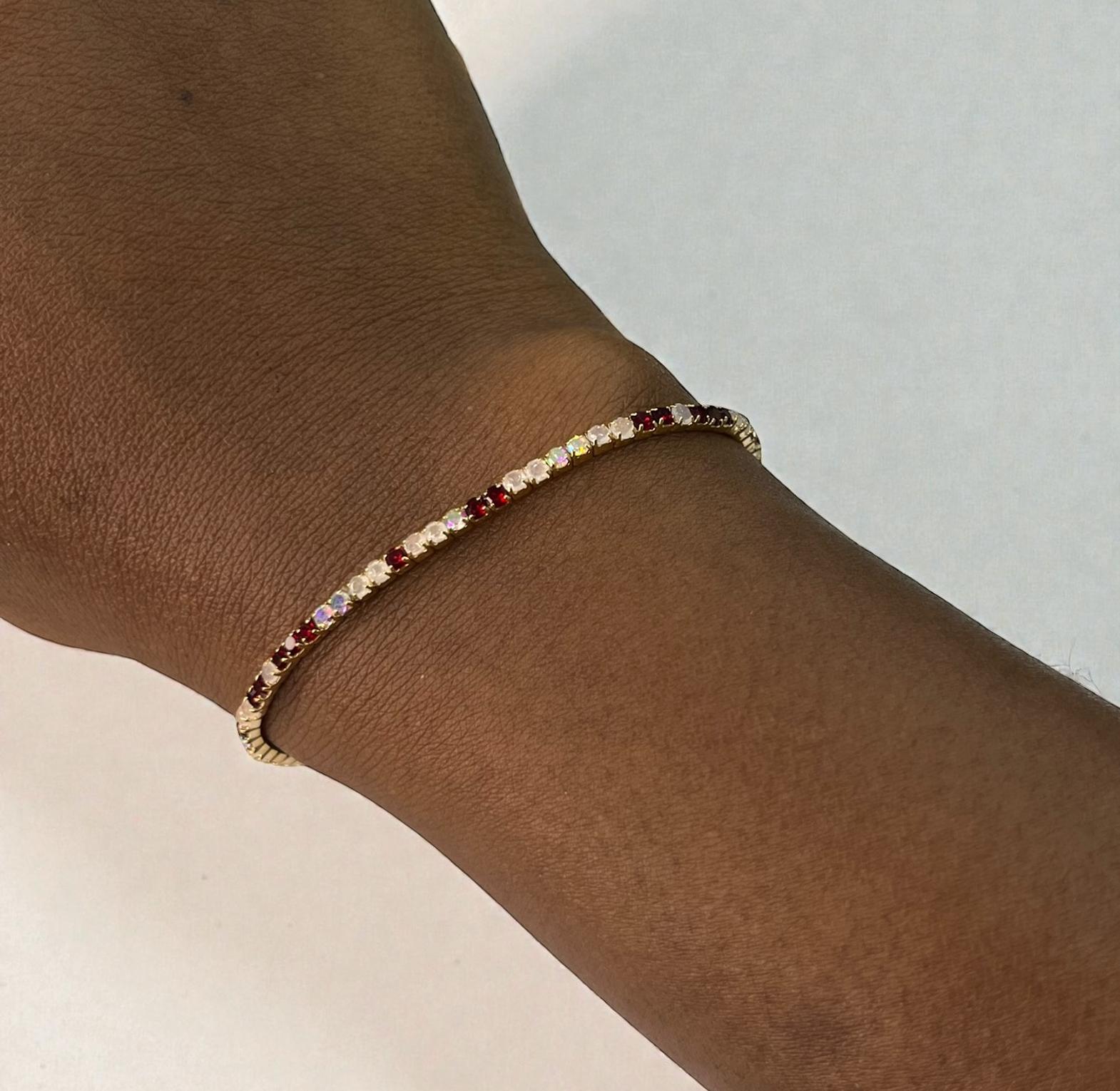 The specific set is known for its luxurious golden finish and 5 individual stretchy strands adorned with crystals in neutral tones like mauve,taupe,and clear.