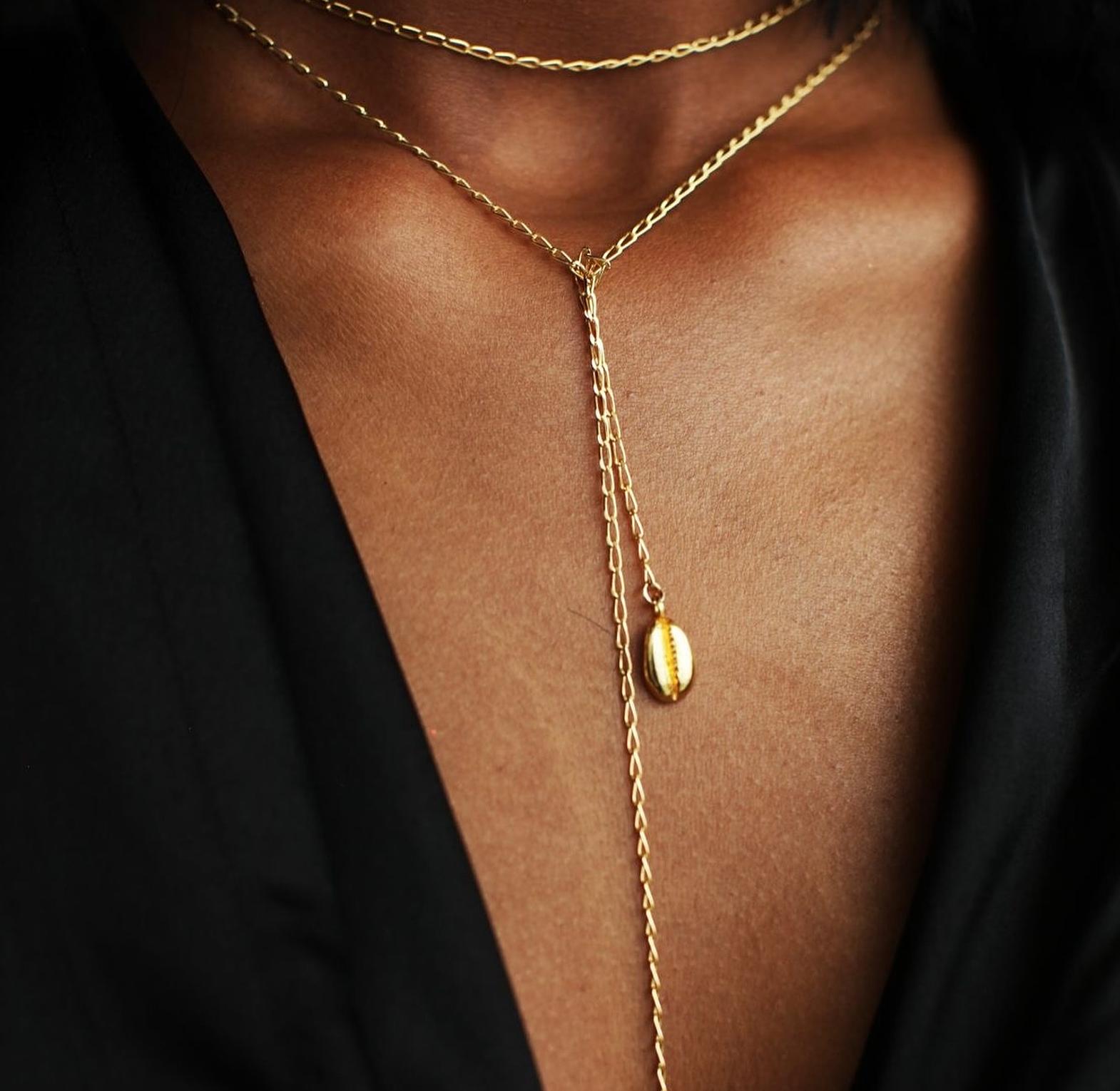 An elegant brass necklace featuring a timeless cowrie shell charm, celebrating natural beauty.