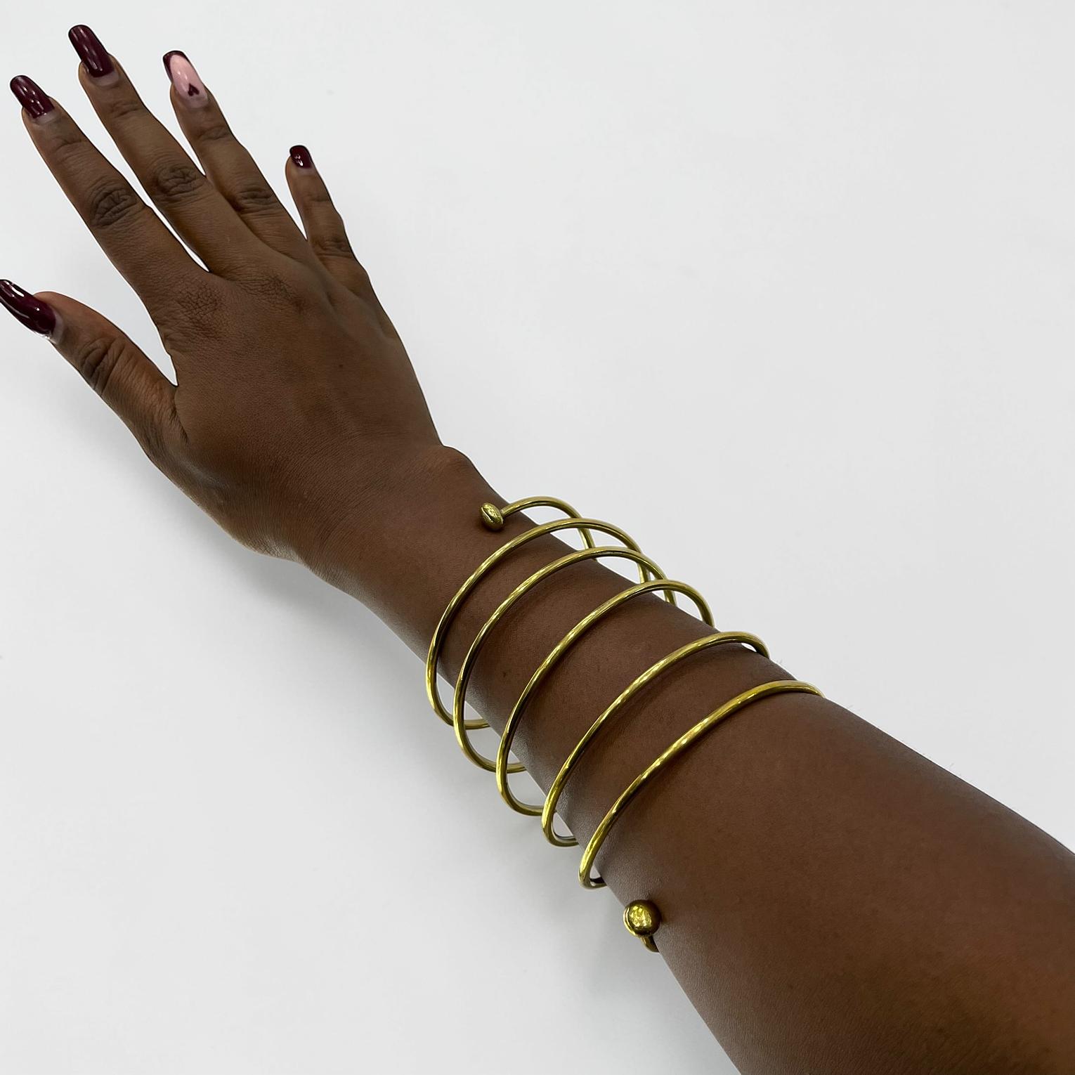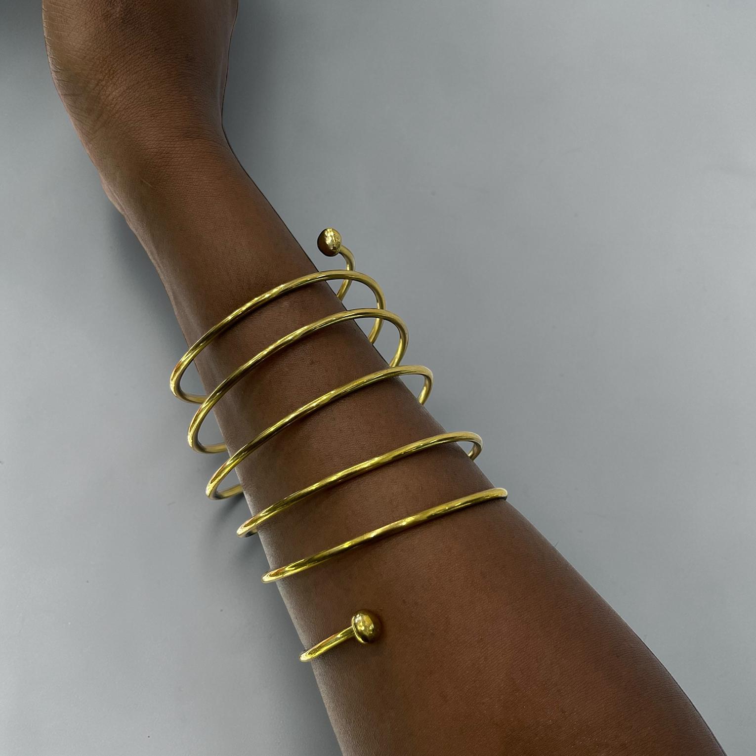 The item in the image is a multi-layered gold-tone spiral arm cuff or bangle bracelete.Its unique design makes it a striking accessory.