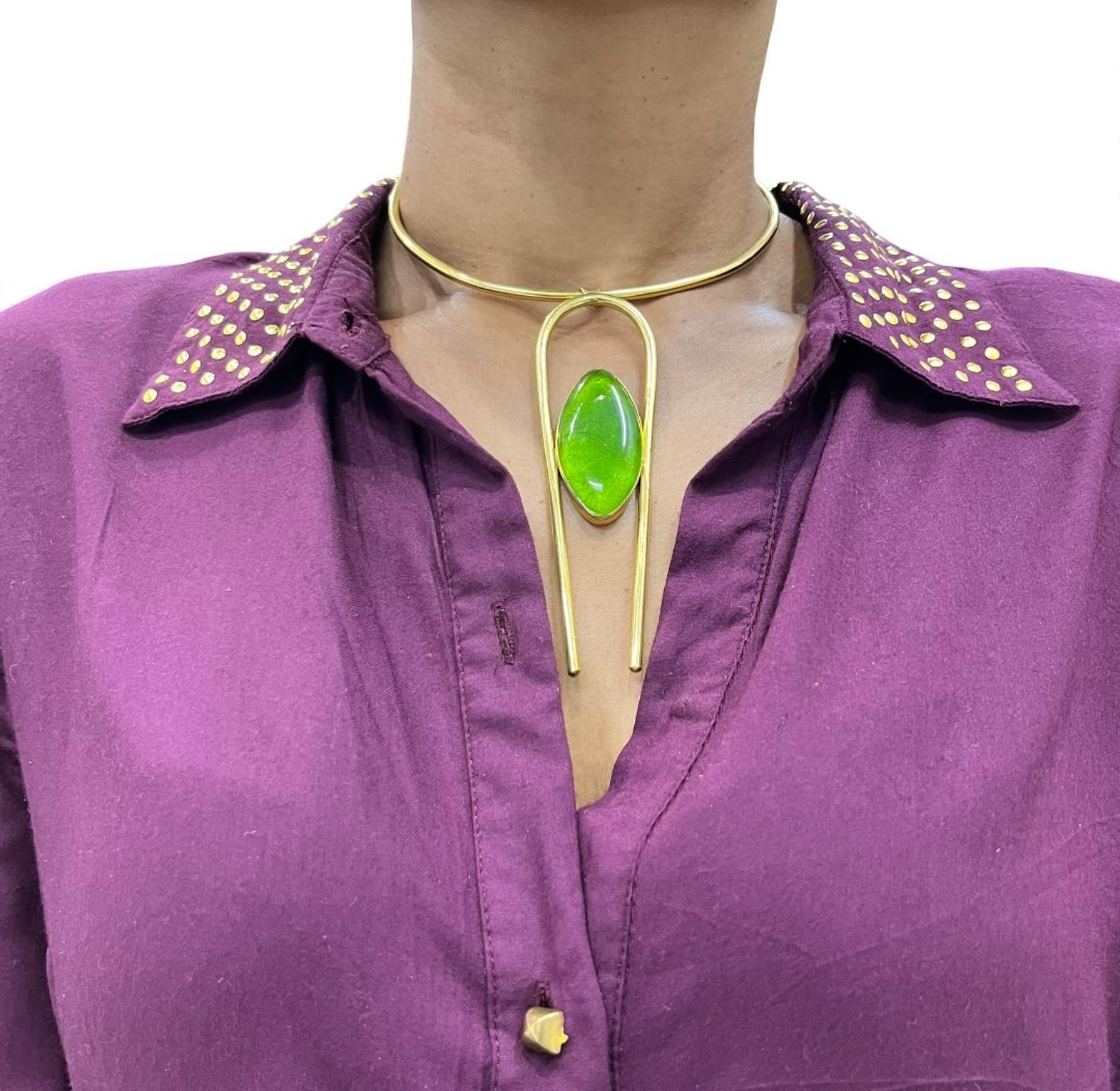 These stunning Stone brass choker are a perfect blend of simplicity and bold design,featuring a plain round brass band that wraps elegantly around the neck complimented by a colorful beaded pendant.